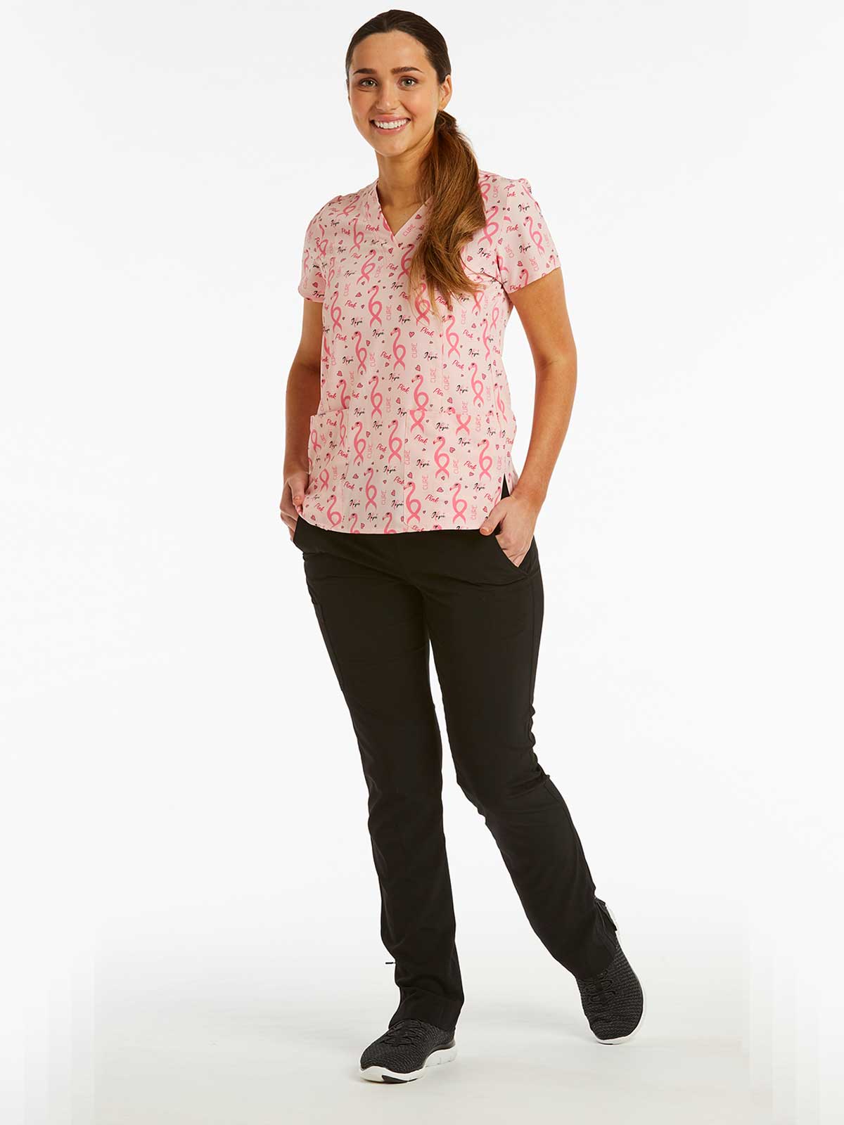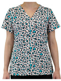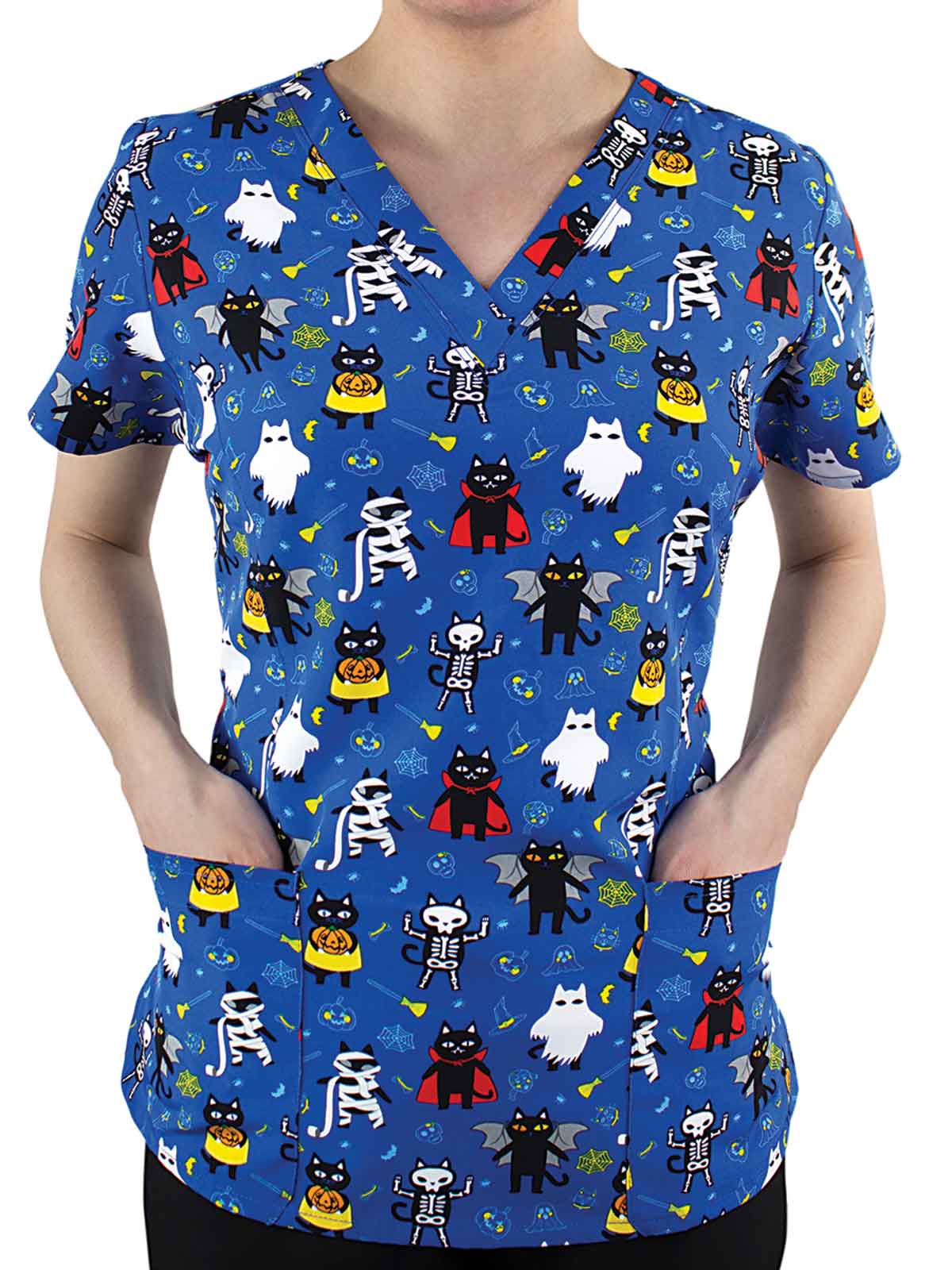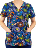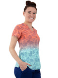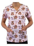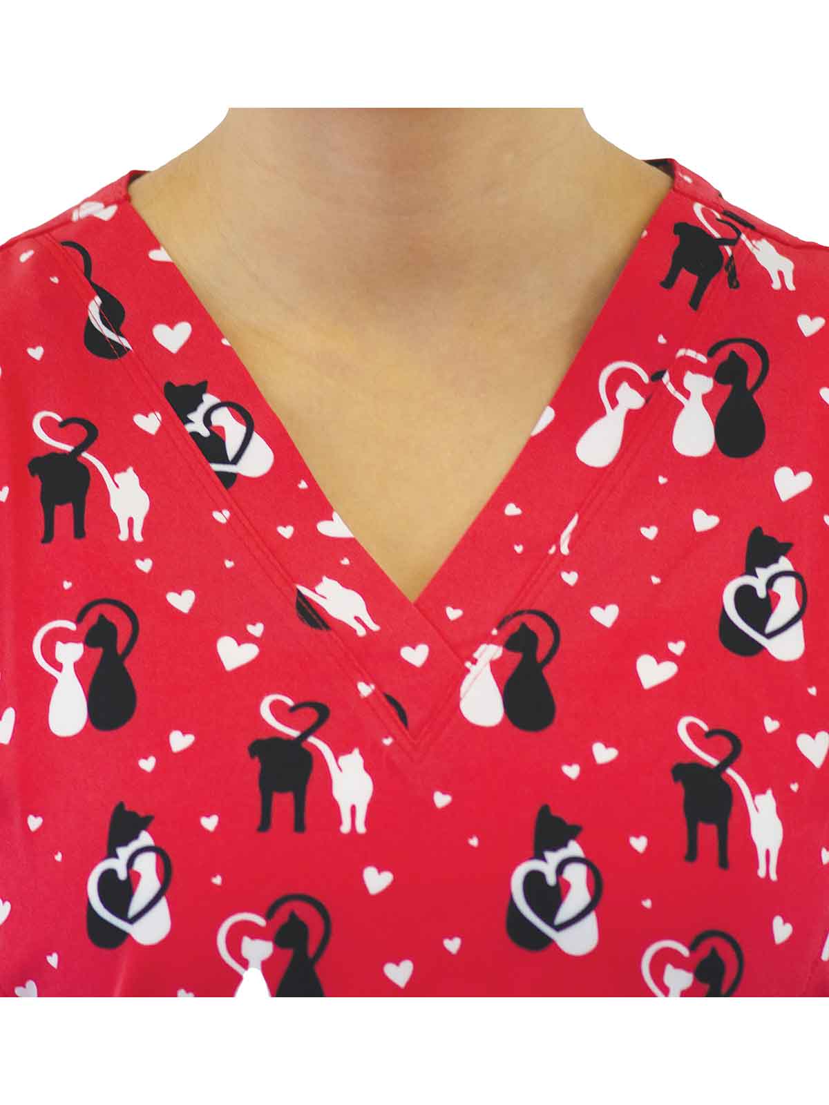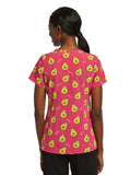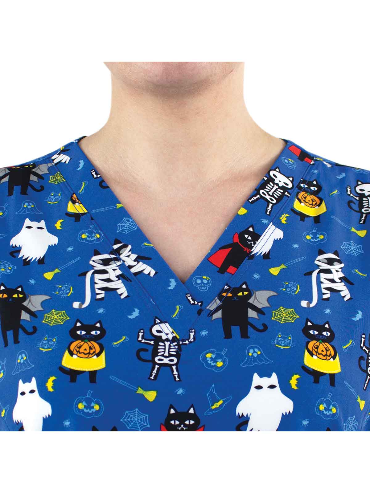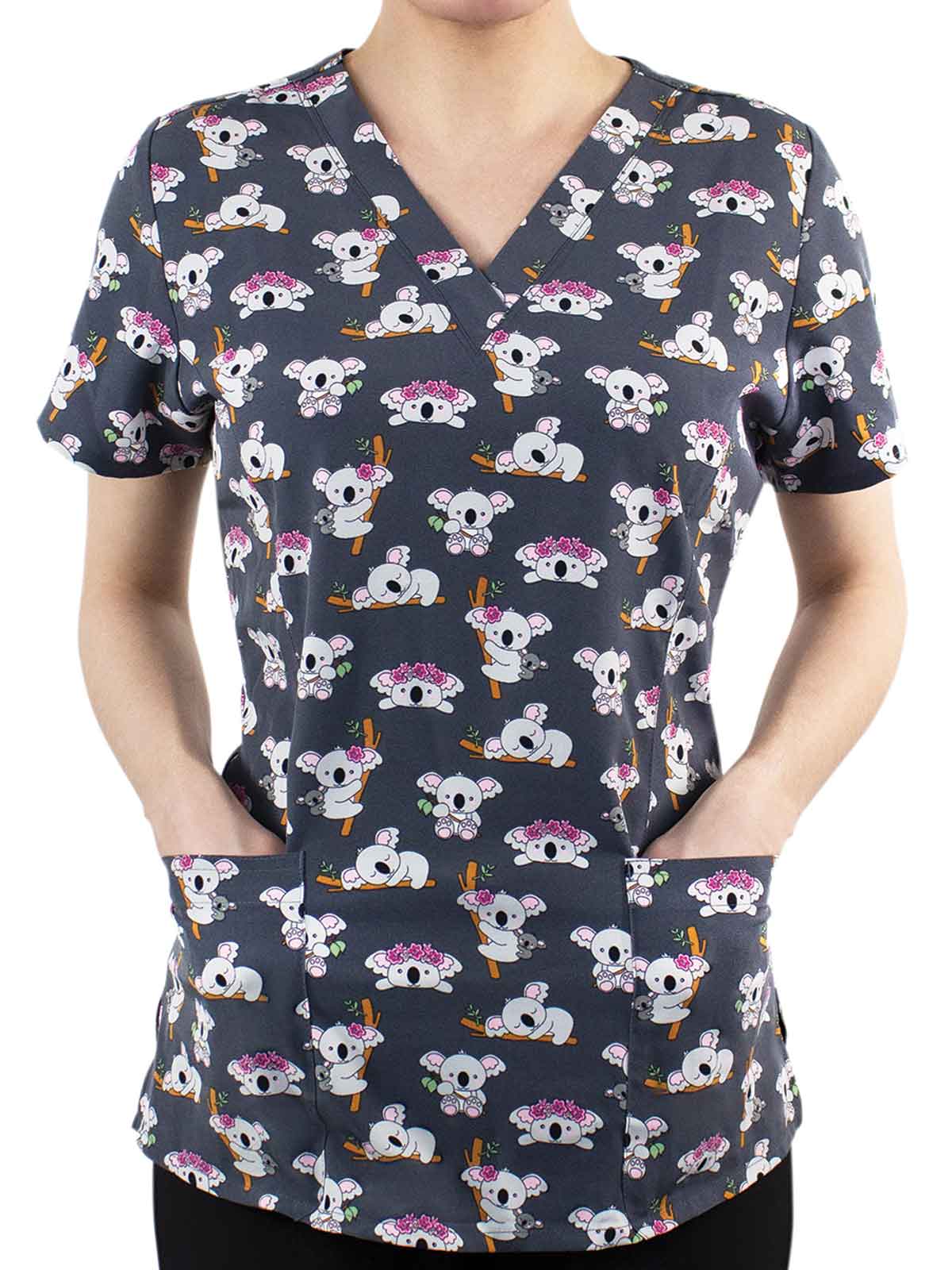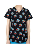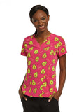 "*Printed curved v-neck top *Front princess seams and back darts for added style and shape *Two slant patch pockets with inner cell pocket *Solid contrast at back facing *Side vents" Banded v-neckline Short sleeves Front princess seaming Back shaping darts...