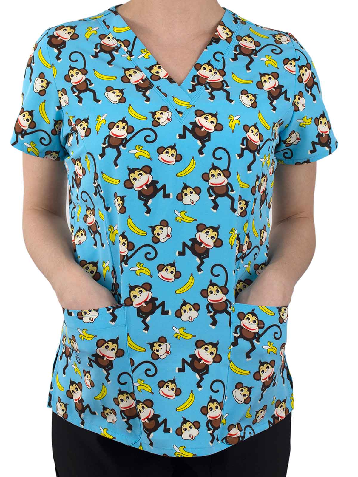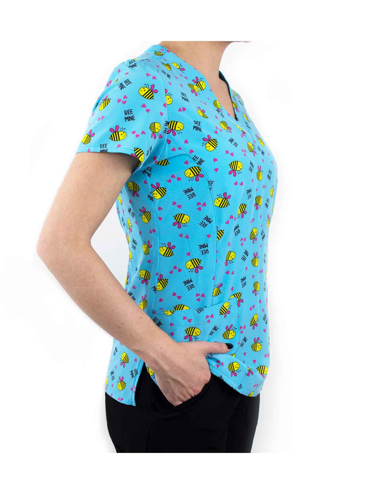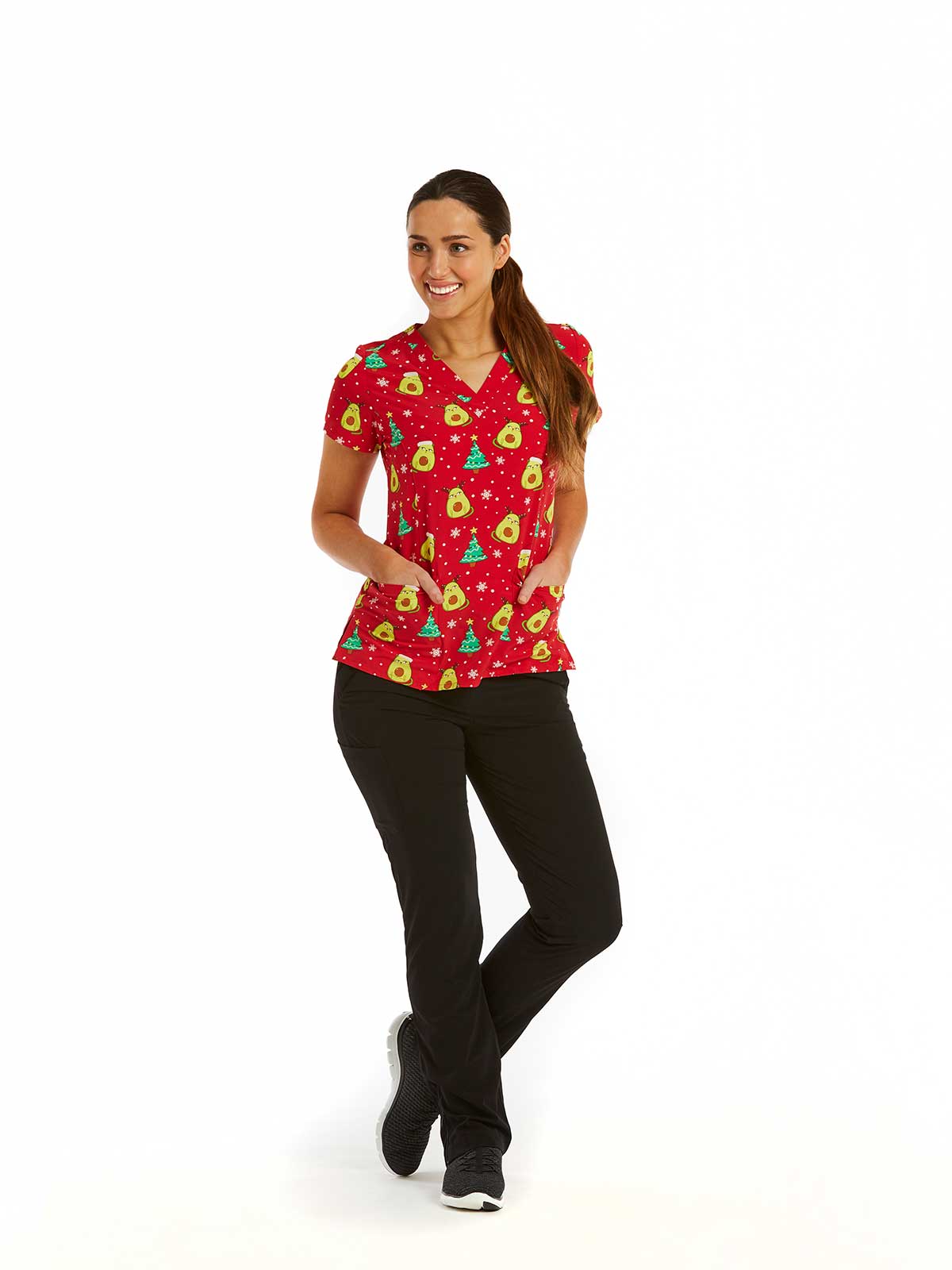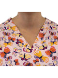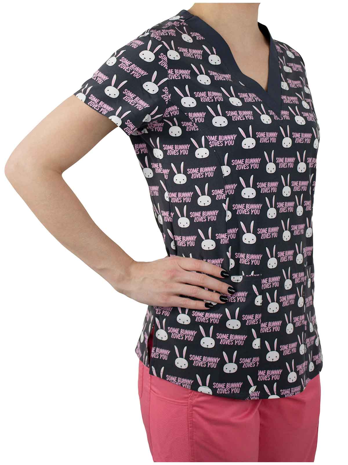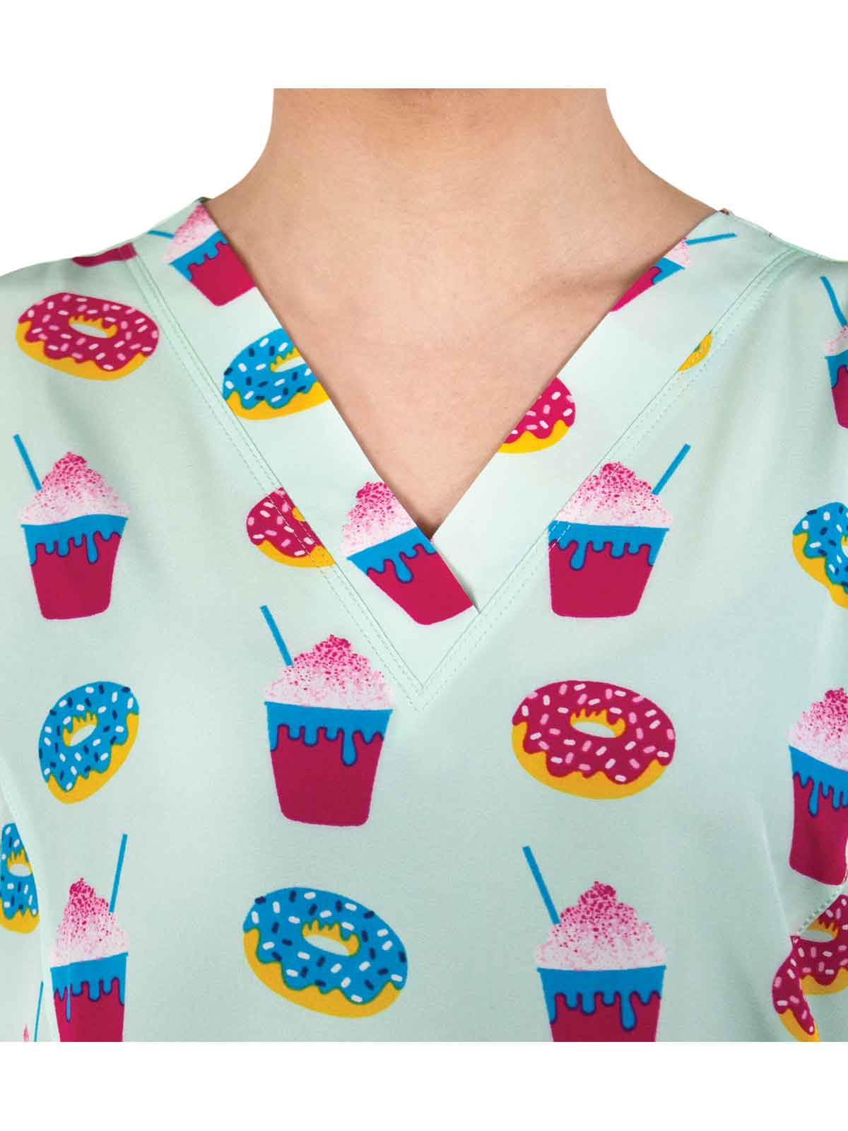 "*Printed curved v-neck top *Front princess seams and back darts for added style and shape *Two slant patch pockets with inner cell pocket *Solid contrast at back facing *Side vents" Banded v-neckline Short sleeves Front princess seaming Back shaping darts...