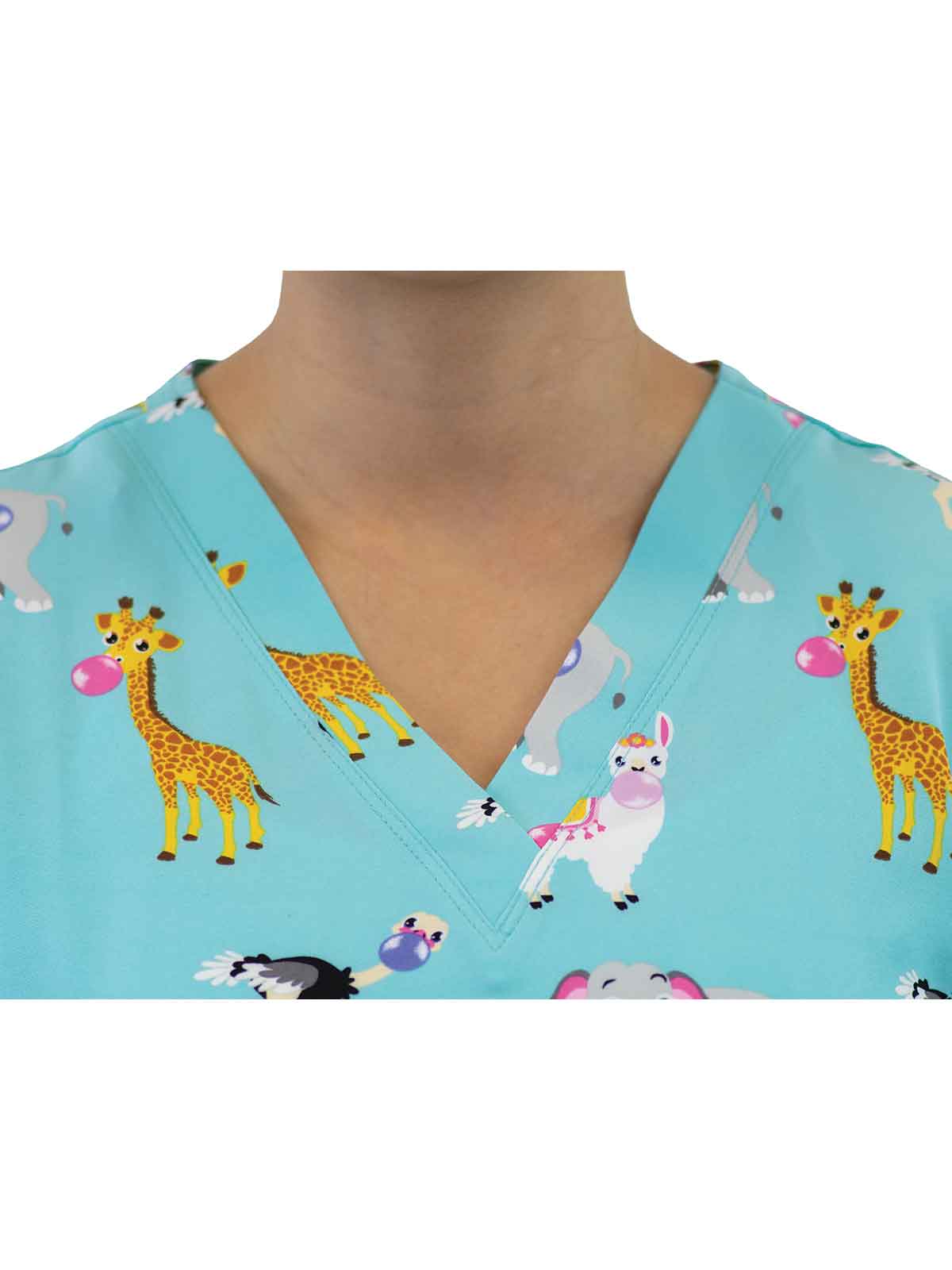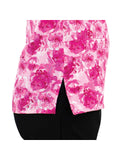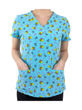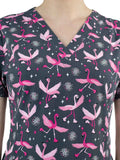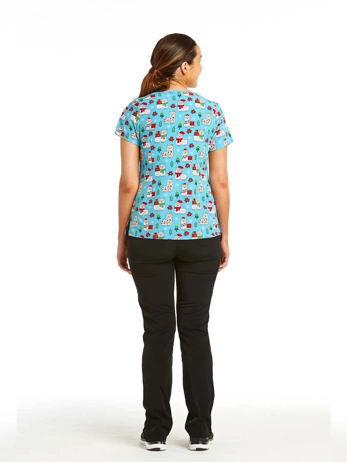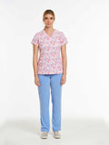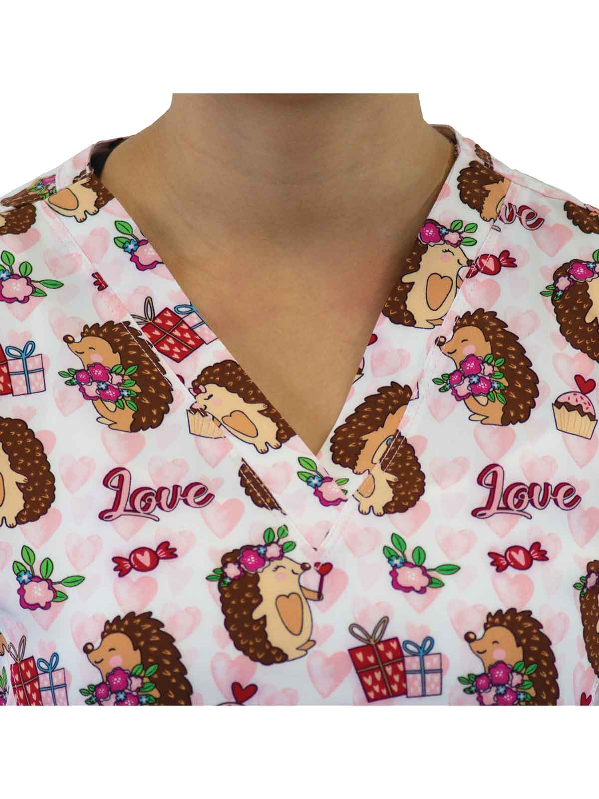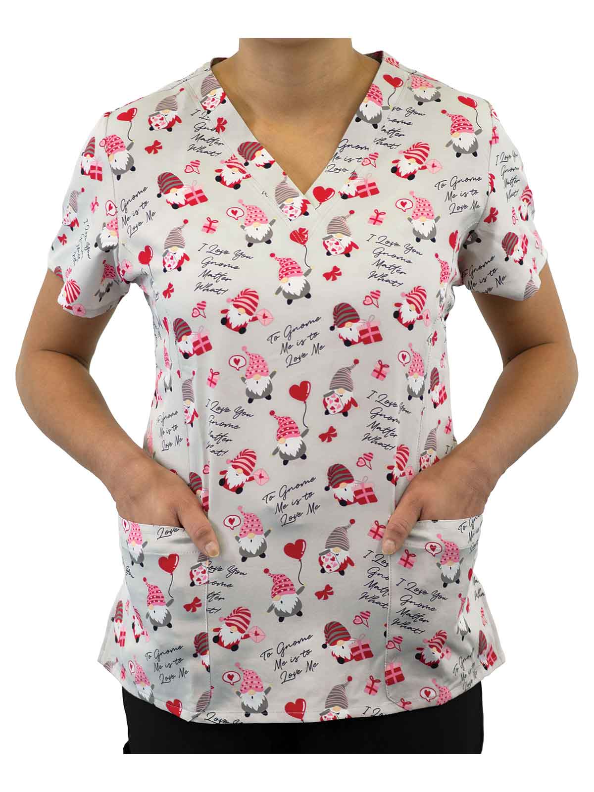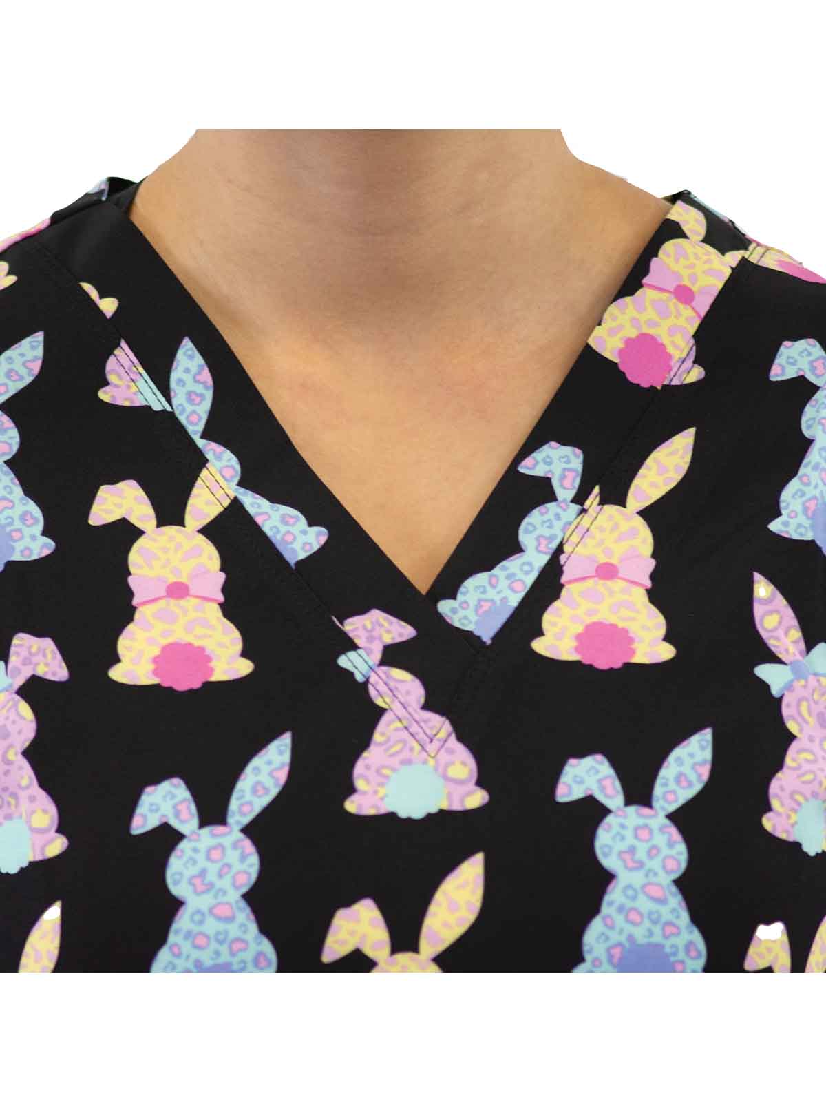 "*Printed curved v-neck top *Front princess seams and back darts for added style and shape *Two slant patch pockets with inner cell pocket *Solid contrast at back facing *Side vents" Banded v-neckline Short sleeves Front princess seaming Back shaping darts...