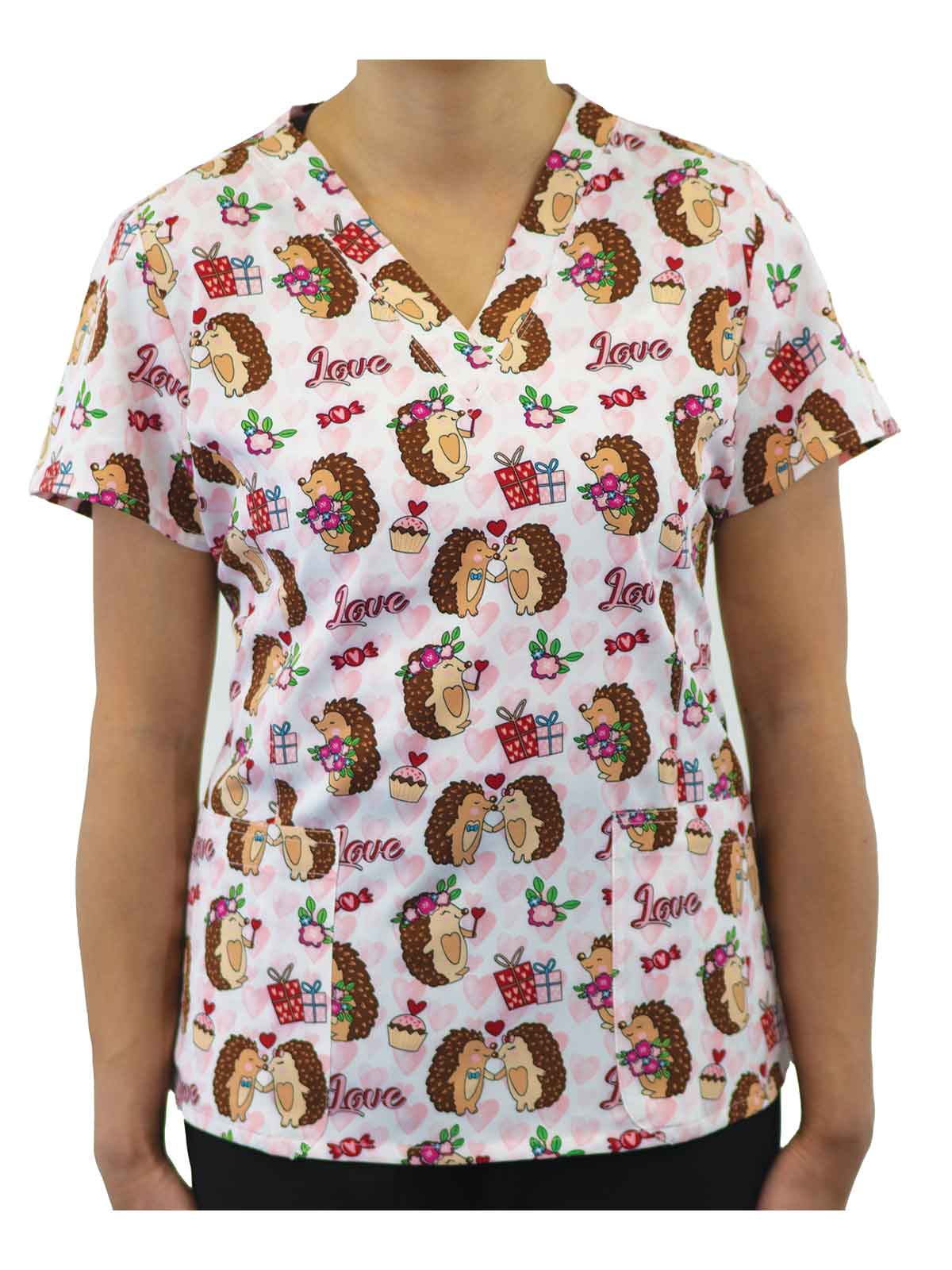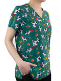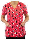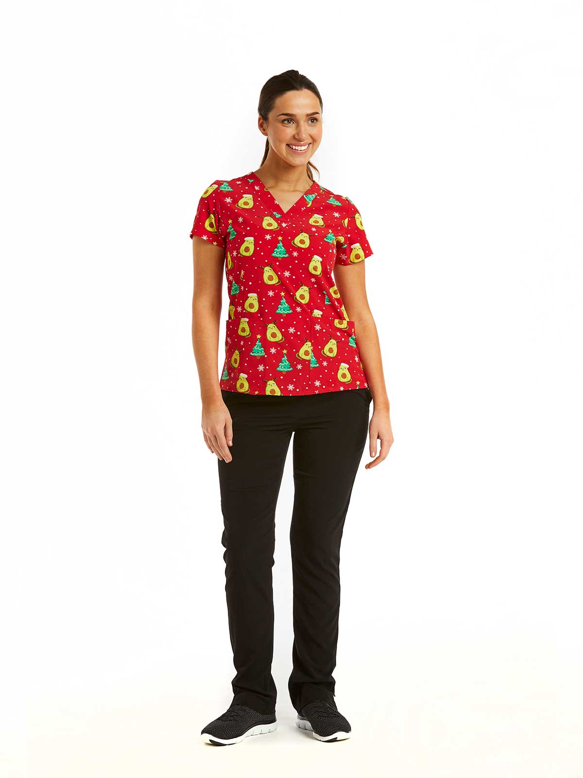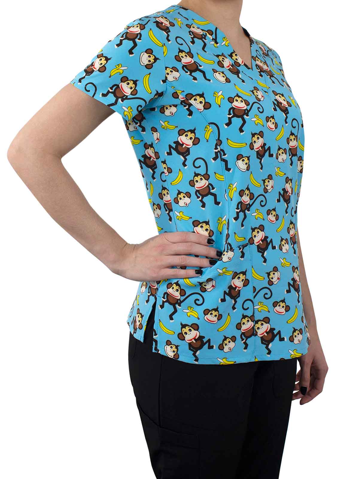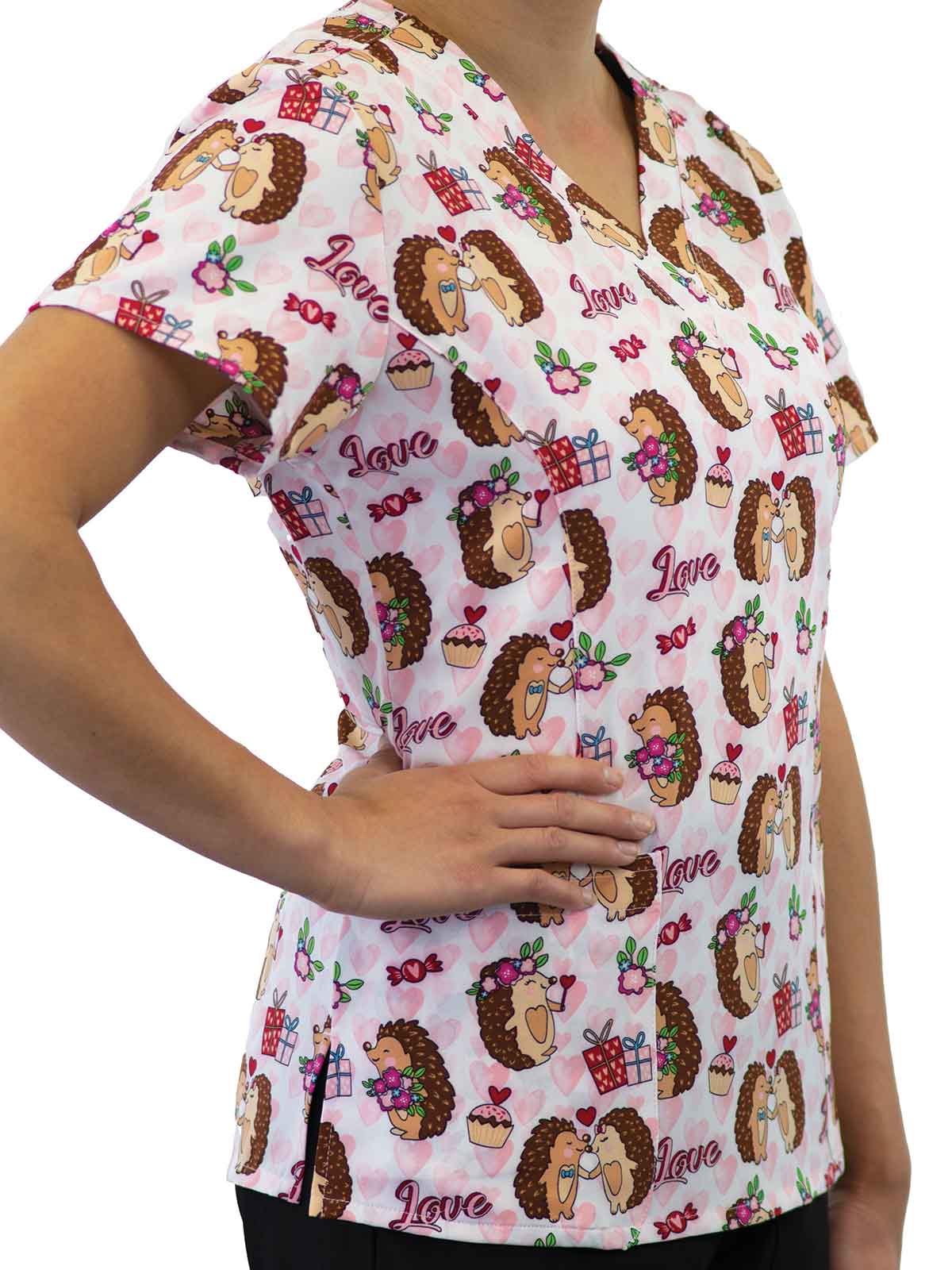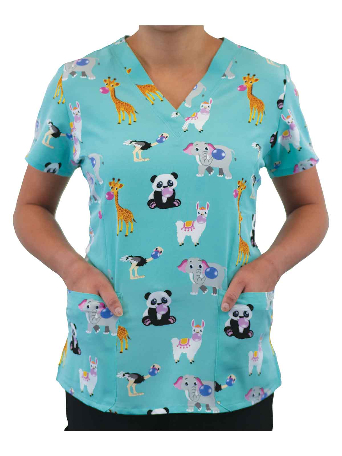 "*Printed curved v-neck top *Front princess seams and back darts for added style and shape *Two slant patch pockets with inner cell pocket *Solid contrast at back facing *Side vents" Banded v-neckline Short sleeves Front princess seaming Back shaping darts...