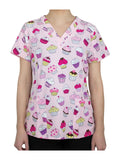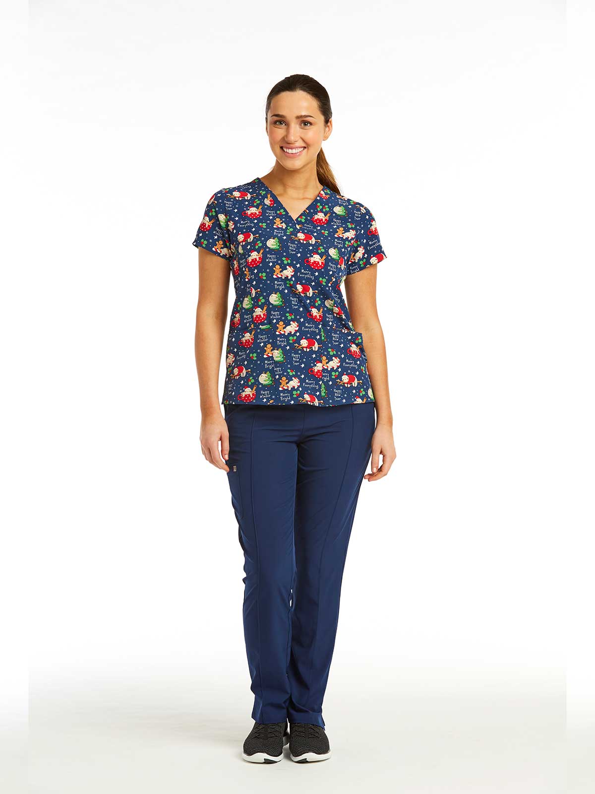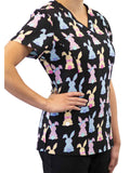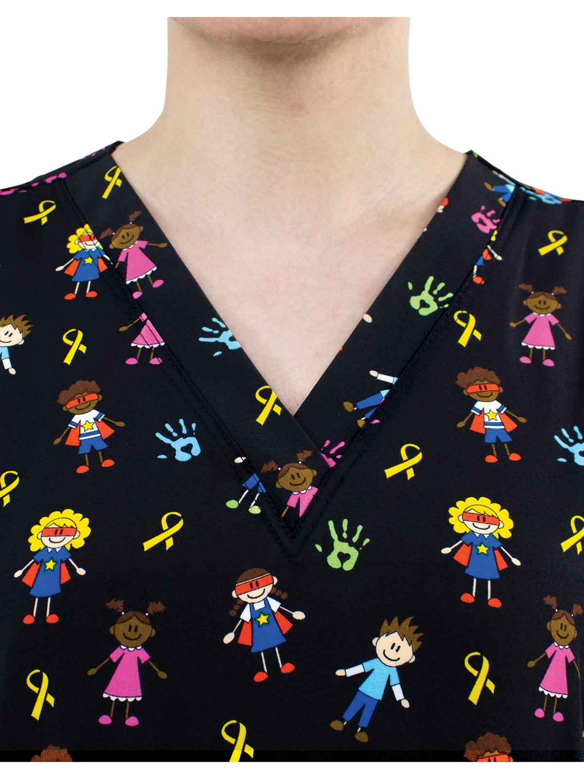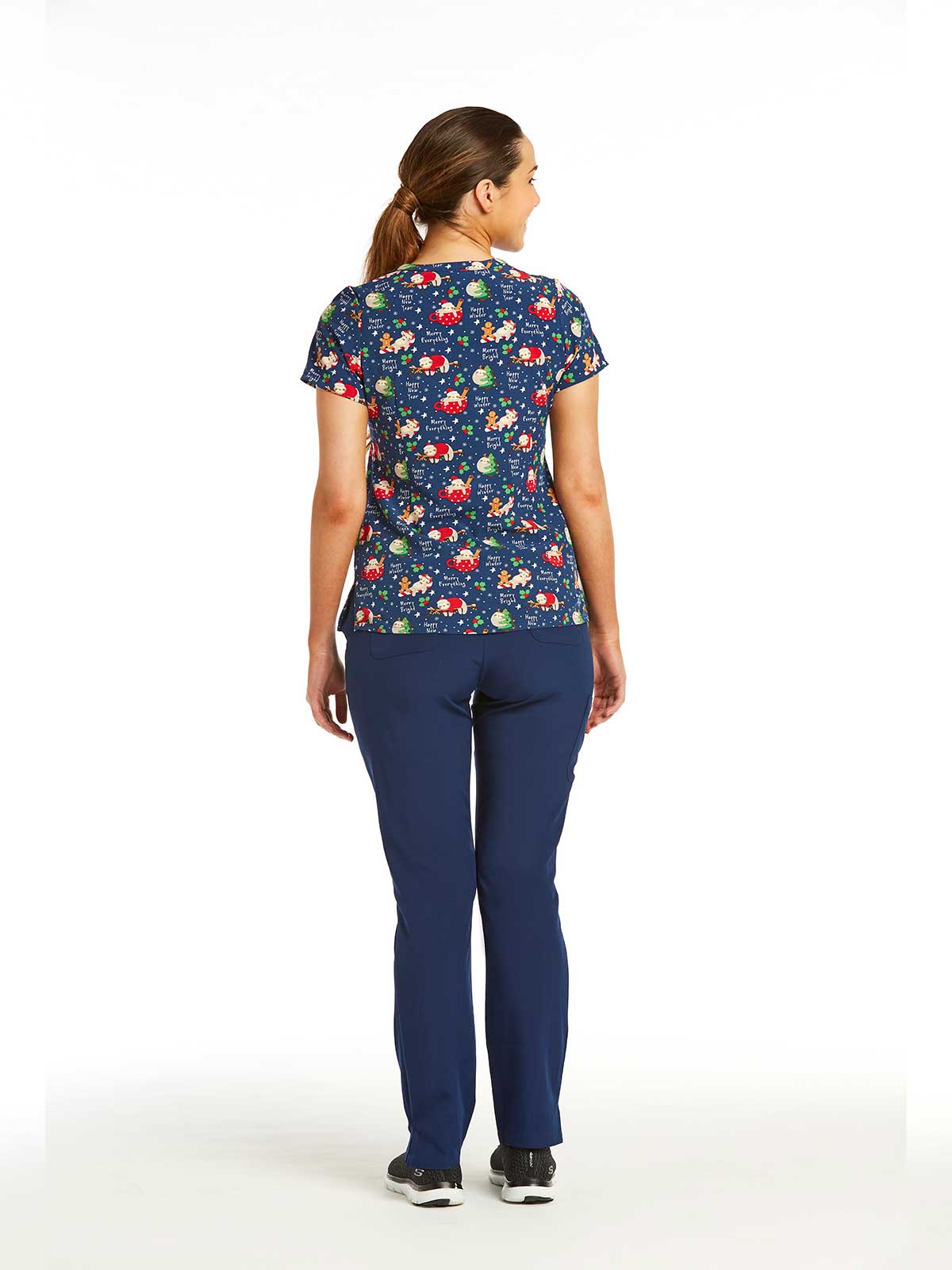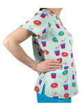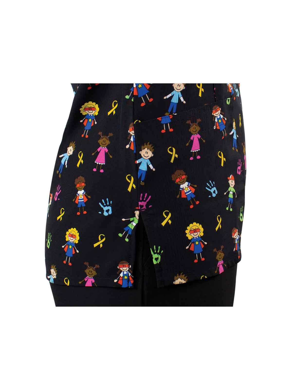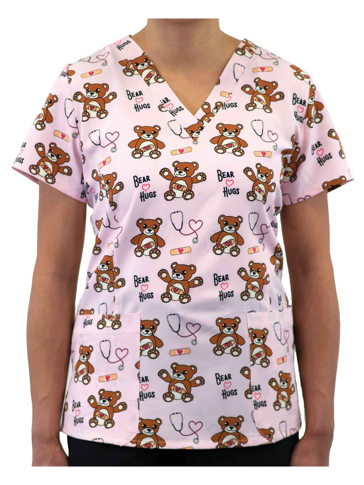 "*Printed curved v-neck top *Front princess seams and back darts for added style and shape *Two slant patch pockets with inner cell pocket *Solid contrast at back facing *Side vents" Banded v-neckline Short sleeves Front princess seaming Back shaping darts...