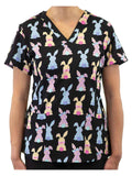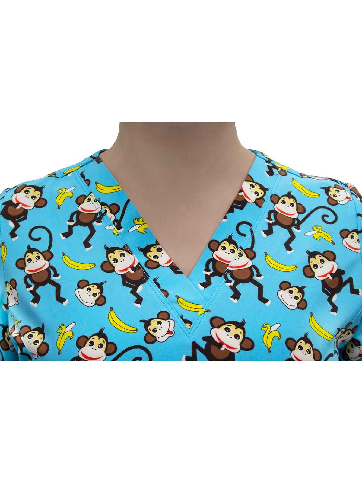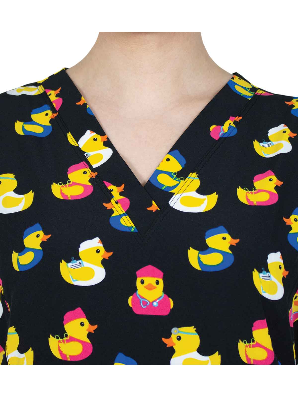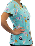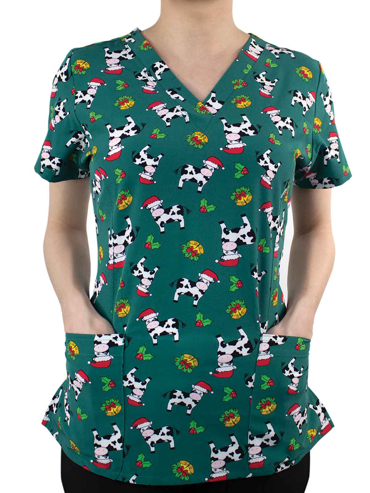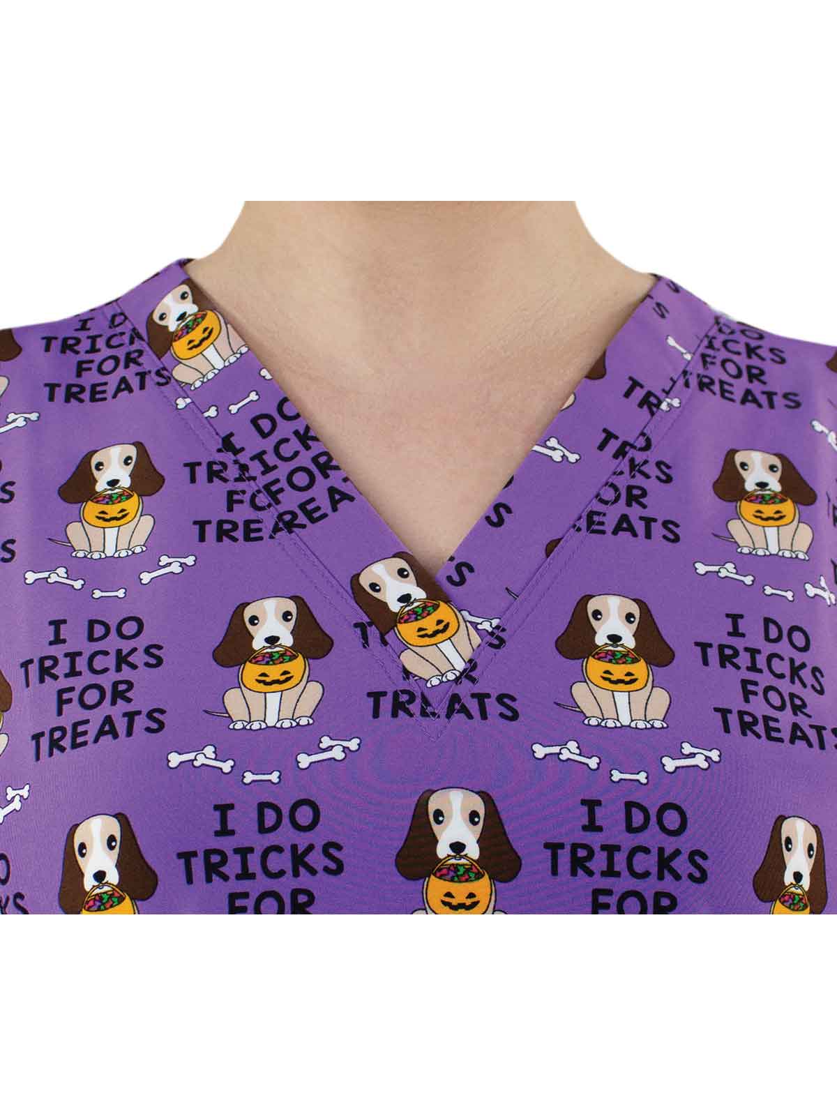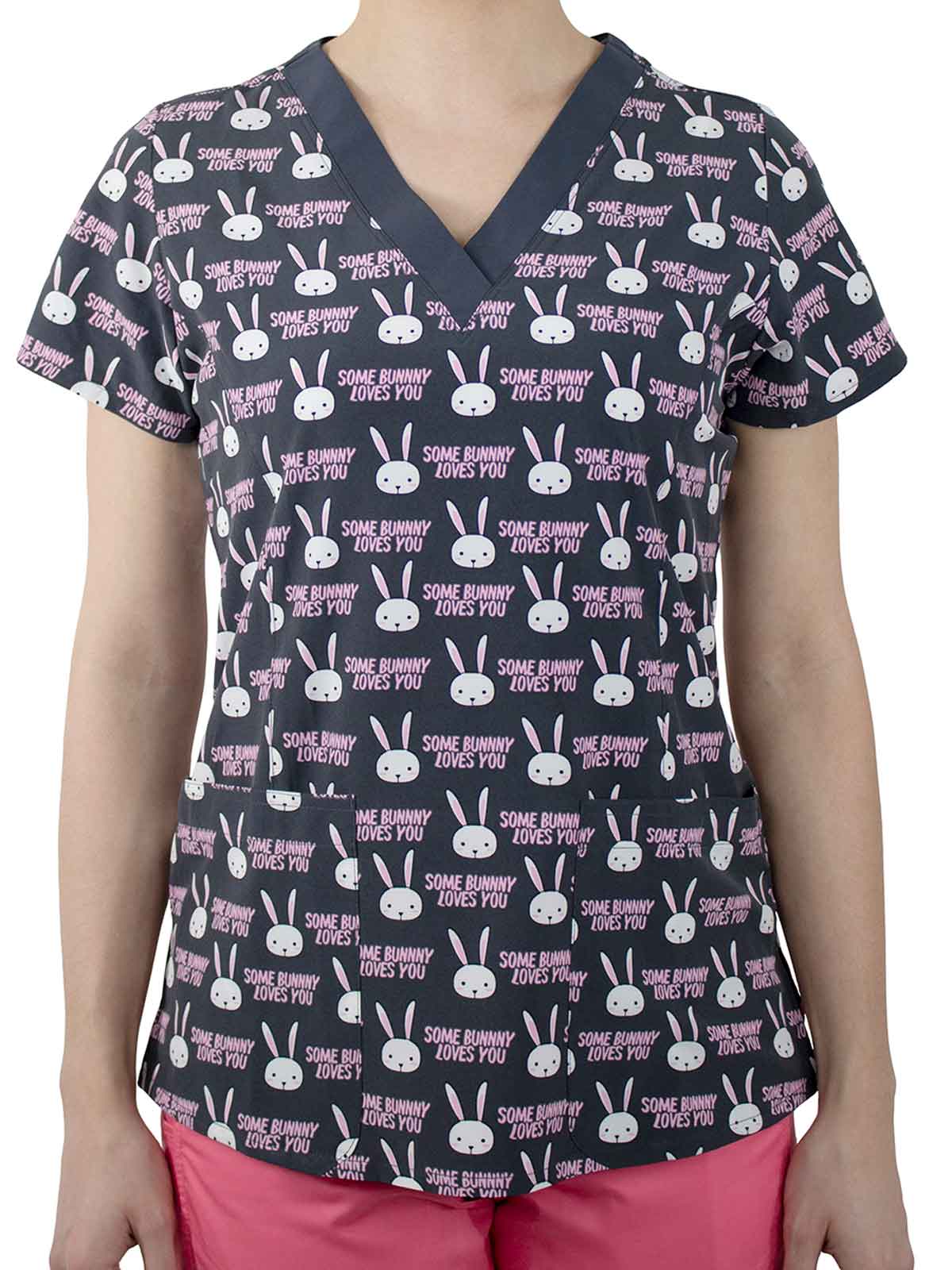 "*Printed curved v-neck top *Front princess seams and back darts for added style and shape *Two slant patch pockets with inner cell pocket *Solid contrast at back facing *Side vents" Banded v-neckline Short sleeves Front princess seaming Back shaping darts...