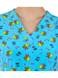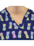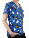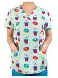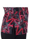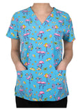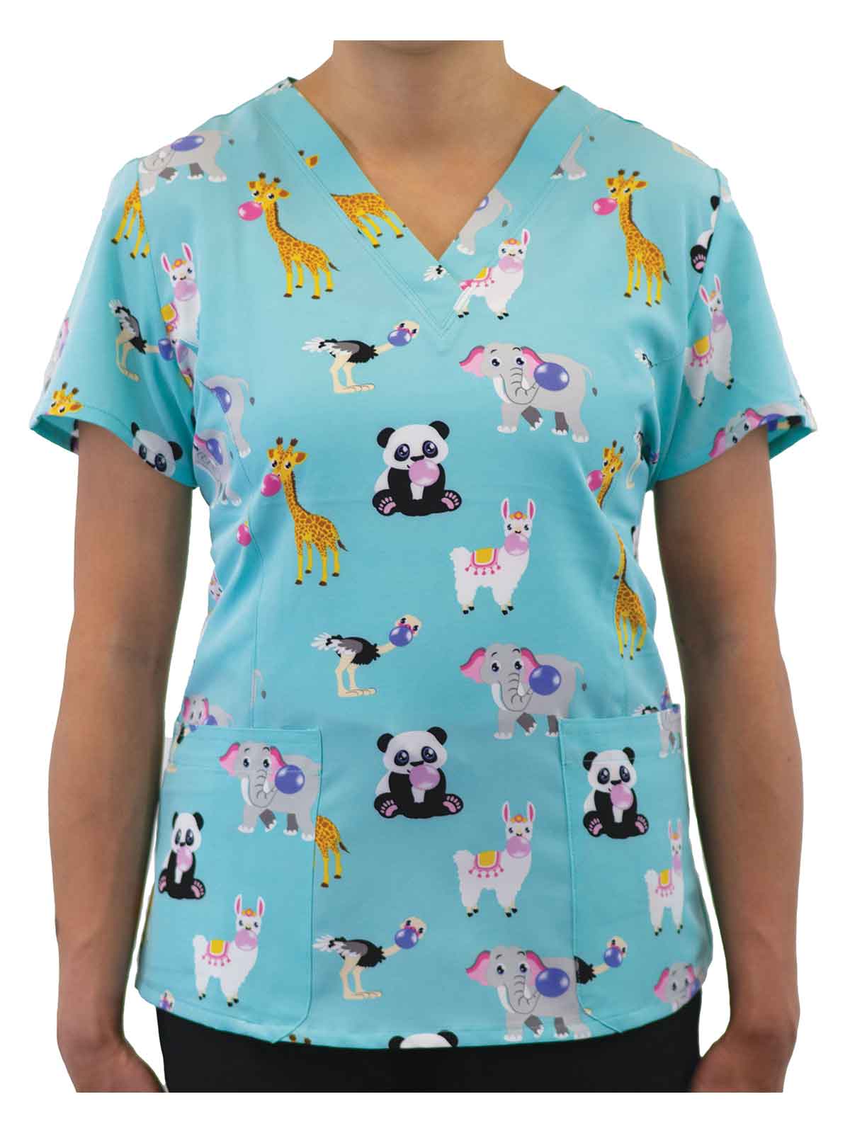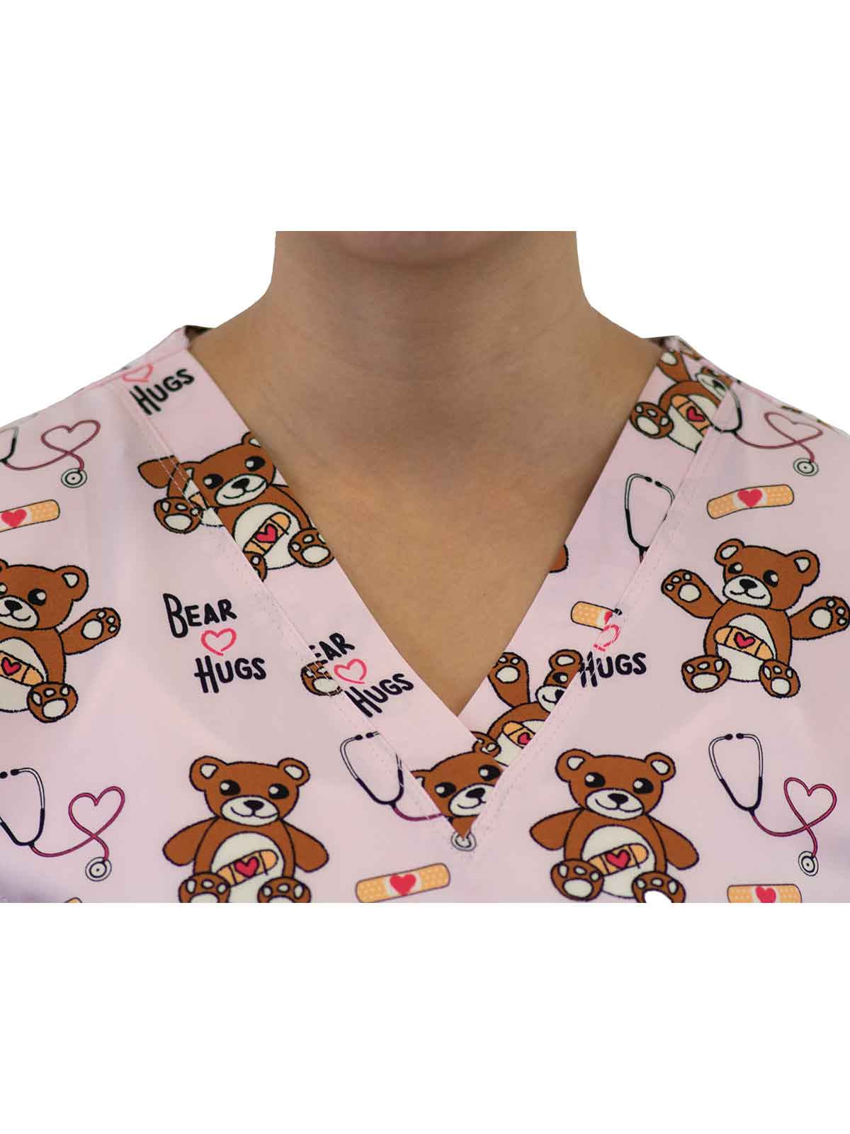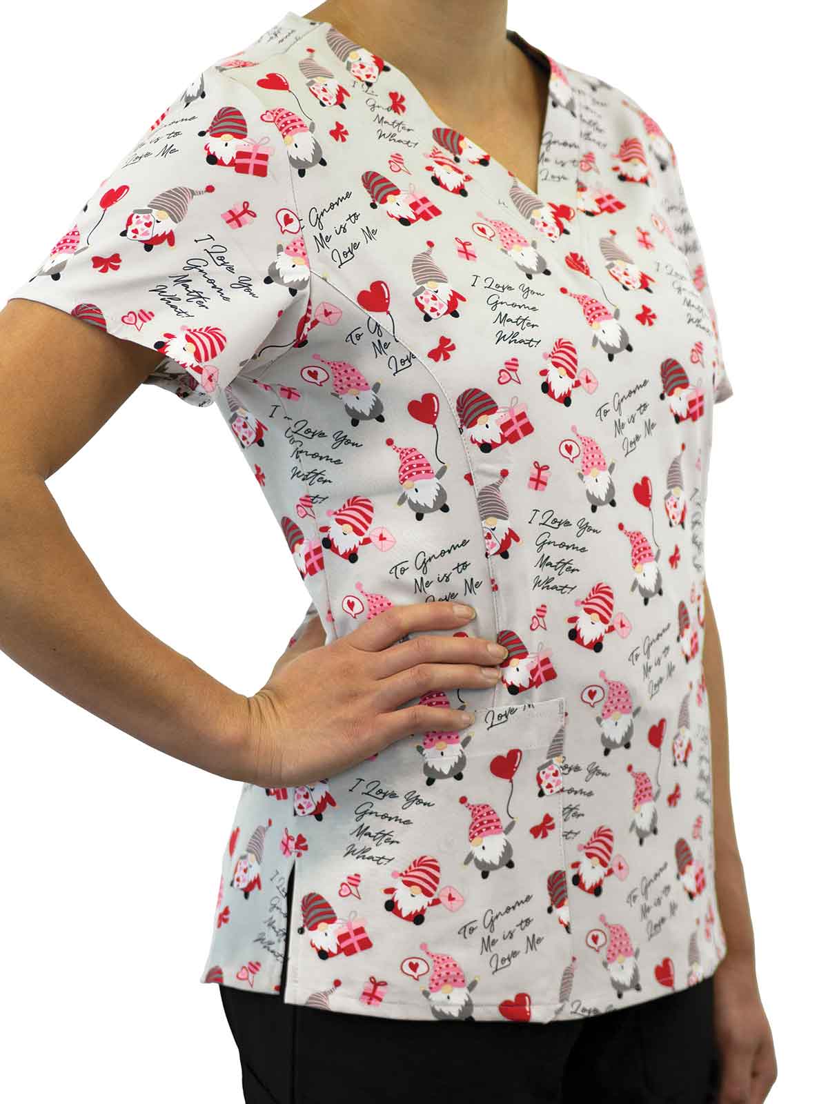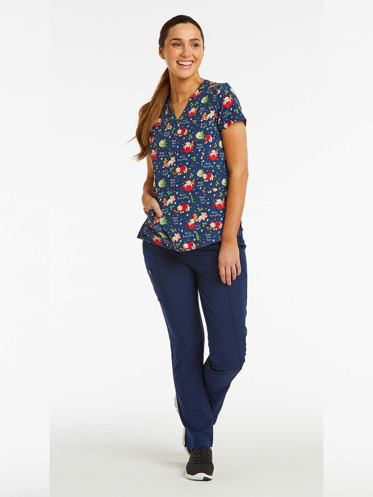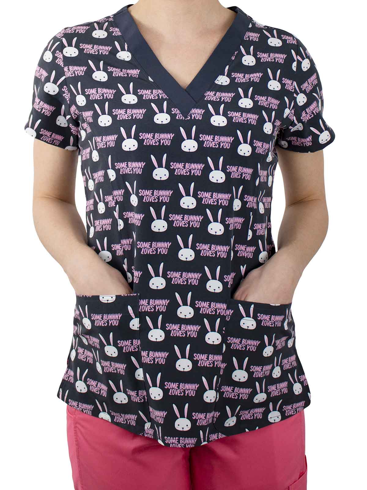 "*Printed curved v-neck top *Front princess seams and back darts for added style and shape *Two slant patch pockets with inner cell pocket *Solid contrast at back facing *Side vents" Banded v-neckline Short sleeves Front princess seaming Back shaping darts...