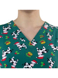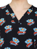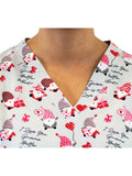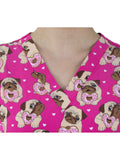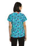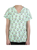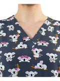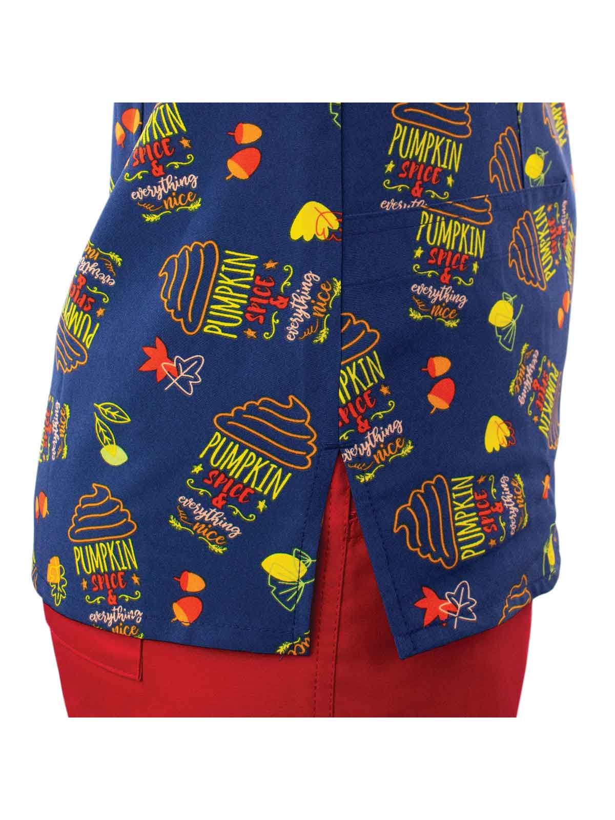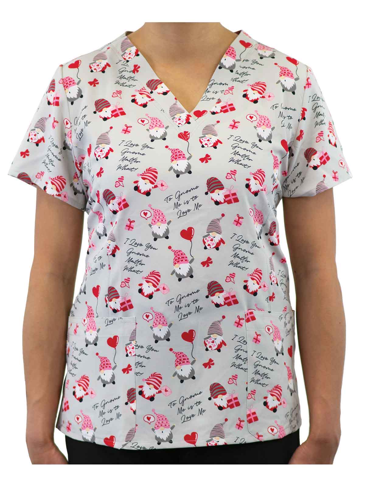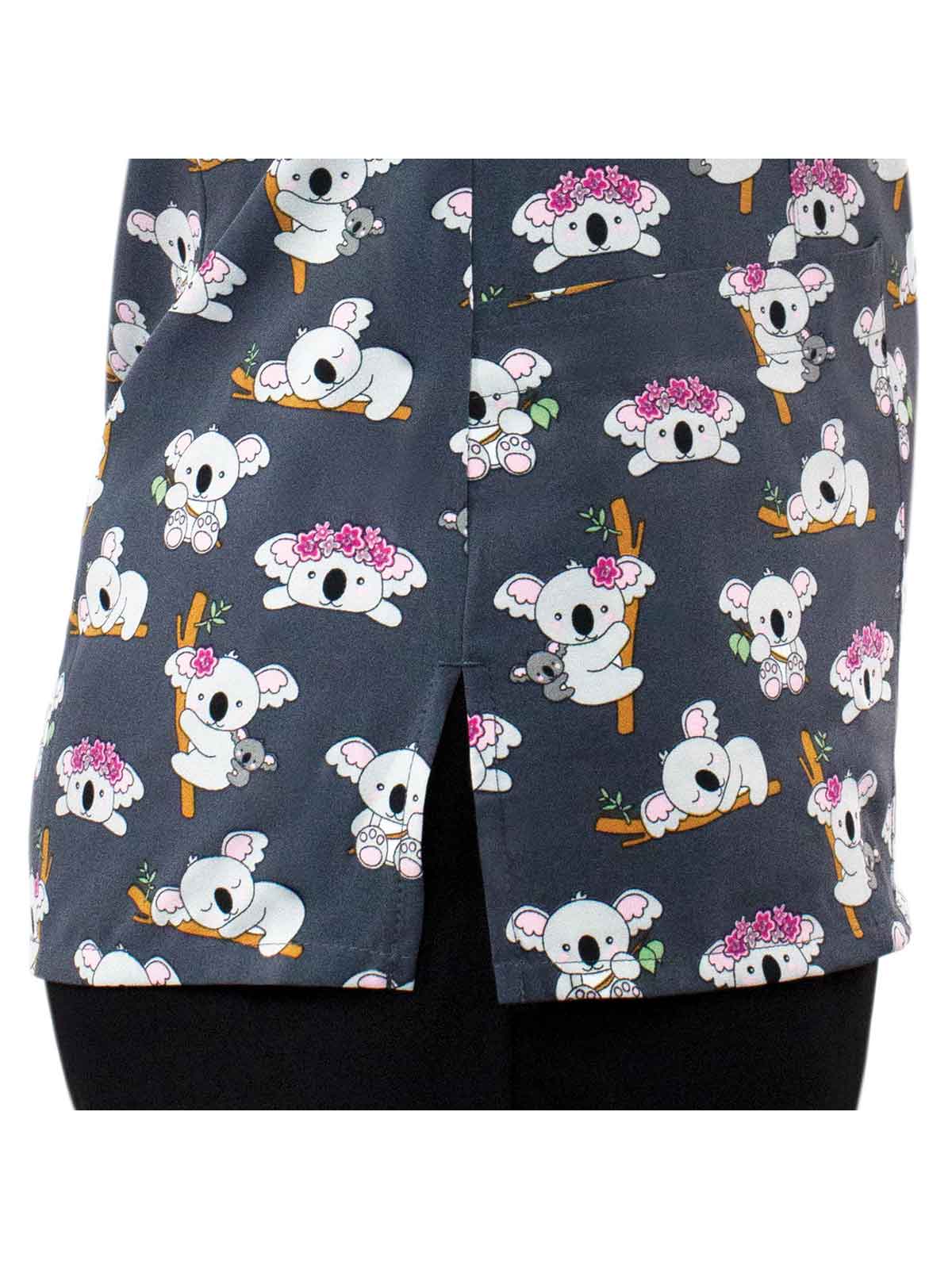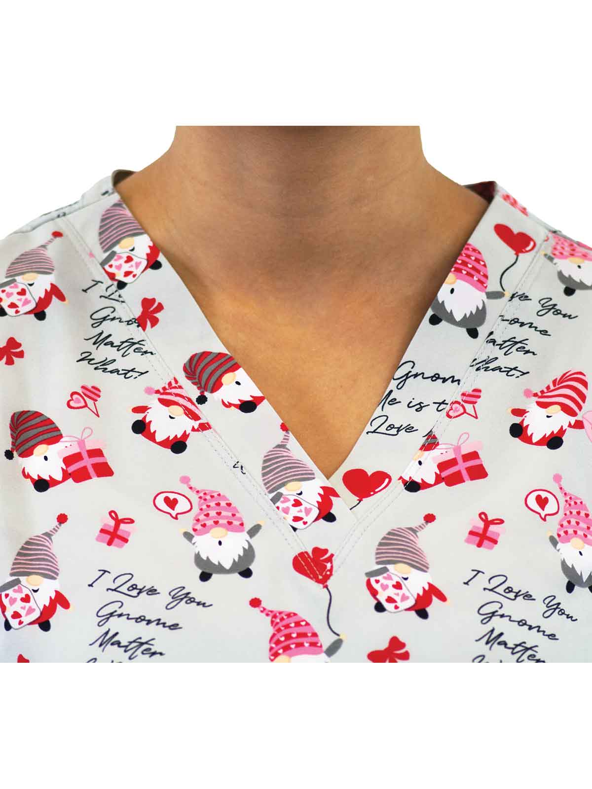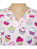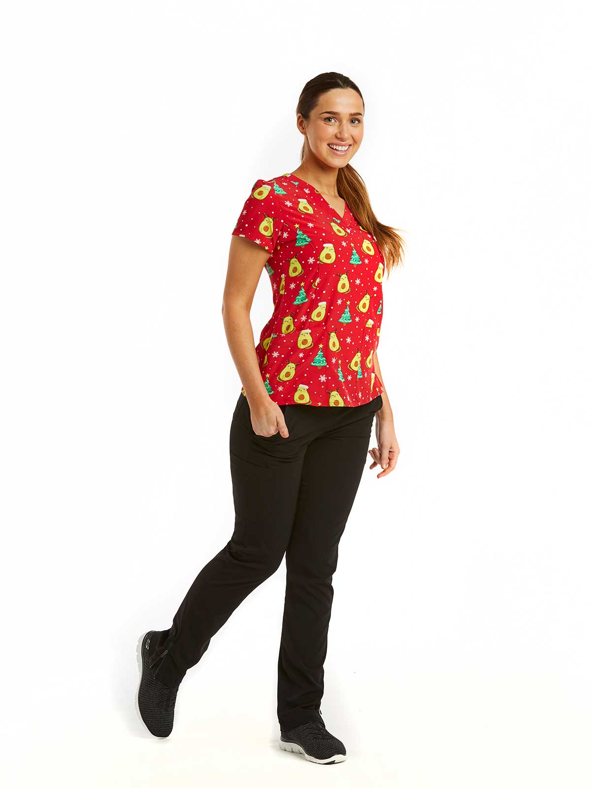 "*Printed curved v-neck top *Front princess seams and back darts for added style and shape *Two slant patch pockets with inner cell pocket *Solid contrast at back facing *Side vents" Banded v-neckline Short sleeves Front princess seaming Back shaping darts...