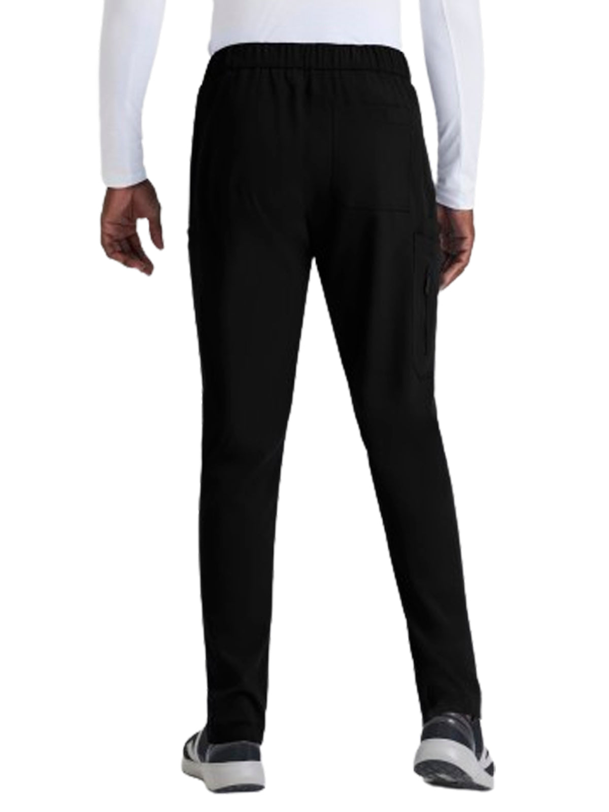 "*Men's half elastic waistband pant with tapered leg *Dyed-to-match inner drawstring *Functional front y with button *Two front angled patch pockets *One angled patch cargo pocket with additional scissor pocket *Two back angled patch pockets *Decorative contrast piping at cargo...