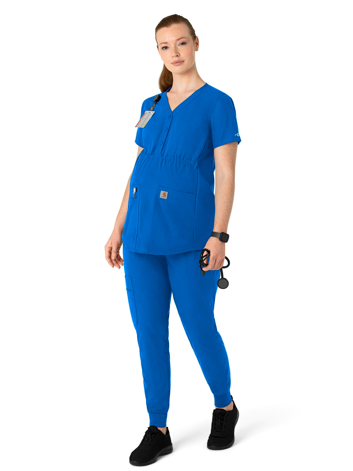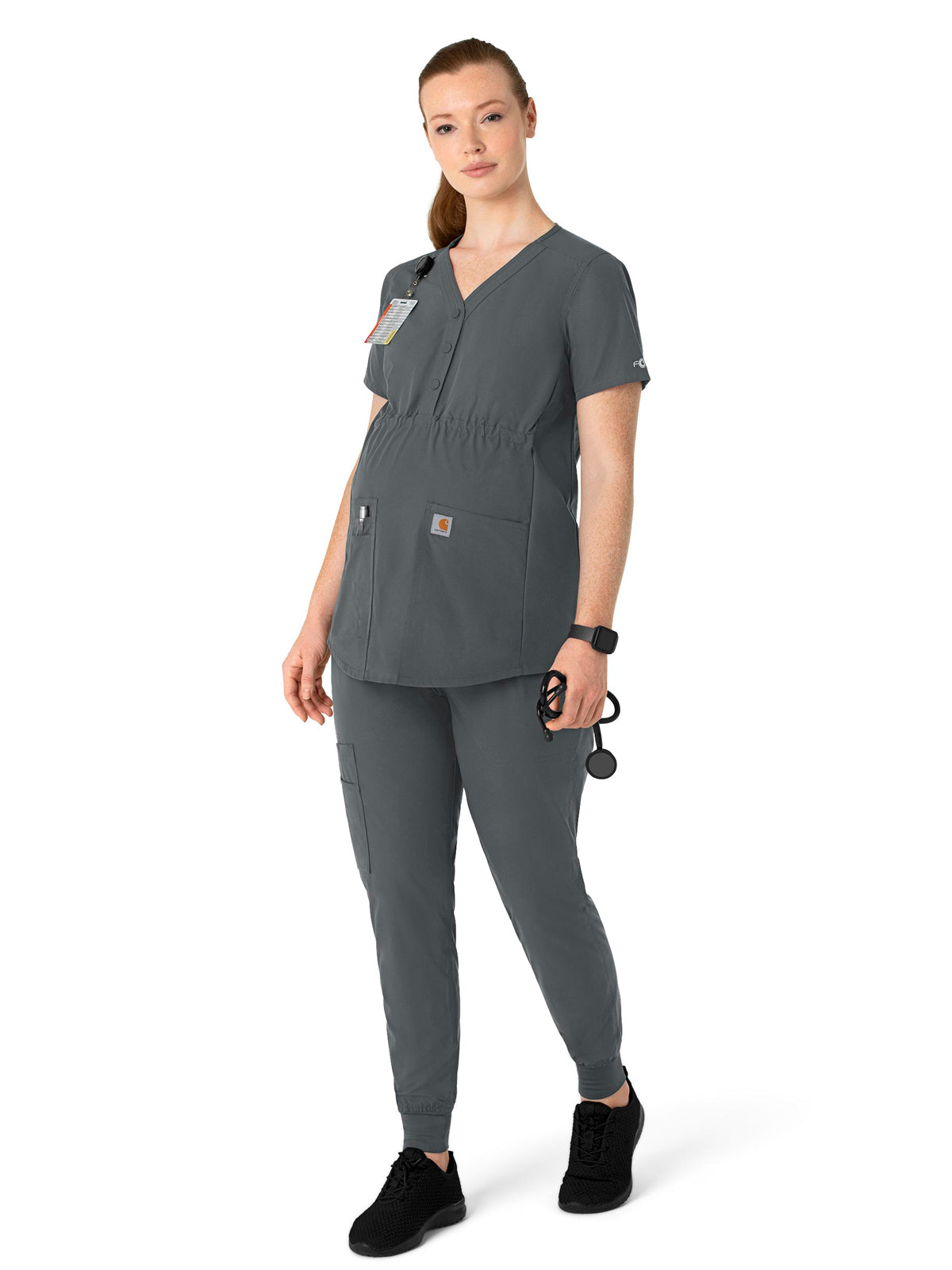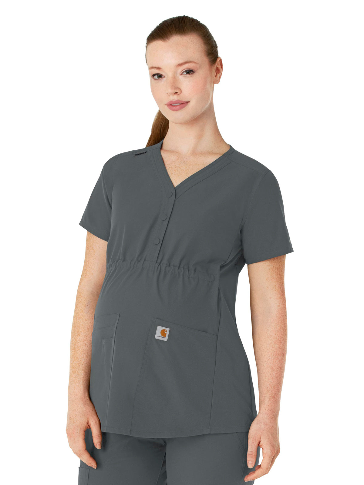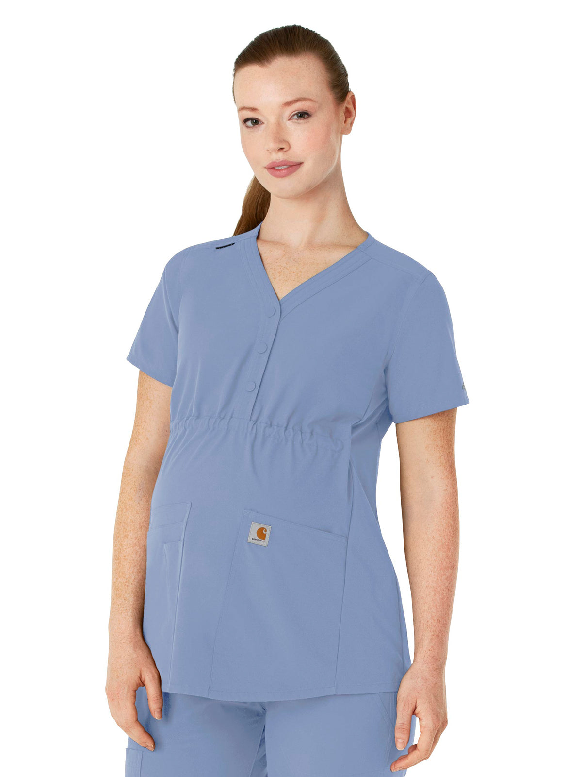 This maternity scrub top simplifies your life so your focus stays sharp and your comfort stays strong while you're expecting. It's designed with all the features you need for practical wear at work, like two oversized top-loading front pockets that take care of larger essentials and daily must-haves. Slip your phone into a smaller mesh pocket built right in, so you always know where it is and have easy access when you need to check in. A scissor pocket on your right keeps that must-have tool in place, and a loop on the shoulder displays your badge while making sure it stays out of your way as you're attending to patients or answering calls. Adjust the elastic on the empire waist to get the fit you want as your belly grows. A curved hem creates a well-rounded silhouette, and a Henley neckline with a snap-button placket finishes the look in tailored style. This scrub top is designed with technologies that help you to perform at your very best. It wicks sweat, dries fast and resists stains, so you stay looking and feeling professional all through your shift.