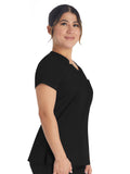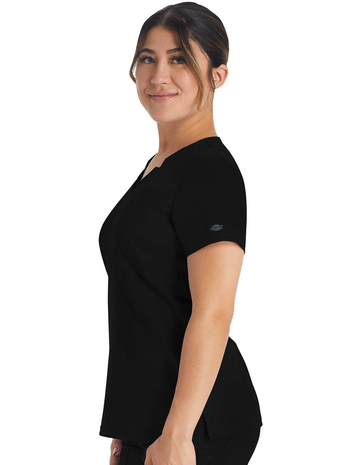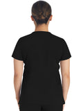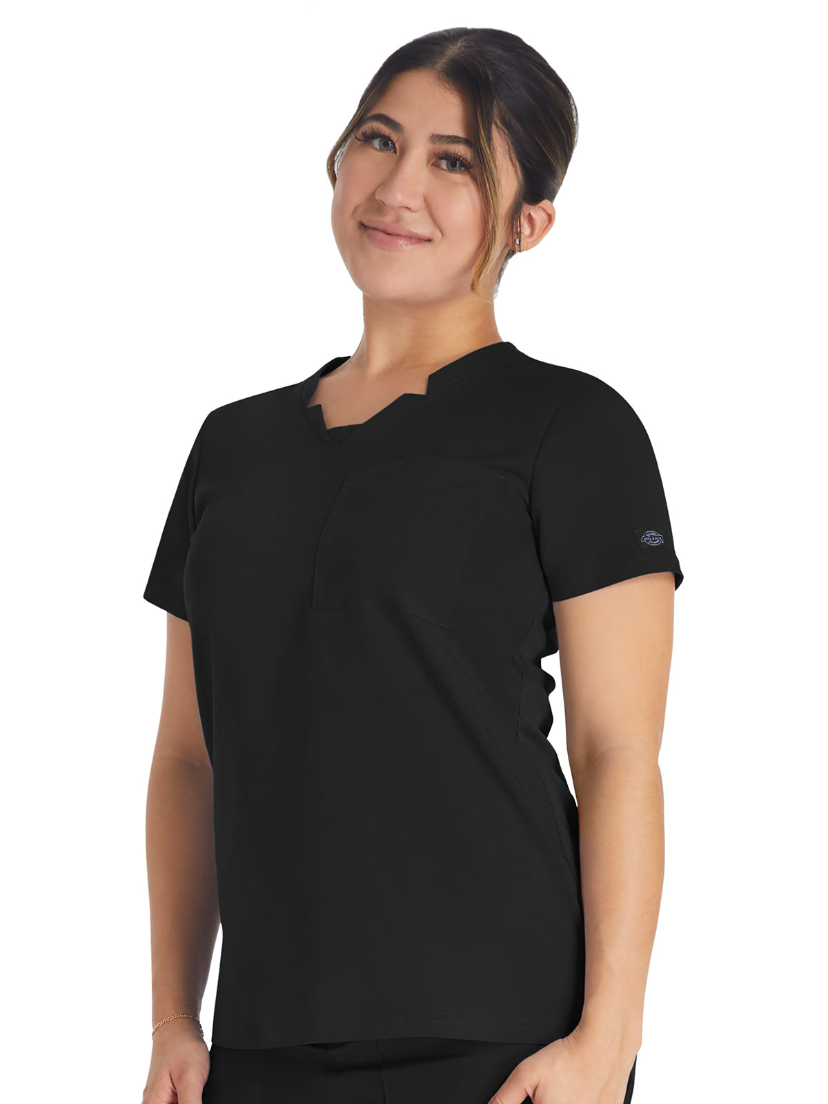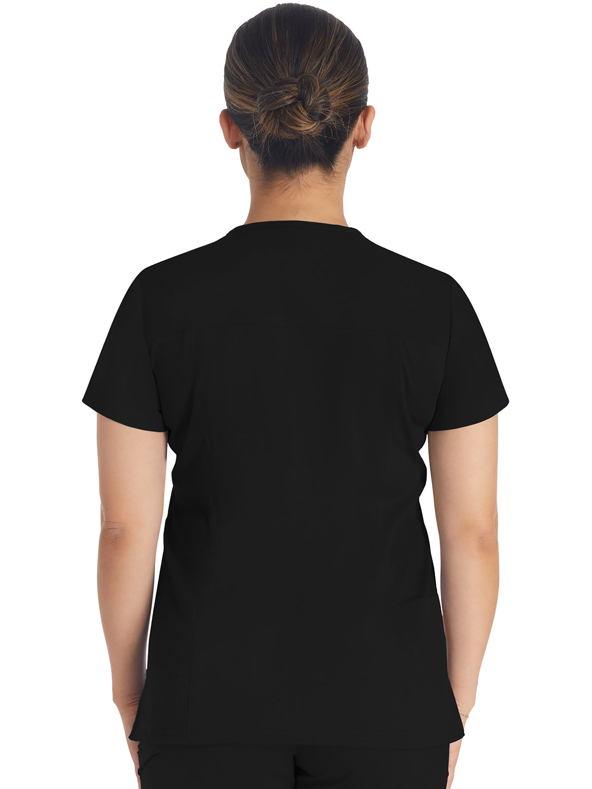 This Contemporary fit v-neck top features a notched neckline with a dyed-to-match knit inset at the center front neck. There are two pockets for storage: one chest pocket with pen/instrument slot and one patch pocket on the wearer's right hip. Dyed-to-match rib-knit back side panels provide stretch and ease of movement. Shoulder yokes, back yoke, and side vents complete this style. Center back length: 25 ½"