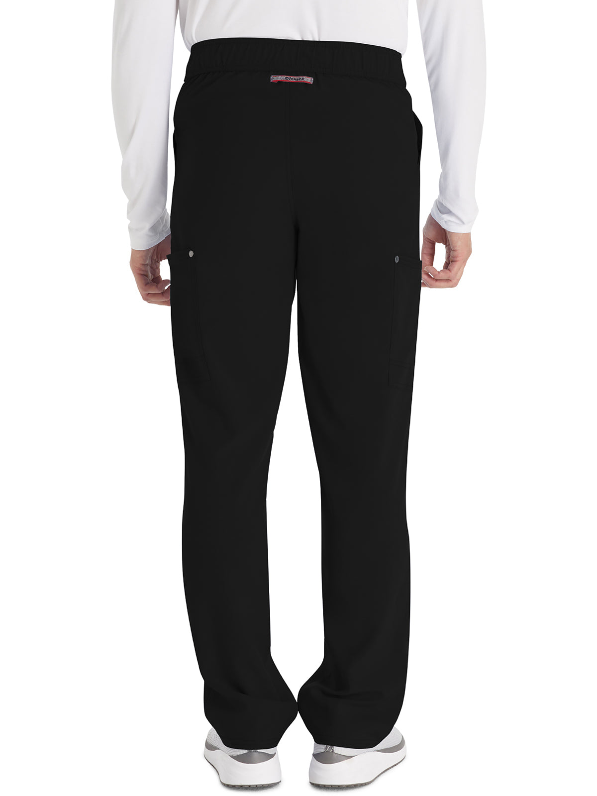This Men's fit mid rise pant has an elastic-reinforced waistband with inside logo drawstring for adjustability and security. Pull-on waist with zip fly and logo snap closure. There are four pockets for easy storage: two front slant pockets and two cargo pockets with decorative stitching (right with pen/instrument stitch). Cargo pockets have decorative logo snaps at corners. Decorative knee stitching and decorative stitching on all seams for added styling. Logo locker loop at center back waist for quick hanging. Straight leg, 17" opening. Inseam: 32"