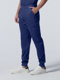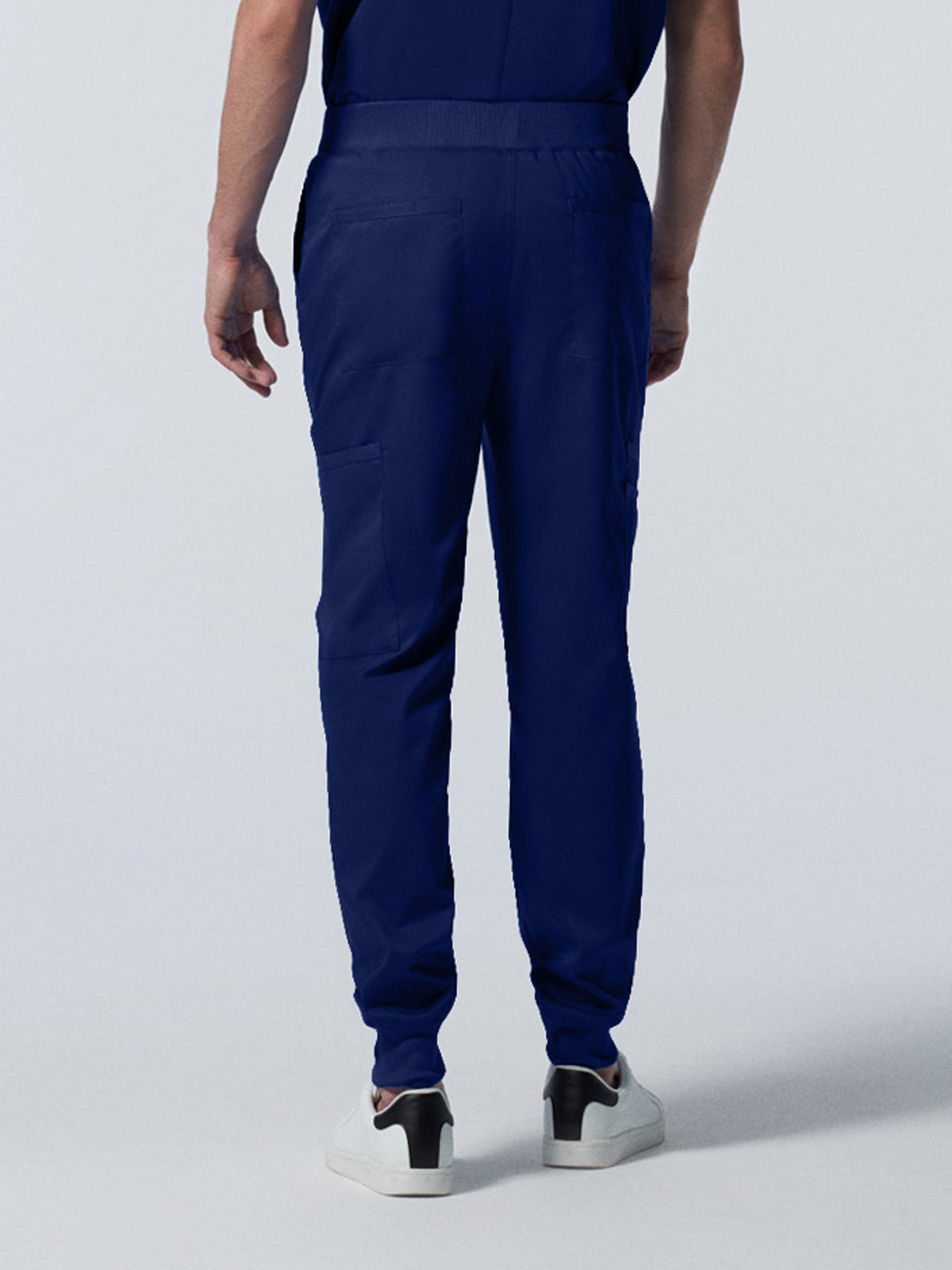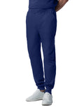 A Contemporary fit, low rise, straight leg pant features an elastic knit waistband and adjustable drawstring. Also featured are rib knit front and back yokes, angled front pockets, front leg seams with a zip closure cargo pocket, one back patch...