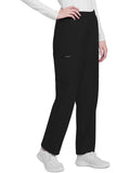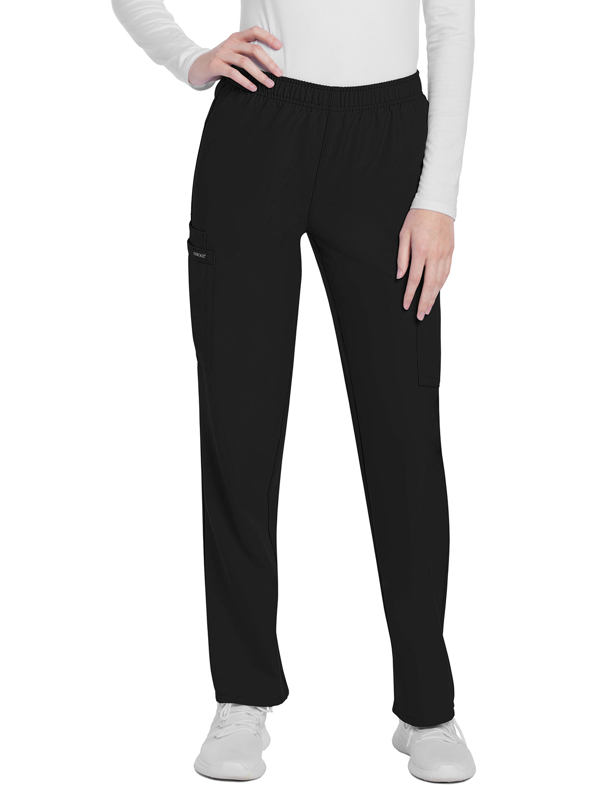 This mid rise pull-on pant has an elasticized waistband and an updated slimmer leg. There are three pockets for storage: two roomy cargo pockets and an additional accessory pocket inside the right cargo pocket. Cargo pockets include reverse hem trim. Decorative tonal topstitching for added detailing. Slim straight leg, 16" opening. Inseam: 28 1/2"