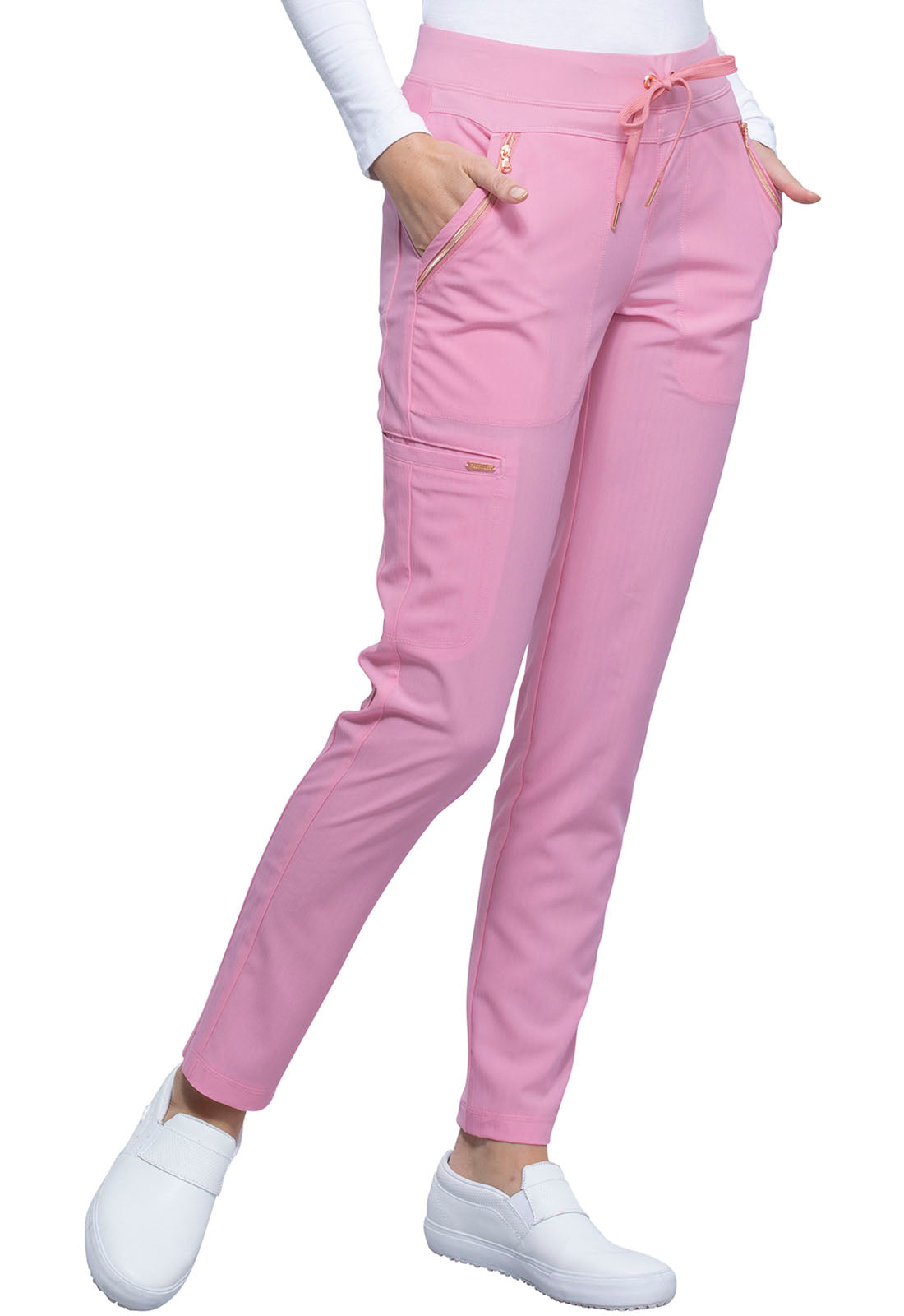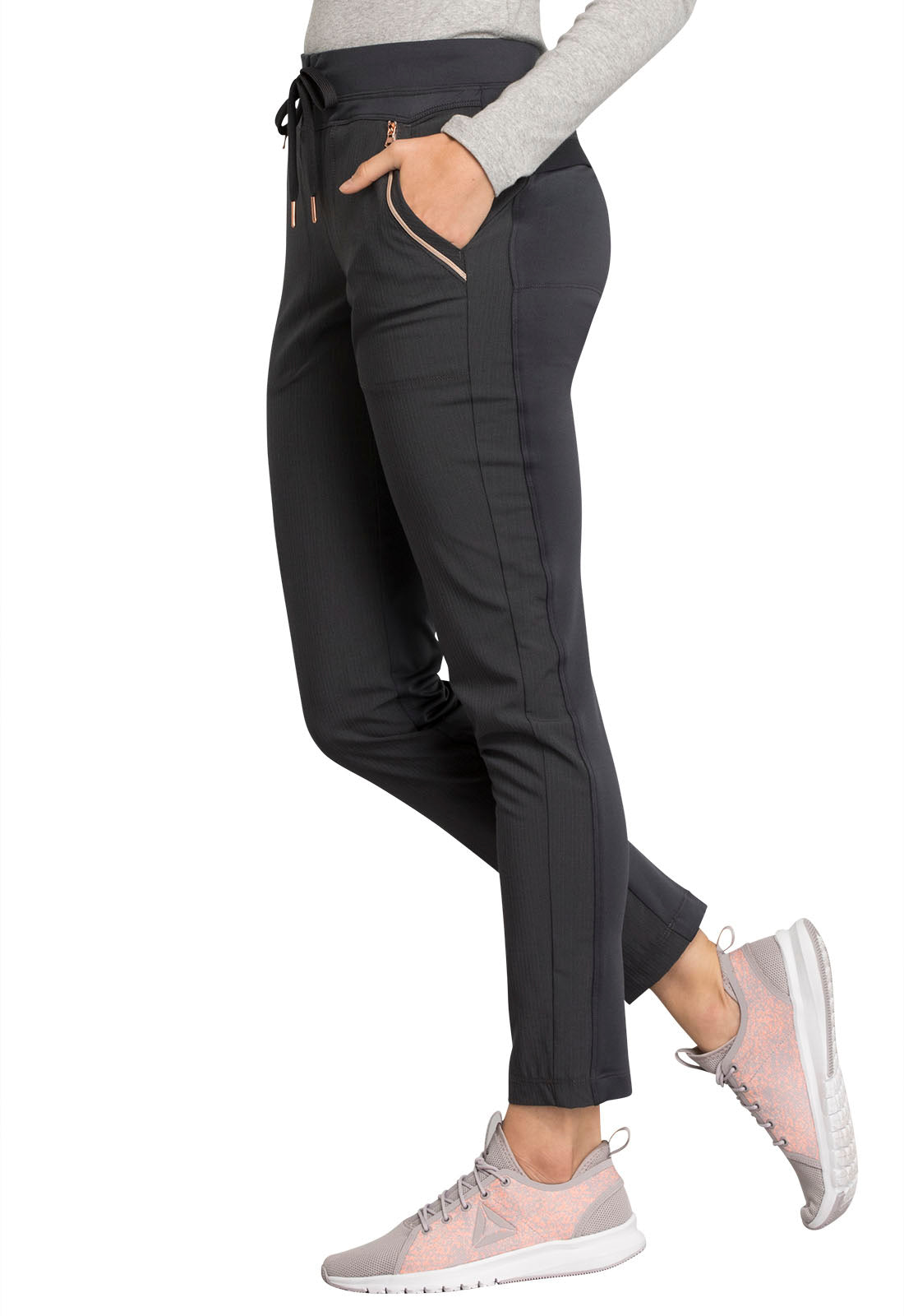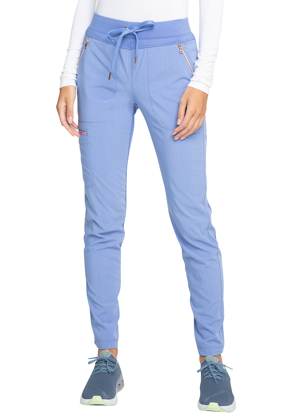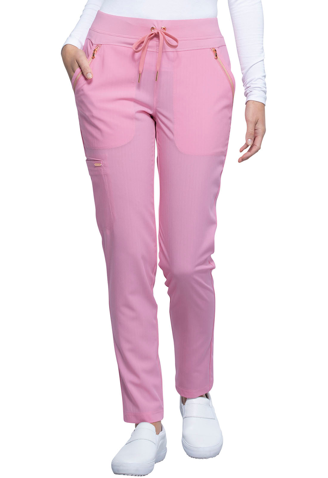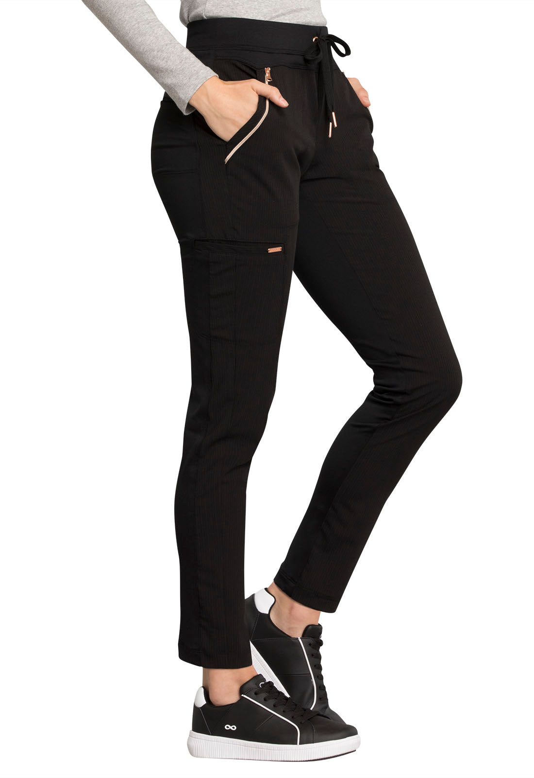 Pull-on styling, a figure-flattering cut, and a knit full back panel makes this mid rise pant a comfortable and elegant addition to your work wardrobe. Additional design details include a drawstring front, two angled front pockets, two angled zip pockets, a zip cargo pocket on the wearer's right, and back welt pockets. Rose gold hardware adds a sophisticated accent. Contemporary fit. Tapered leg, 10 1/2" opening. Inseam: 33". This elegant, linear texture stretch fabric and comfortable jersey knit is a chic pairing for stylish healthcare workers looking to make a STATEMENT.