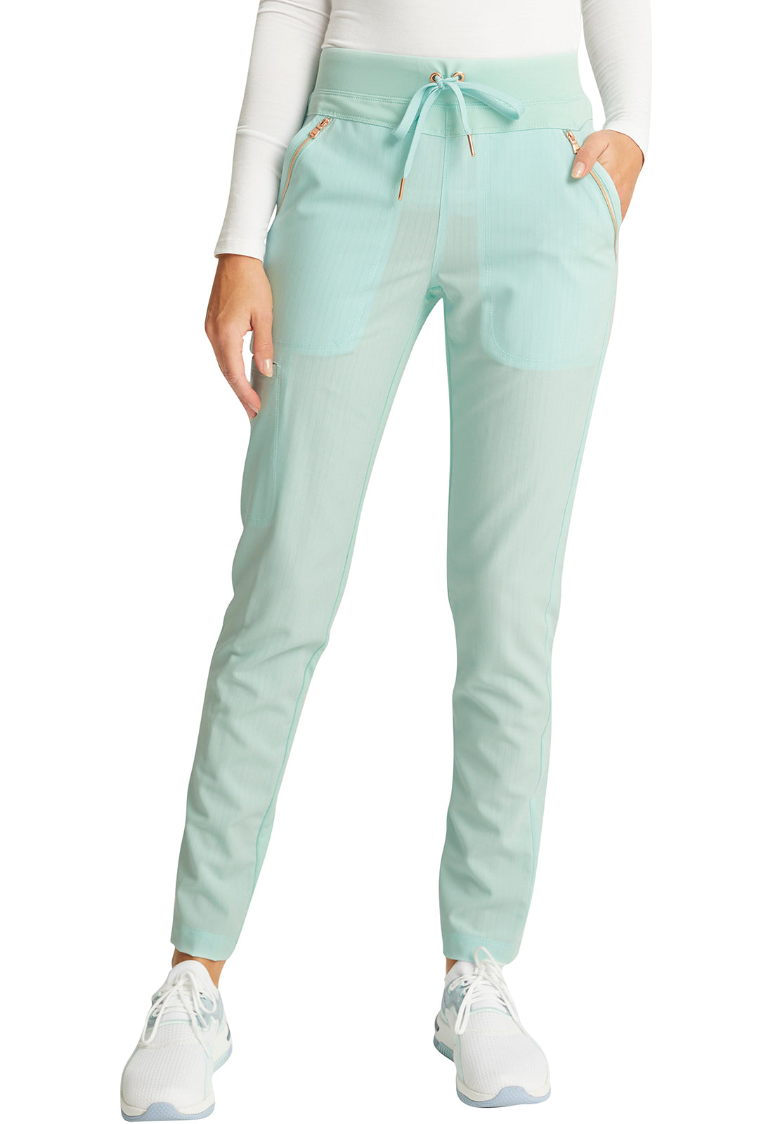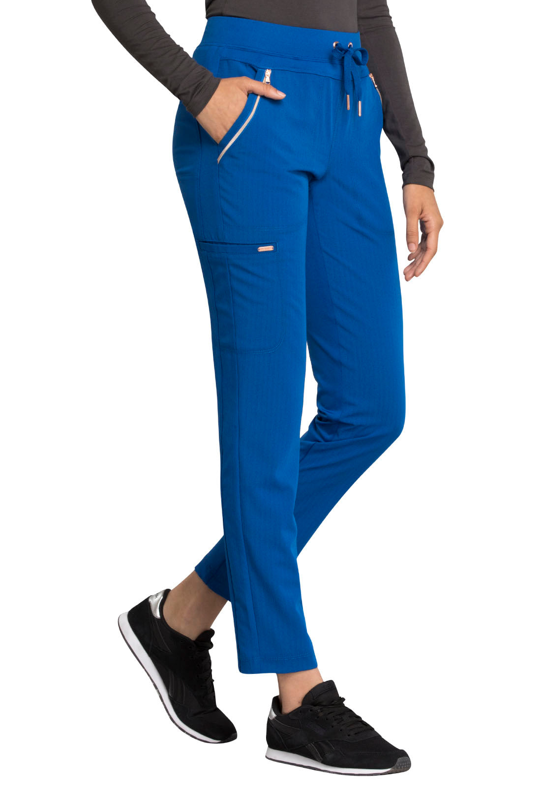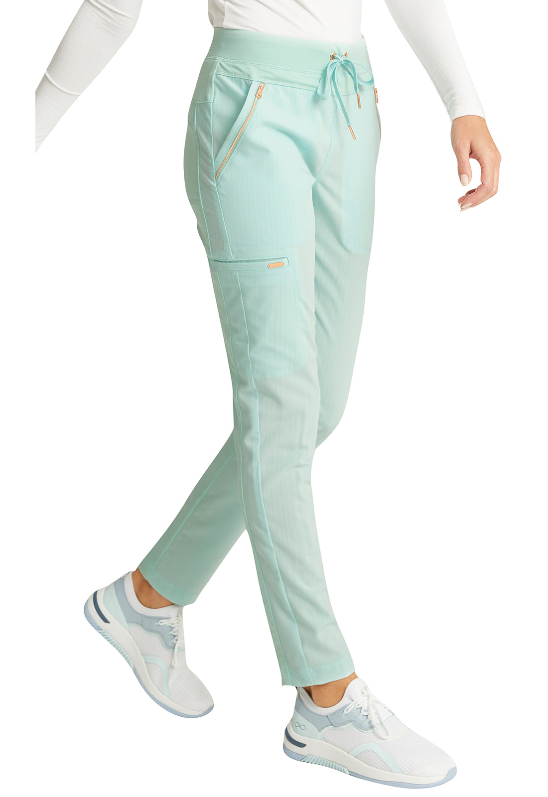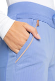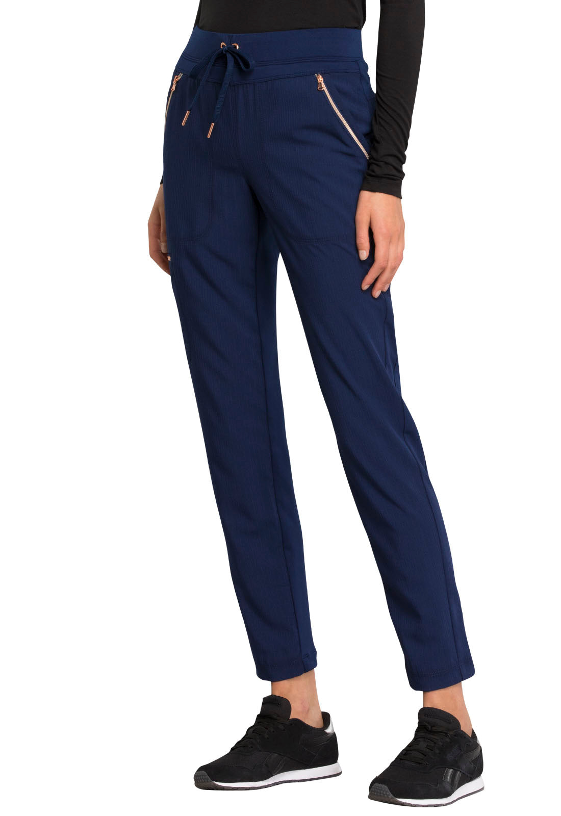 Pull-on styling, a figure-flattering cut, and a knit full back panel makes this mid rise pant a comfortable and elegant addition to your work wardrobe. Additional design details include a drawstring front, two angled front pockets, two angled zip pockets, a zip cargo pocket on the wearer's right, and back welt pockets. Rose gold hardware adds a sophisticated accent. Contemporary fit. Tapered leg, 10 1/2" opening. Inseam: 33". This elegant, linear texture stretch fabric and comfortable jersey knit is a chic pairing for stylish healthcare workers looking to make a STATEMENT.