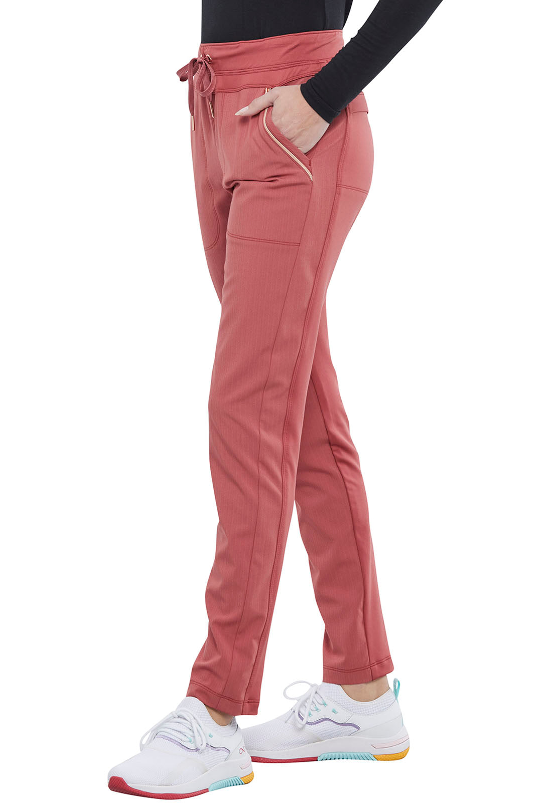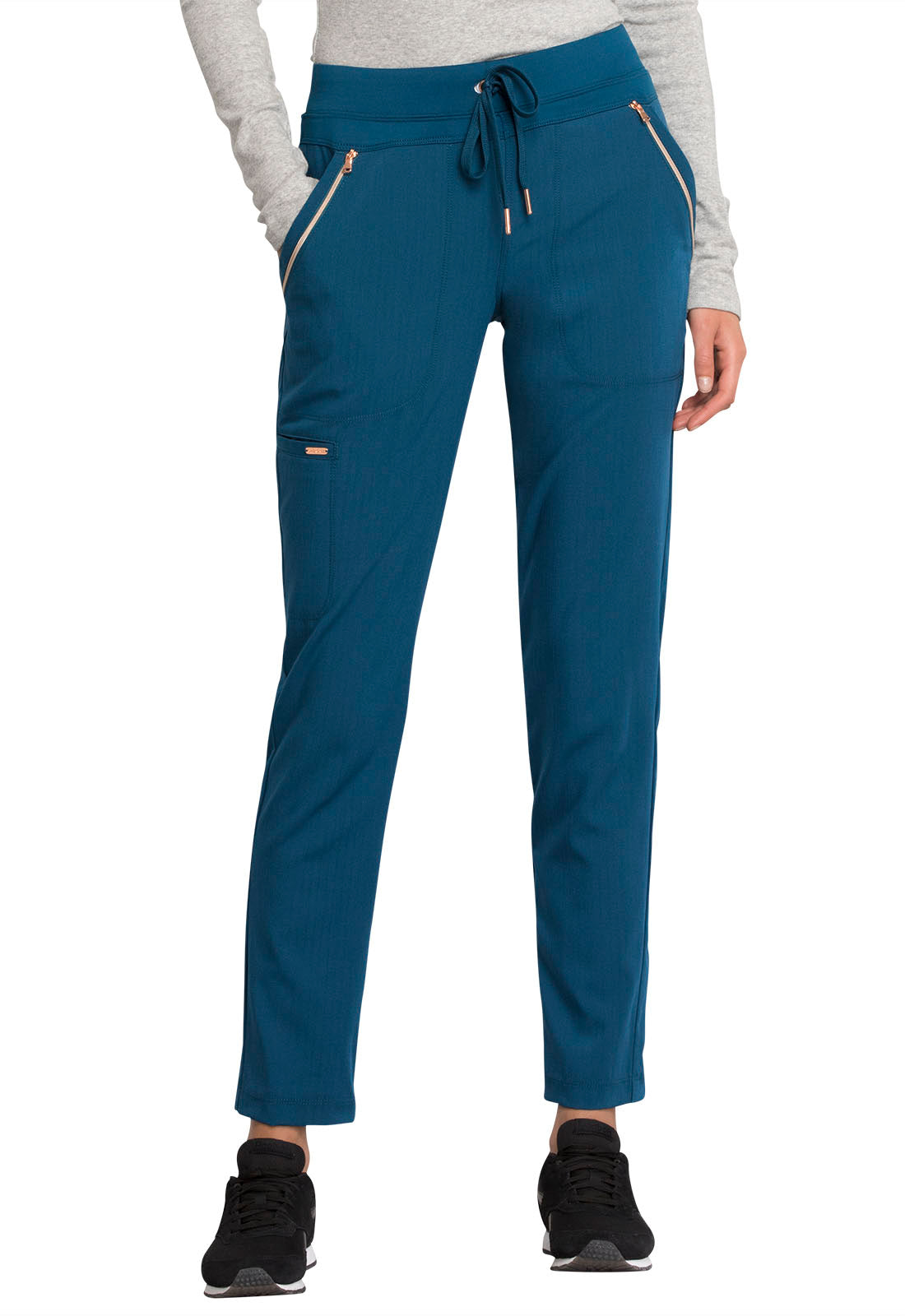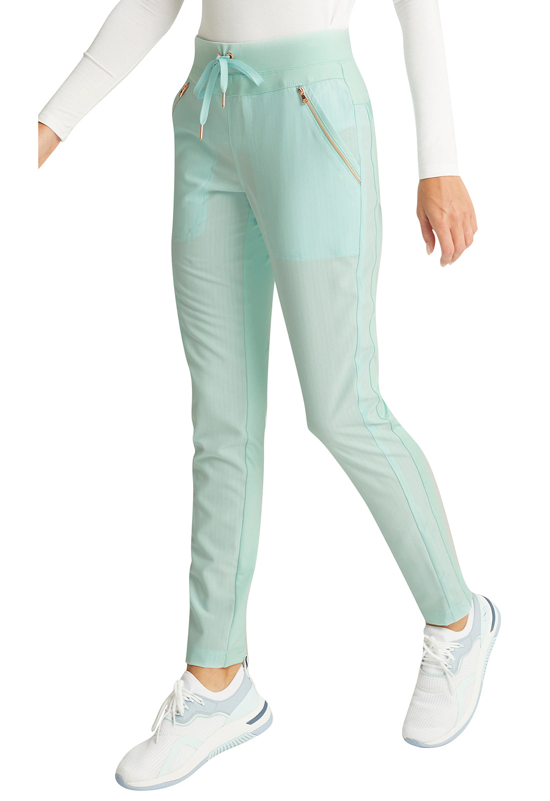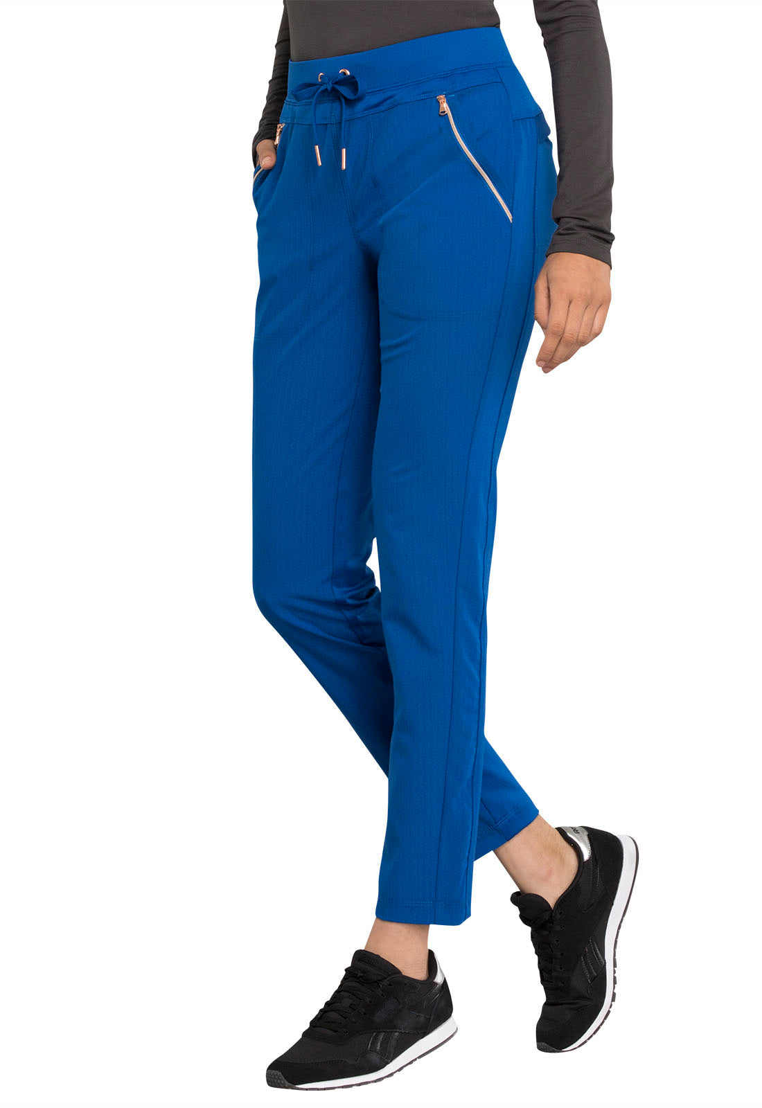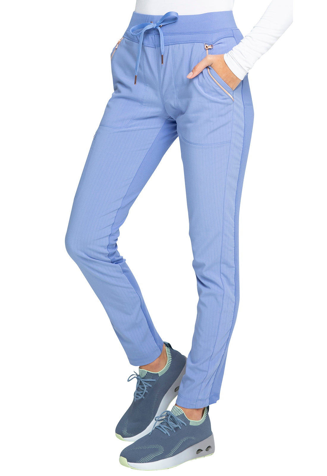 Pull-on styling, a figure-flattering cut, and a knit full back panel makes this mid rise pant a comfortable and elegant addition to your work wardrobe. Additional design details include a drawstring front, two angled front pockets, two angled zip pockets, a zip cargo pocket on the wearer's right, and back welt pockets. Rose gold hardware adds a sophisticated accent. Contemporary fit. Tapered leg, 10 1/2" opening. Inseam: 33". This elegant, linear texture stretch fabric and comfortable jersey knit is a chic pairing for stylish healthcare workers looking to make a STATEMENT.