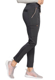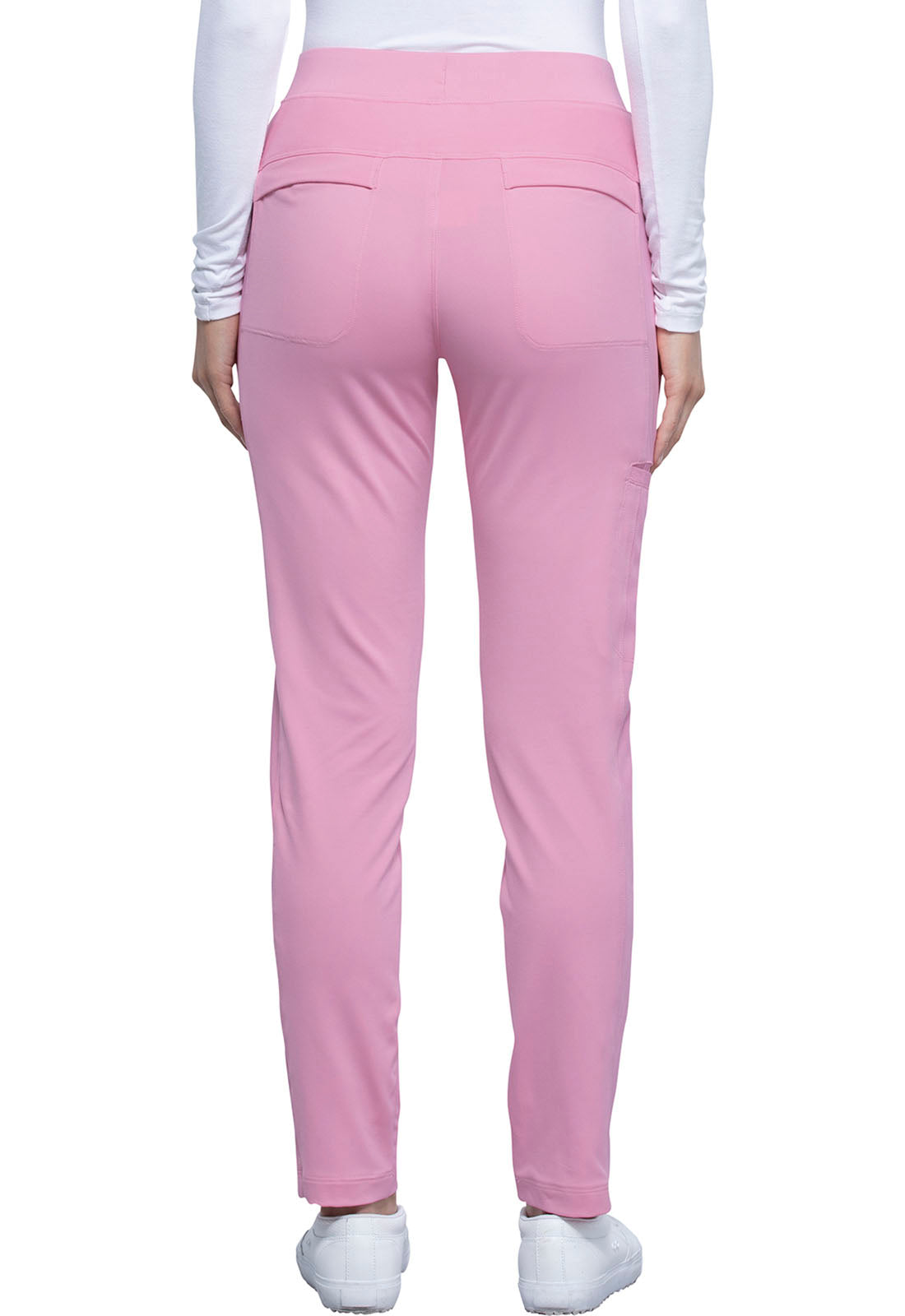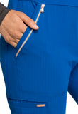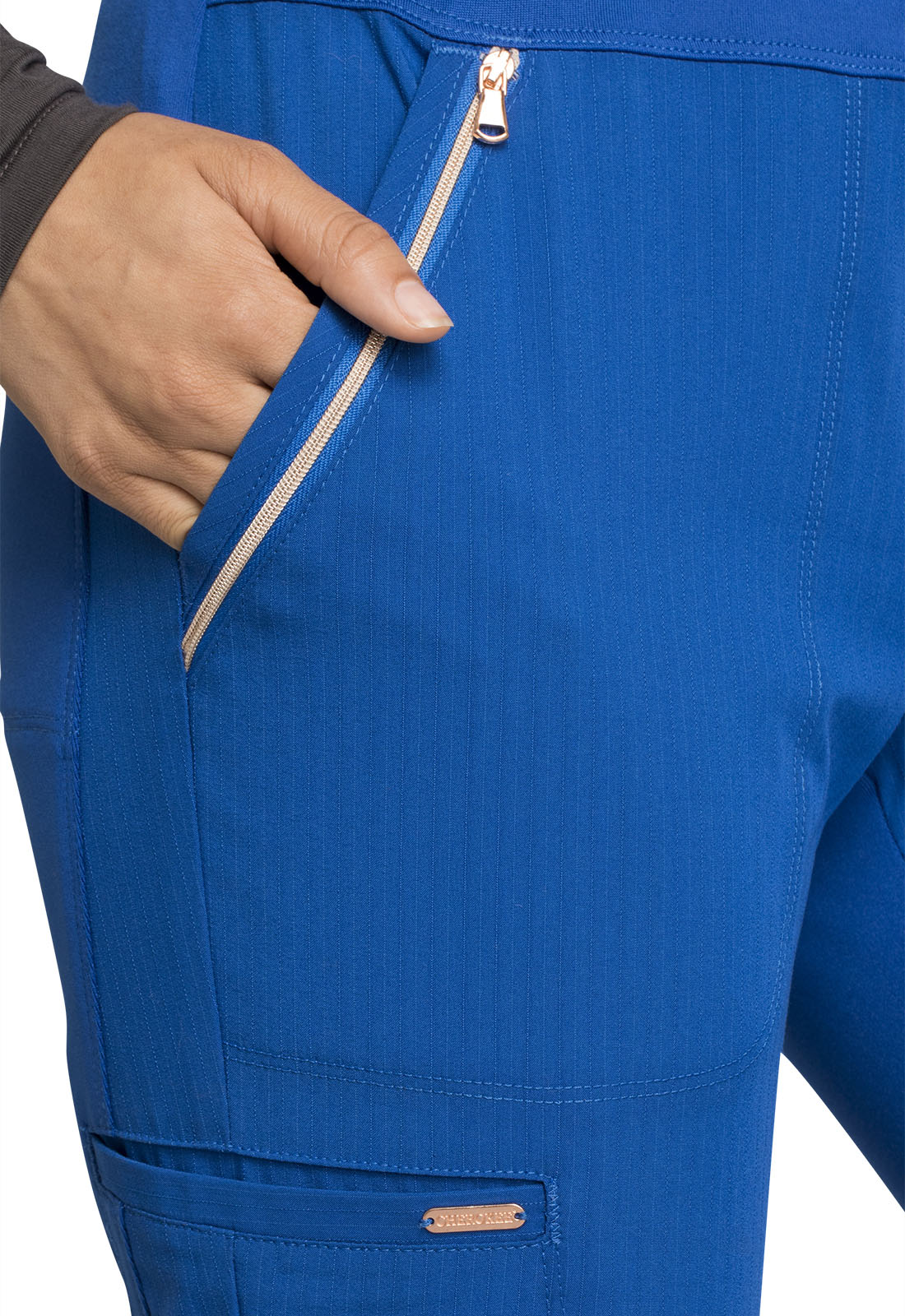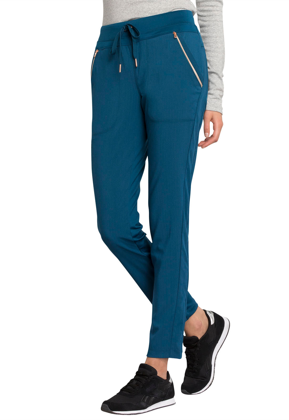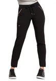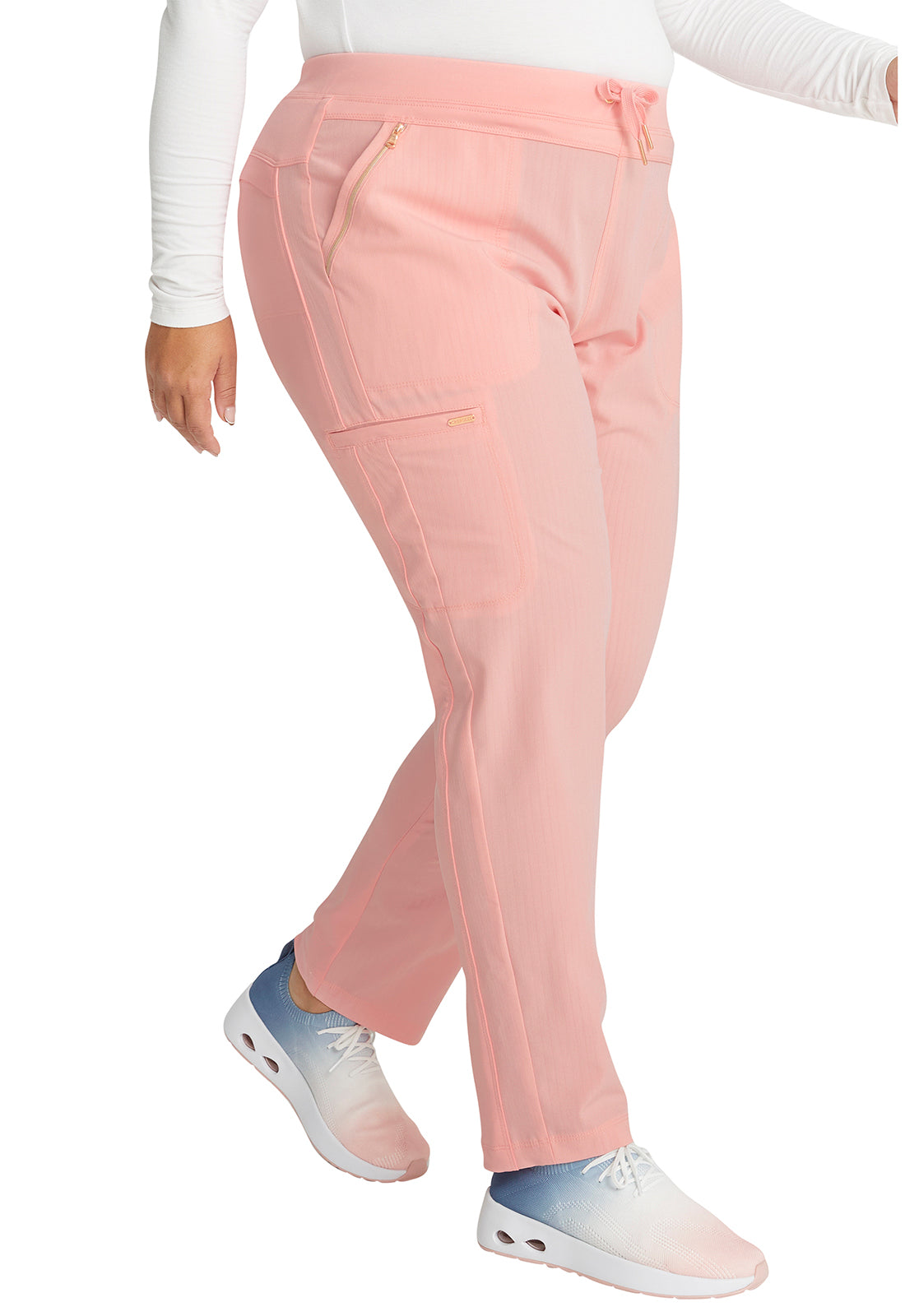 Pull-on styling, a figure-flattering cut, and a knit full back panel makes this mid rise pant a comfortable and elegant addition to your work wardrobe. Additional design details include a drawstring front, two angled front pockets, two angled zip pockets, a zip cargo pocket on the wearer's right, and back welt pockets. Rose gold hardware adds a sophisticated accent. Contemporary fit. Tapered leg, 10 1/2" opening. Inseam: 33". This elegant, linear texture stretch fabric and comfortable jersey knit is a chic pairing for stylish healthcare workers looking to make a STATEMENT.