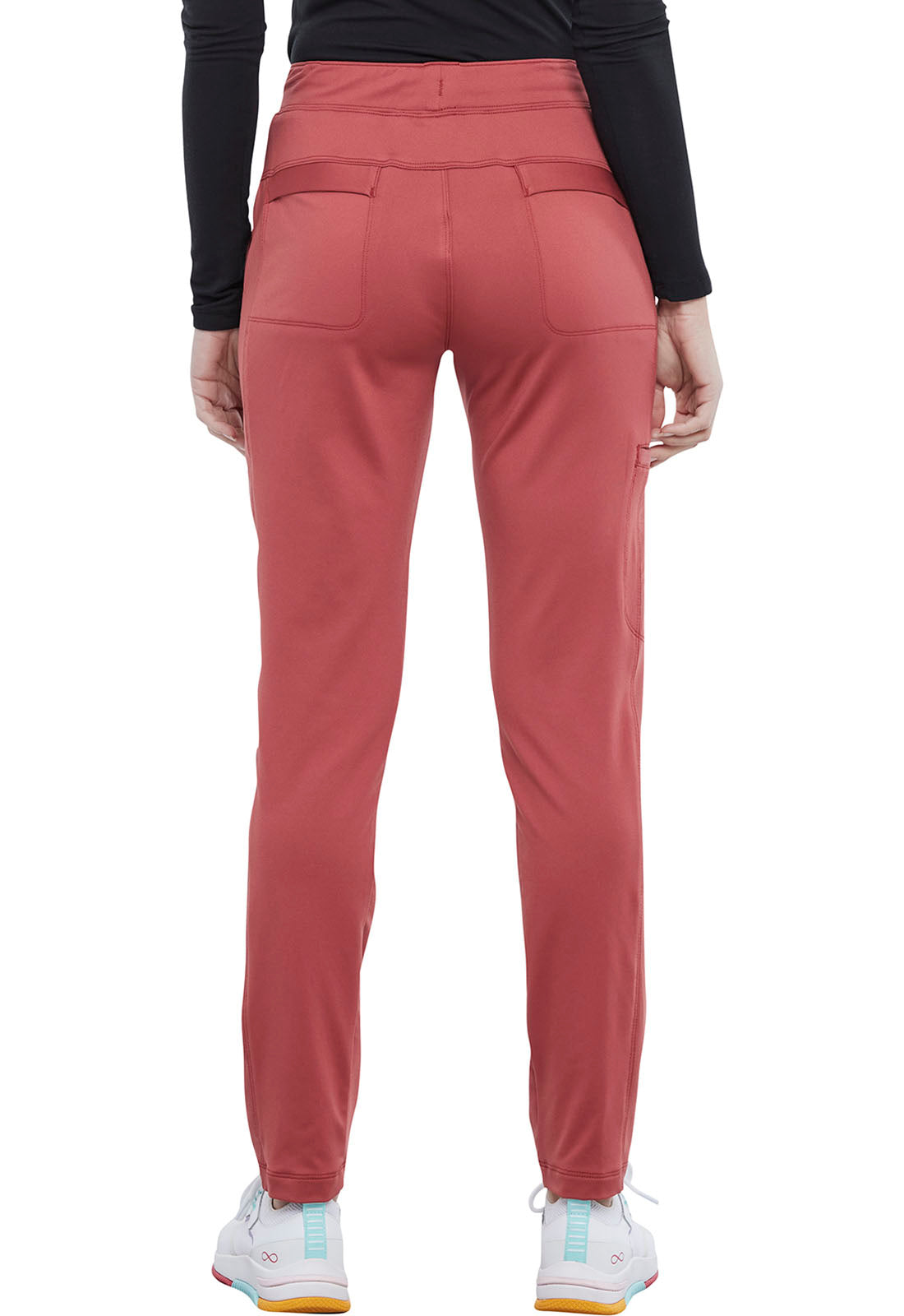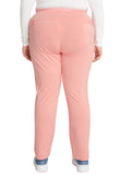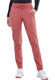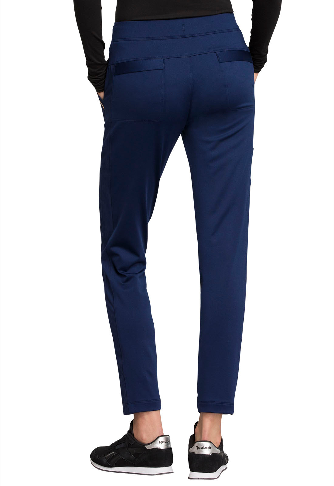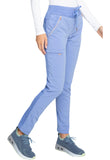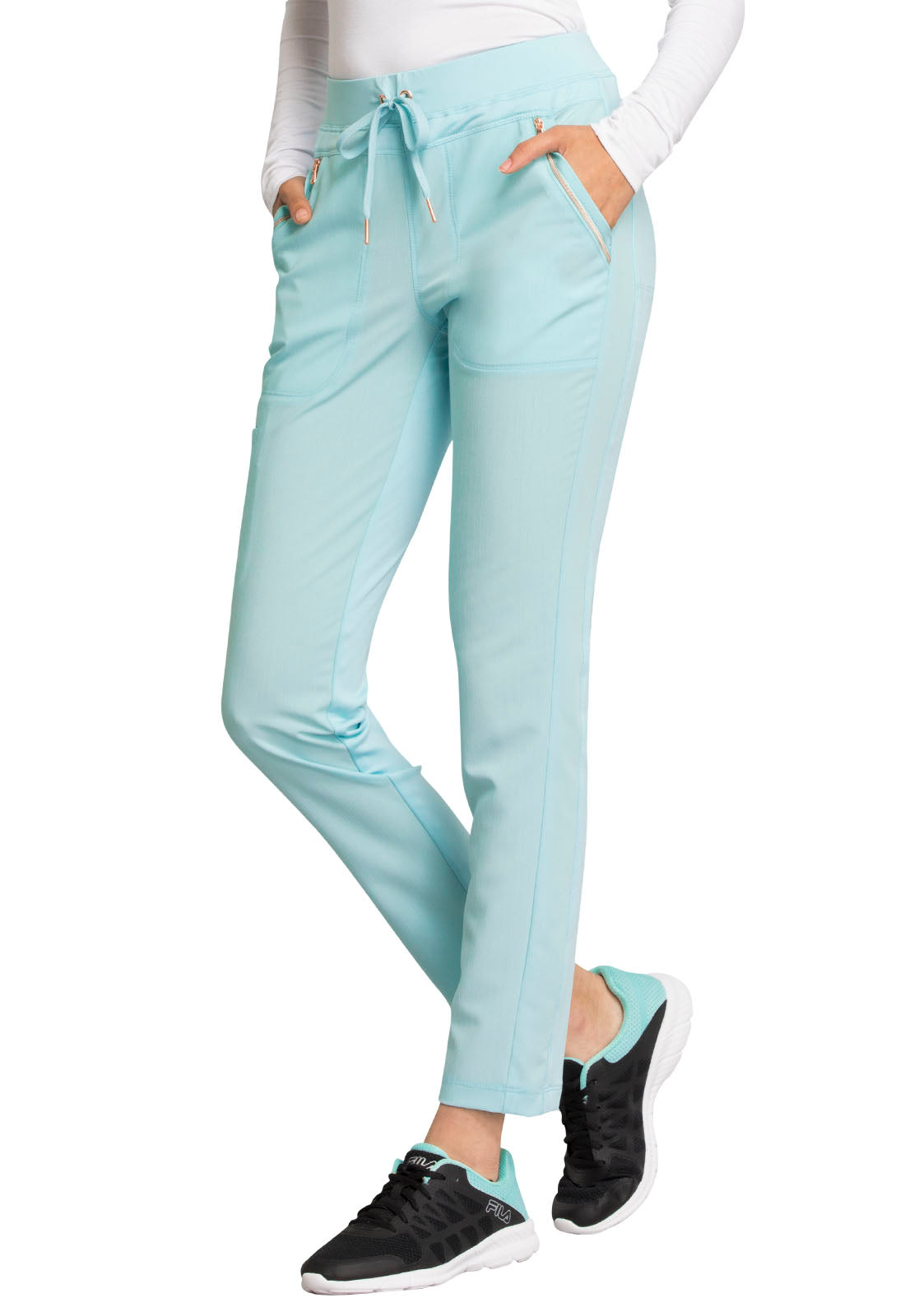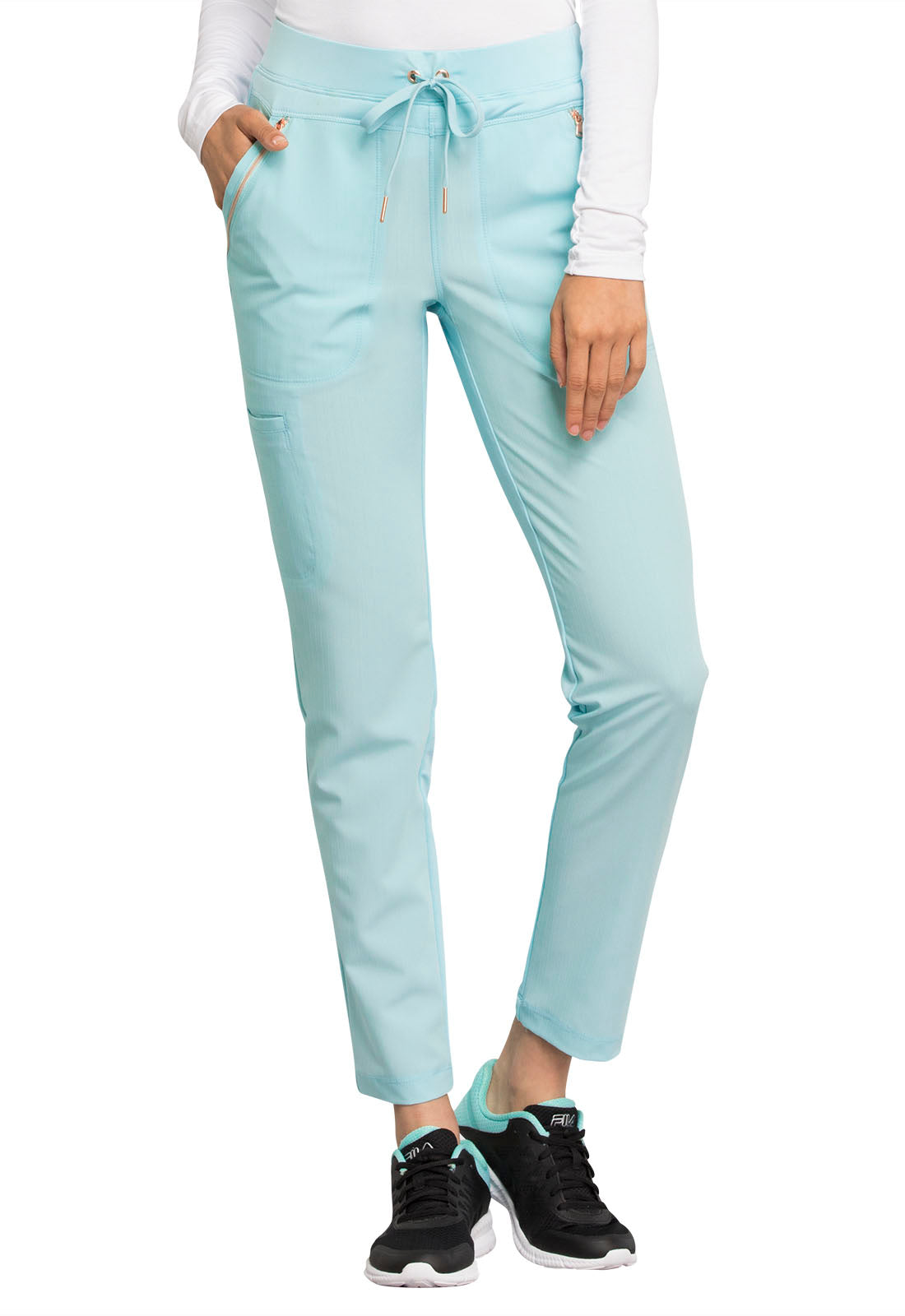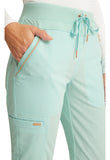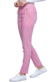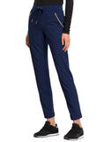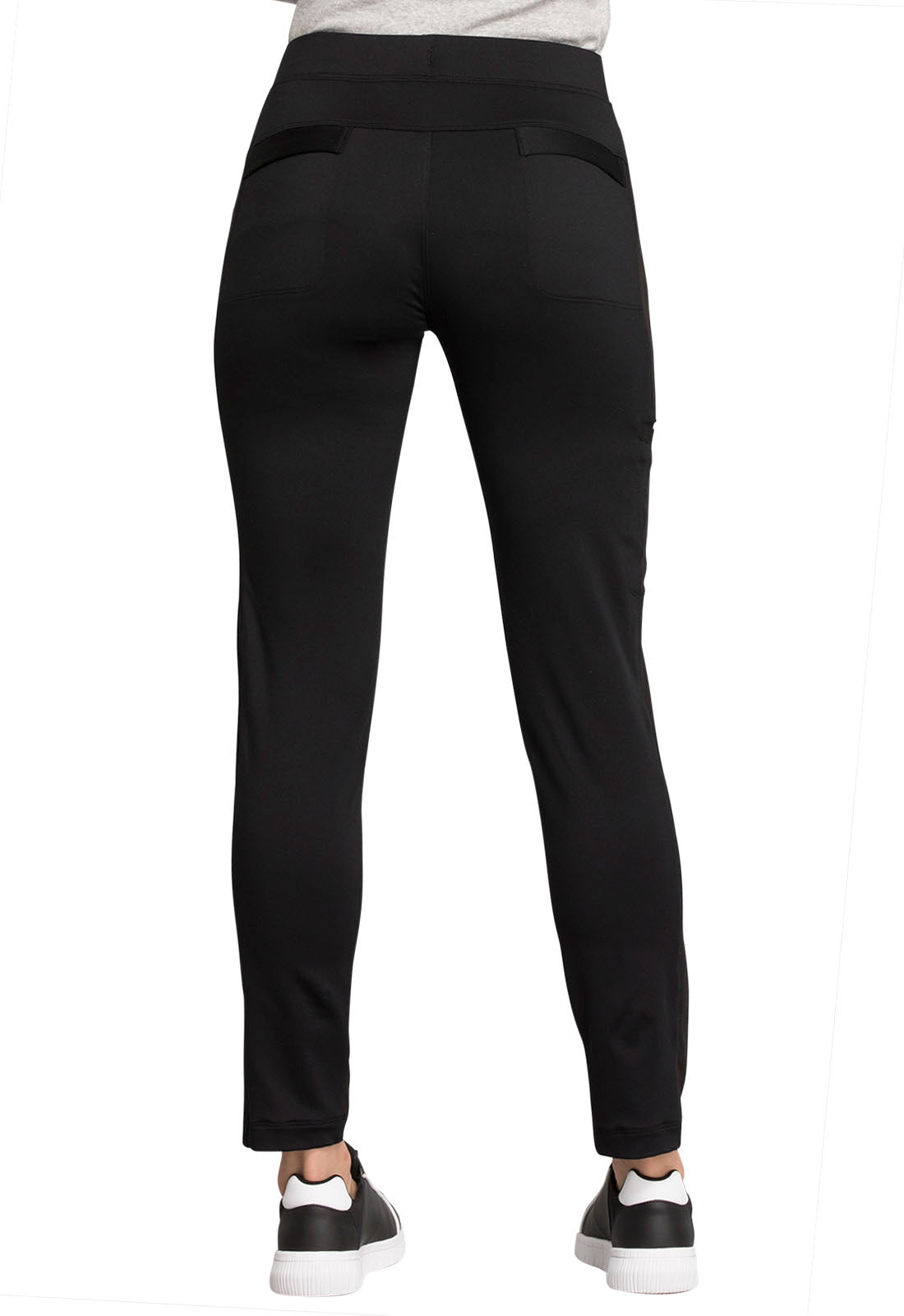 Pull-on styling, a figure-flattering cut, and a knit full back panel makes this mid rise pant a comfortable and elegant addition to your work wardrobe. Additional design details include a drawstring front, two angled front pockets, two angled zip pockets, a zip cargo pocket on the wearer's right, and back welt pockets. Rose gold hardware adds a sophisticated accent. Contemporary fit. Tapered leg, 10 1/2" opening. Inseam: 33". This elegant, linear texture stretch fabric and comfortable jersey knit is a chic pairing for stylish healthcare workers looking to make a STATEMENT.
