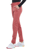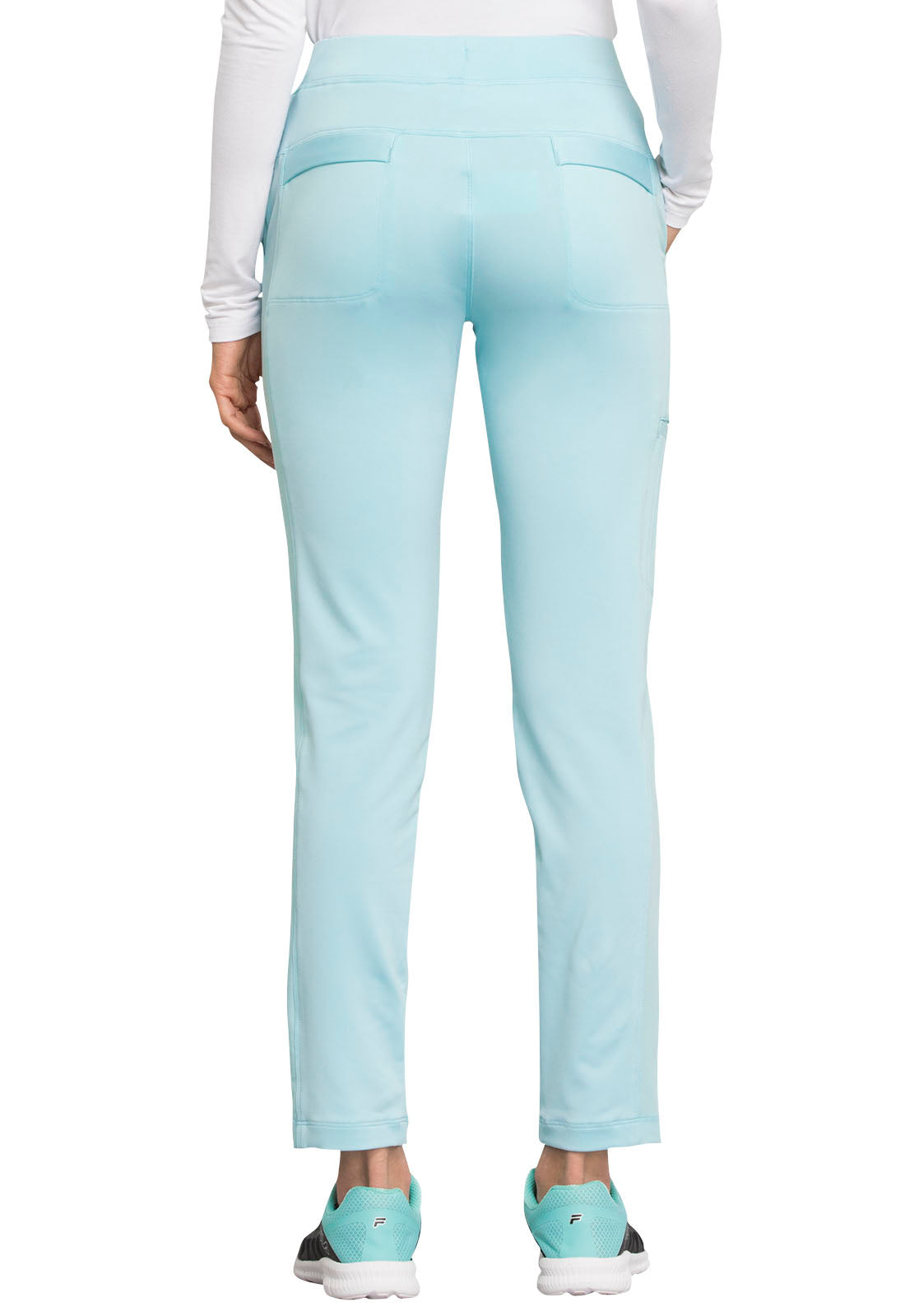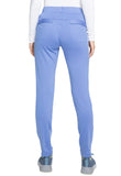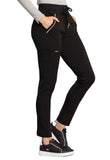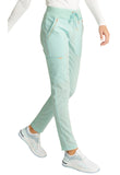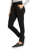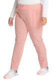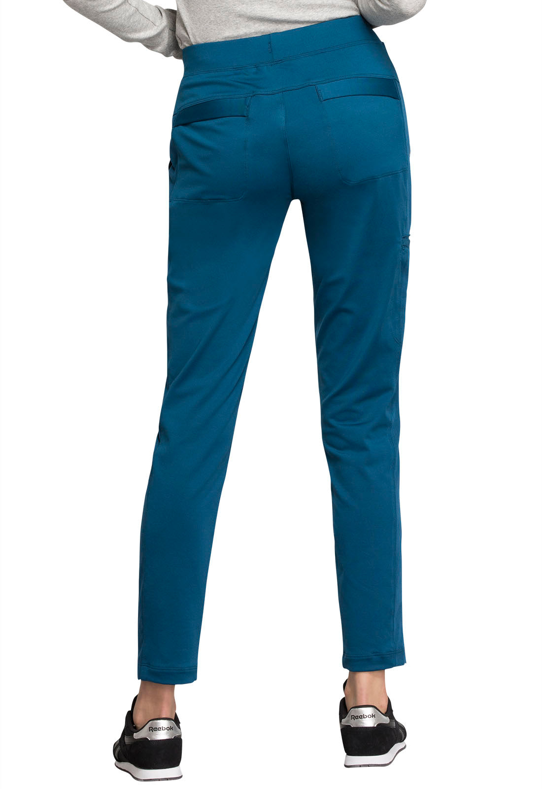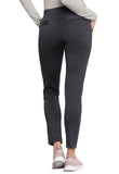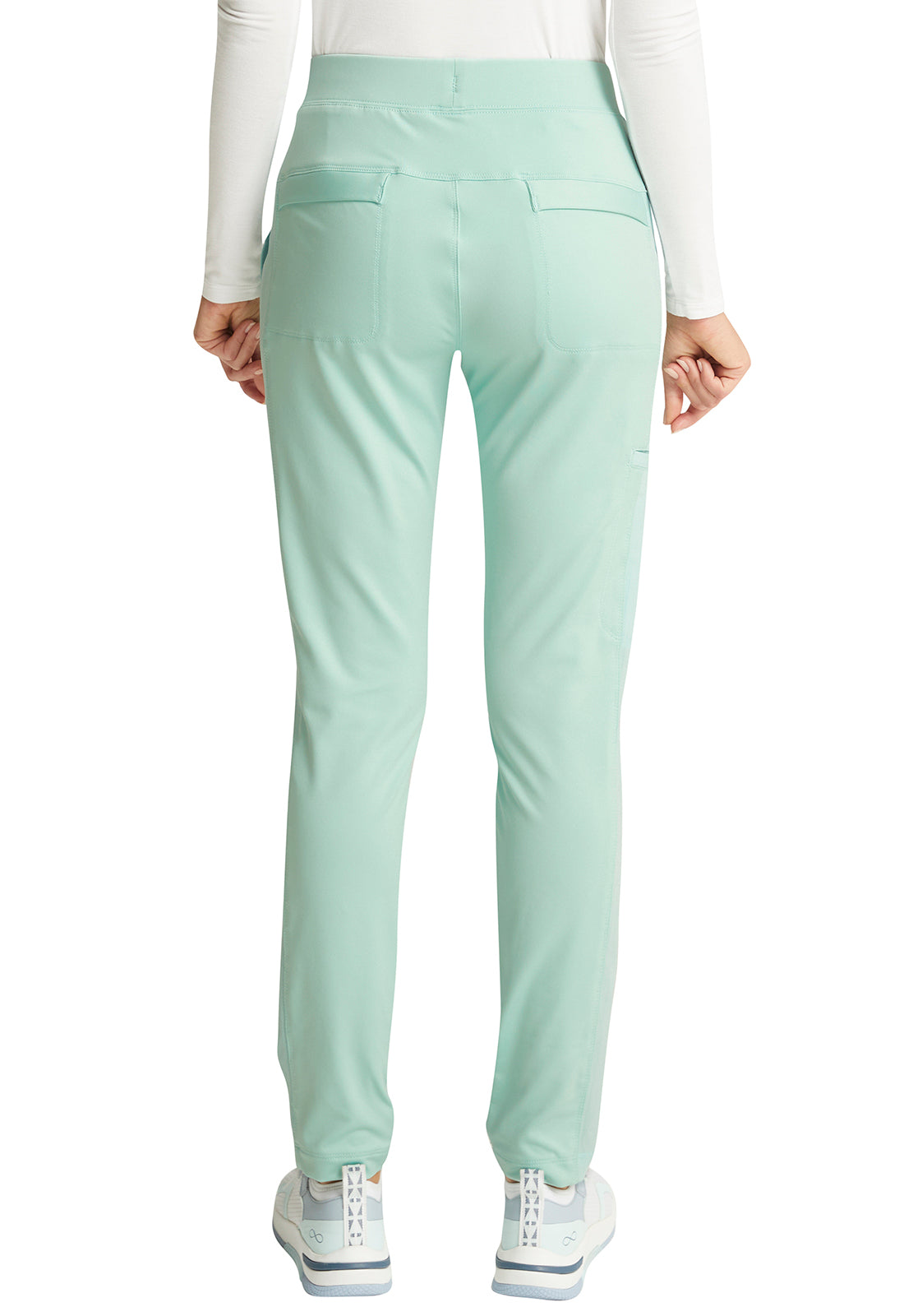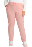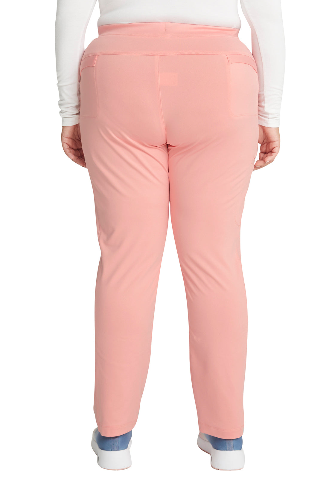 Pull-on styling, a figure-flattering cut, and a knit full back panel makes this mid rise pant a comfortable and elegant addition to your work wardrobe. Additional design details include a drawstring front, two angled front pockets, two angled zip pockets, a zip cargo pocket on the wearer's right, and back welt pockets. Rose gold hardware adds a sophisticated accent. Contemporary fit. Tapered leg, 10 1/2" opening. Inseam: 33". This elegant, linear texture stretch fabric and comfortable jersey knit is a chic pairing for stylish healthcare workers looking to make a STATEMENT.
