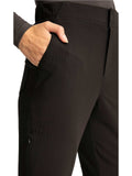 This Contemporary fit, natural rise pant has an interior elastic waistband and function front zip fly and snap closure. There are five pockets: two front angled pockets, one side-zip cargo pocket, and two back patch pockets. A full knit back panel gives the garment stylish comfort and ease of movement. Tapered leg, 10" opening. Inseam: 29