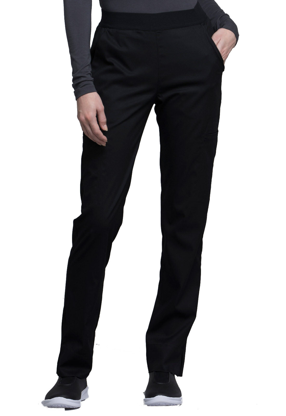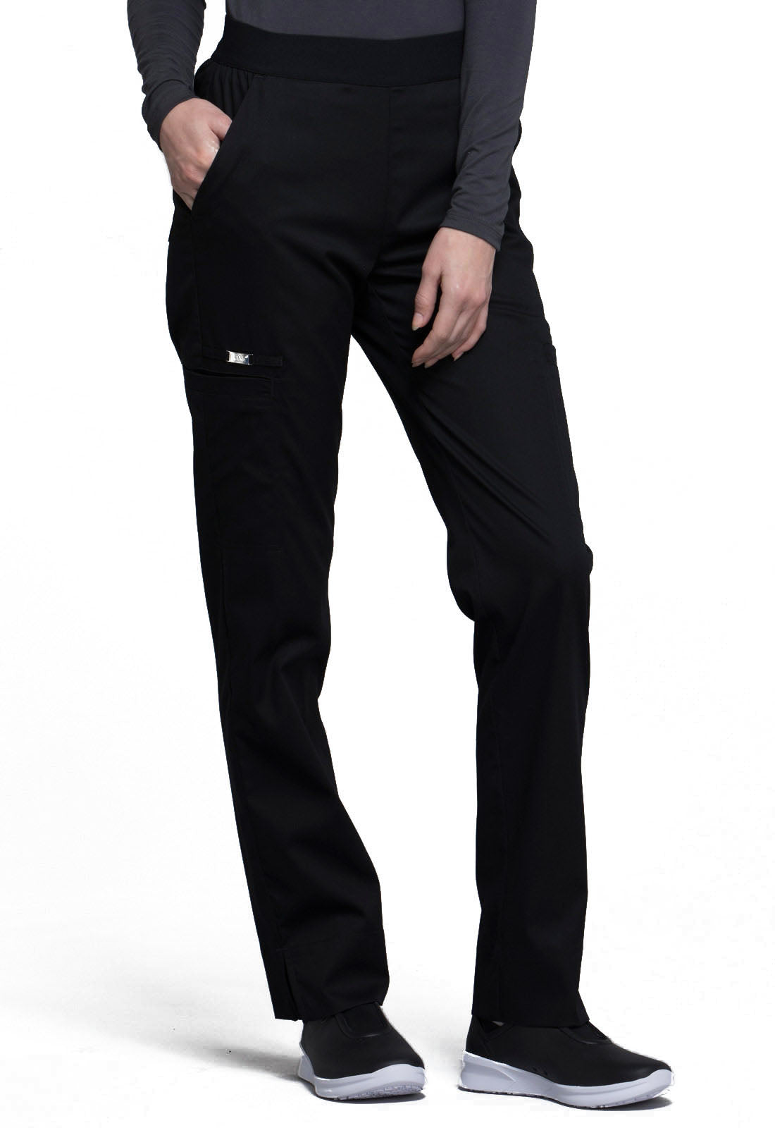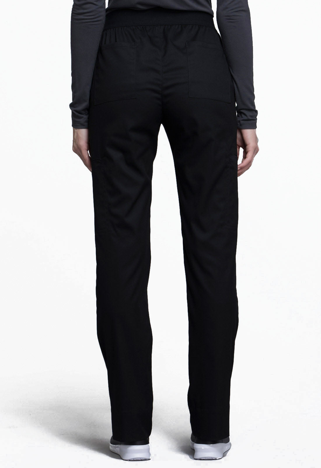 A Contemporary fit, natural rise, tapered leg pant features a full elastic waistband with front angled pockets. Also featured are two welt cargo pockets, two back patch pockets and an instrument loop. Inseam: 30"