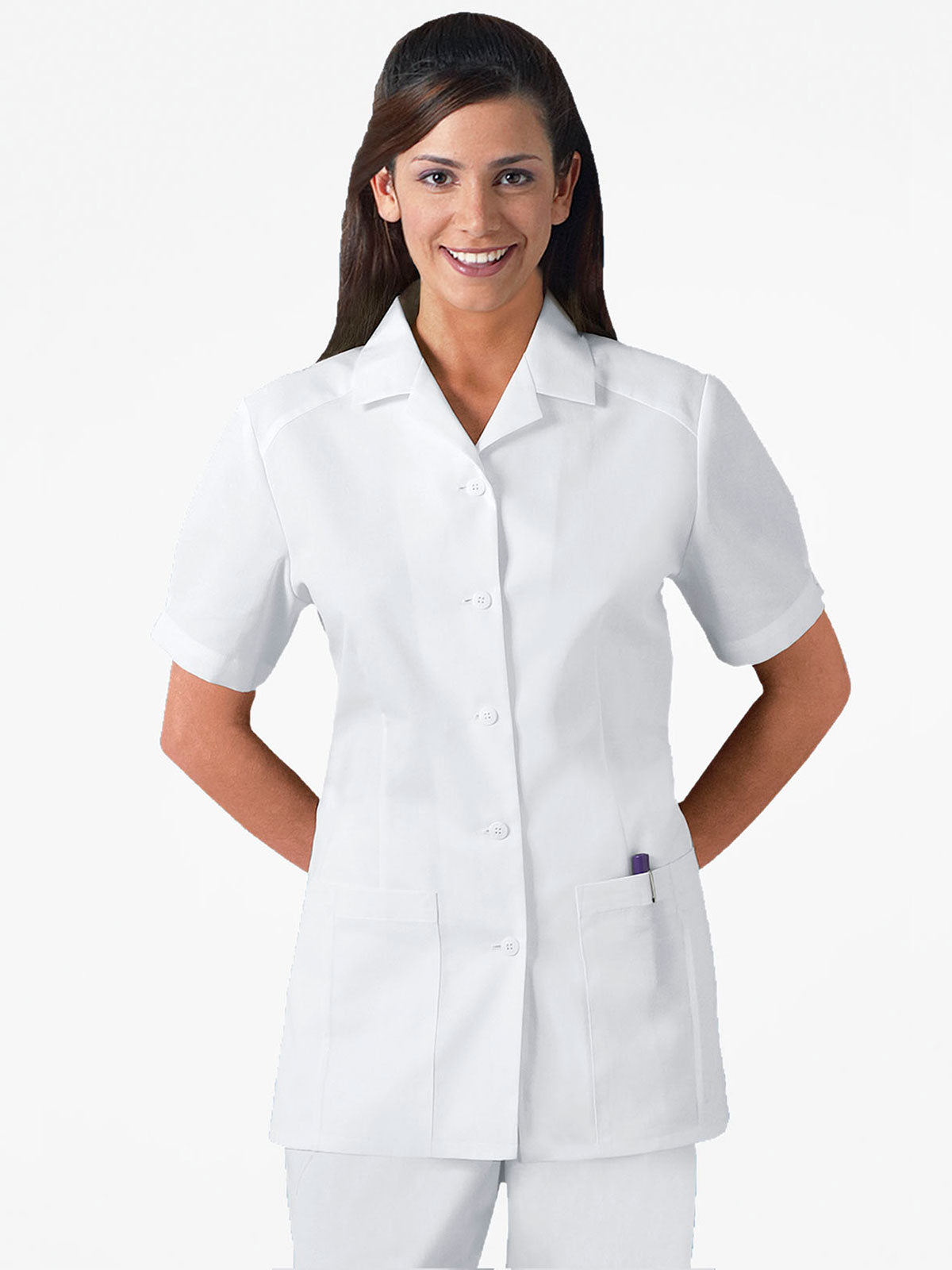 This medical uniform scrub top from Cherokee has a lapel collar and five-button front closure. It features a pleated, center back waist for shape. The front patch pockets have a pleated detail. It is 29" long and made of opaque "Can't See Through Me" poly/cotton poplin.