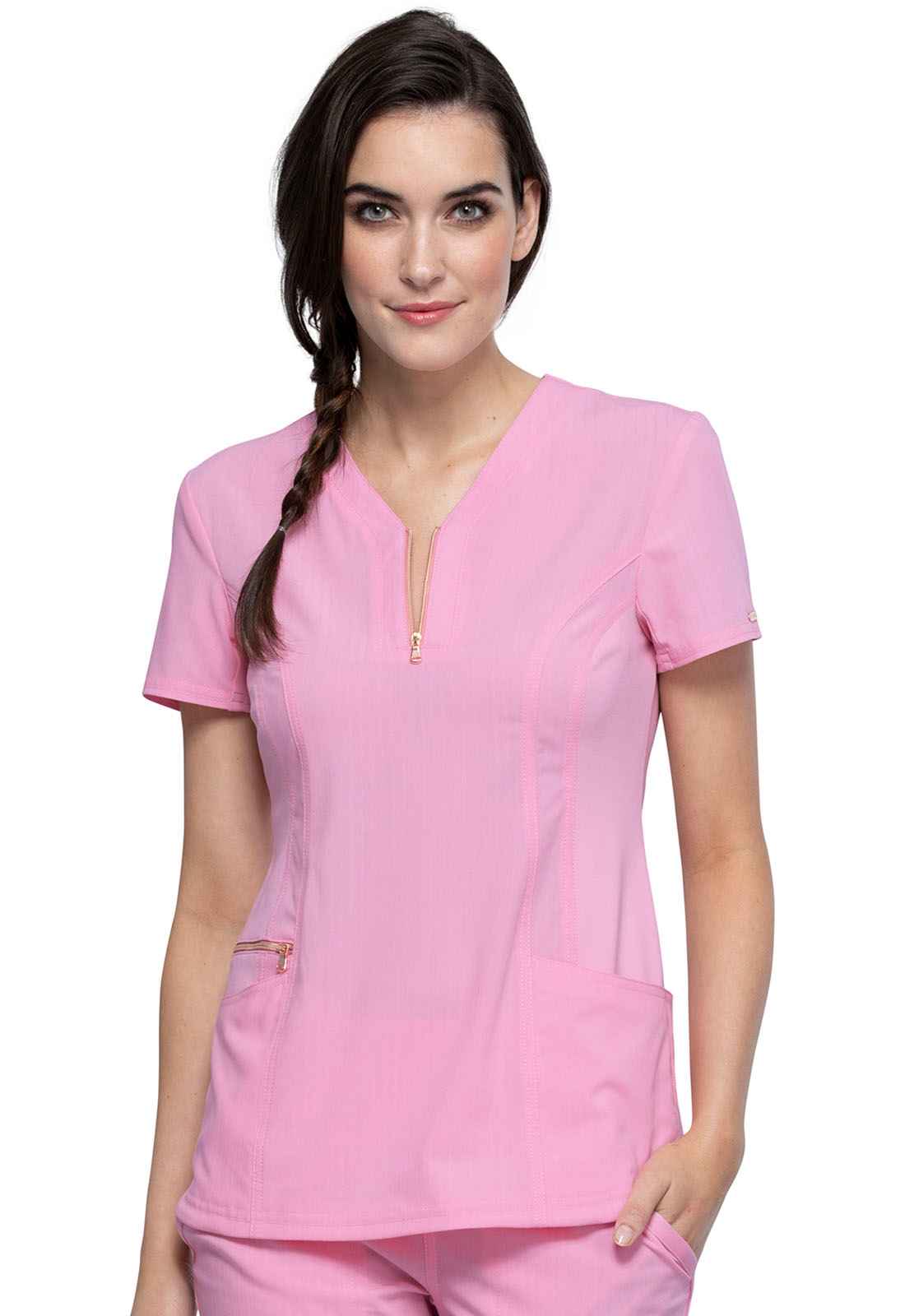 | This Y-neck top is adorned with a partial front rose-gold zipper and features comfortable and slimming side and center back knit panels. A rounded shirttail hem complete this stylish look along with multiple pockets; two rounded front roomy pockets, a secured zip right side pocket and two back side pockets. Contemporary Fit. Center Back: 26". This elegant, linear texture stretch fabric and comfortable jersey knit is a chic pairing for stylish healthcare workers looking to make a STATEMENT. |