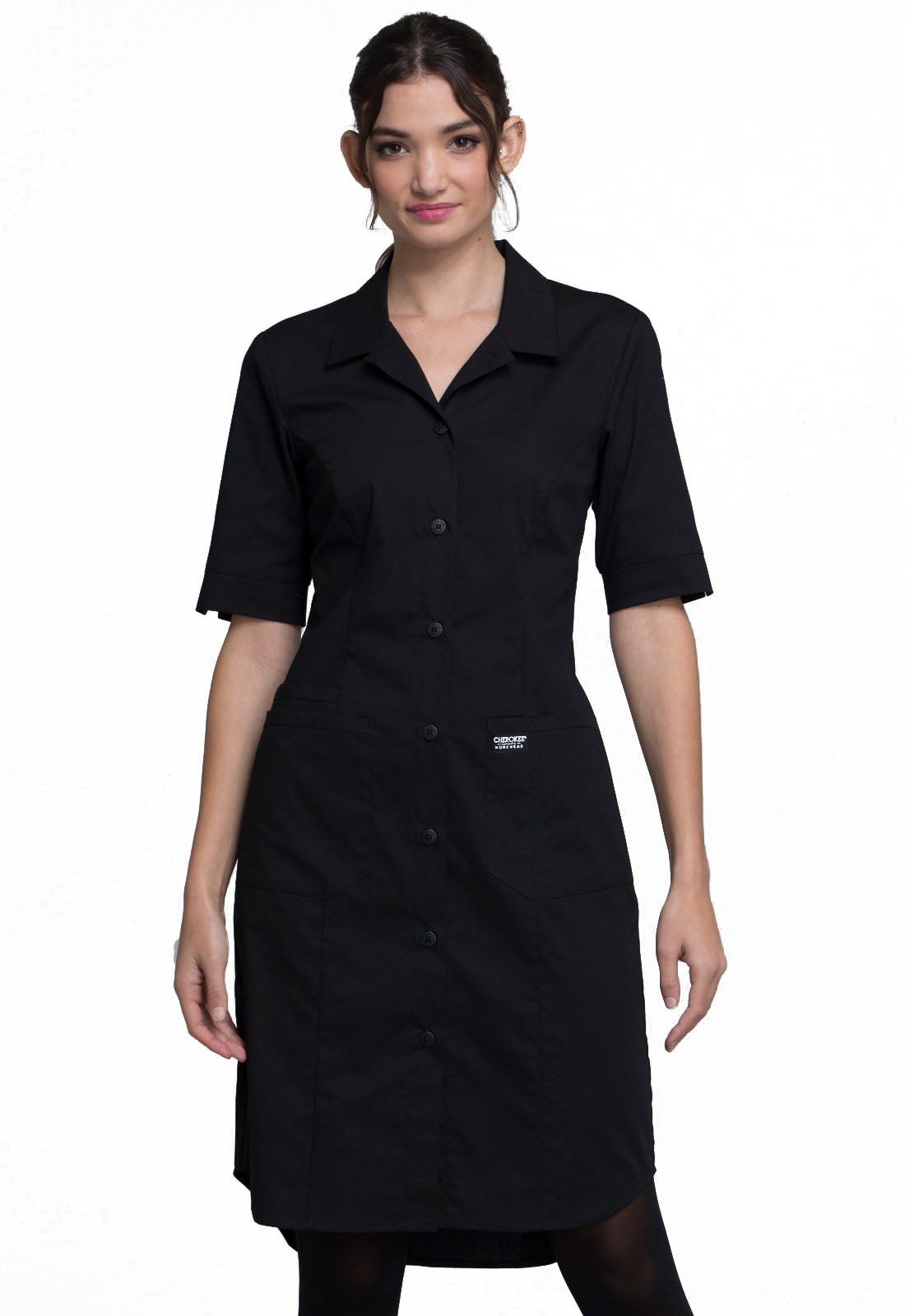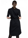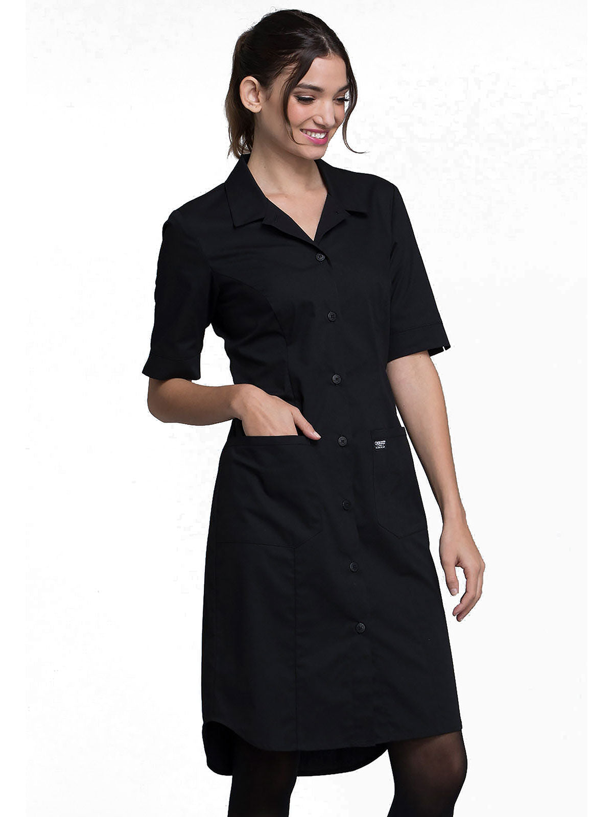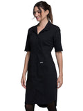 A Modern Classic fit dress features a notch collar and logo buttons. Princess seams front and back, elbow length sleeves, one cell pocket and two patch pockets. A flattering slight high low shirttail hem. Center back length: 41 1/2”