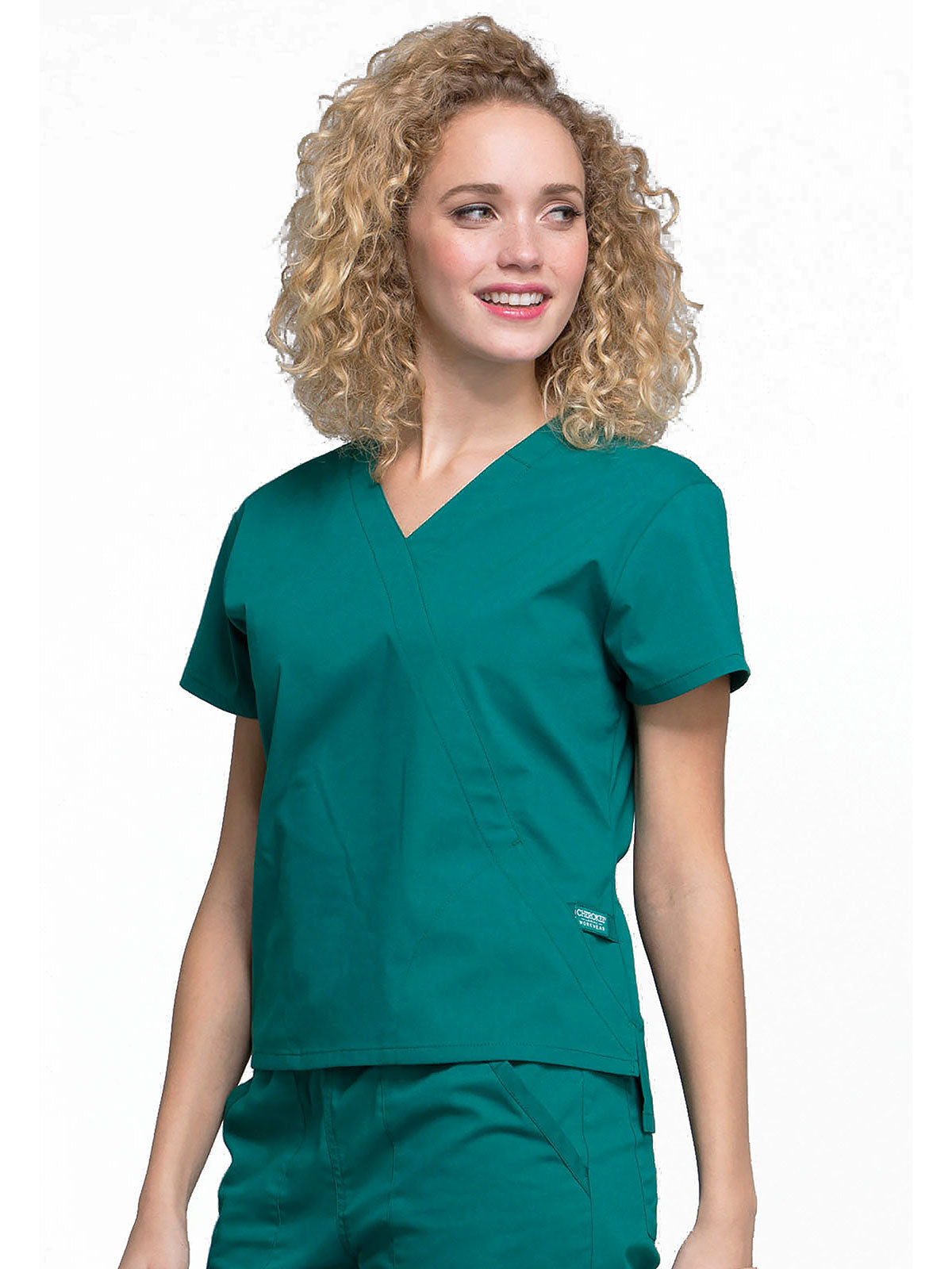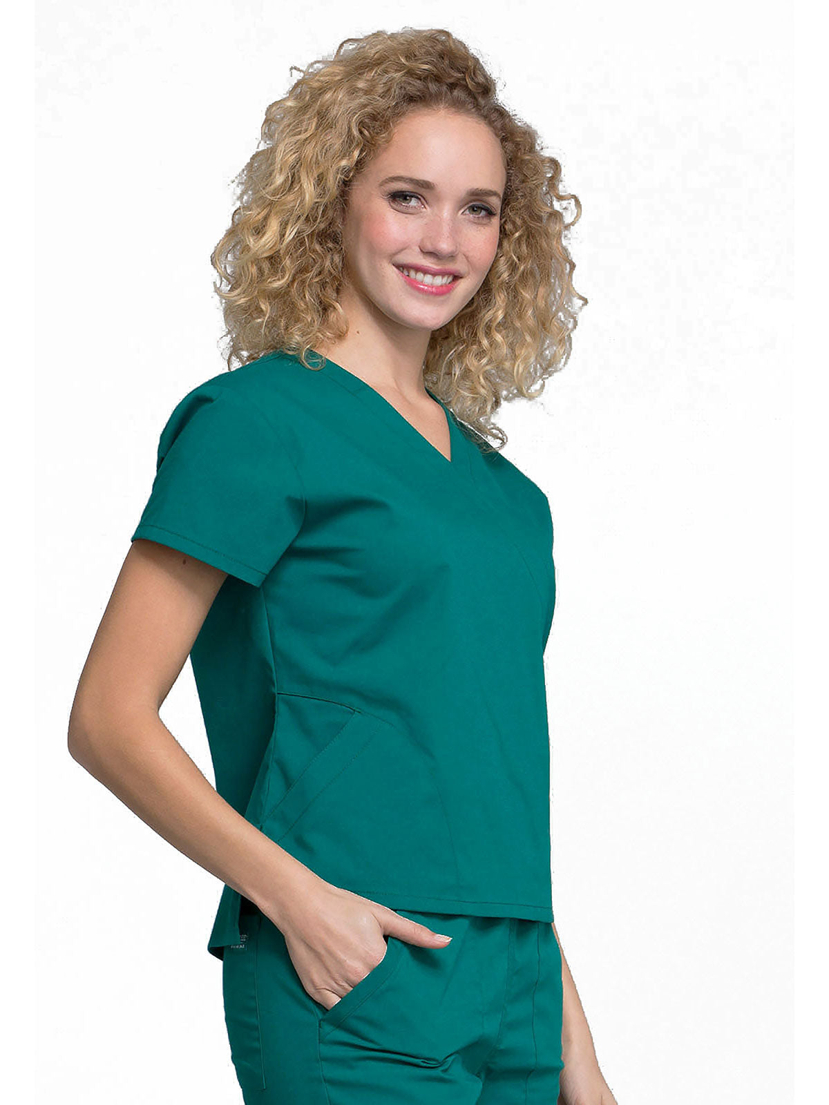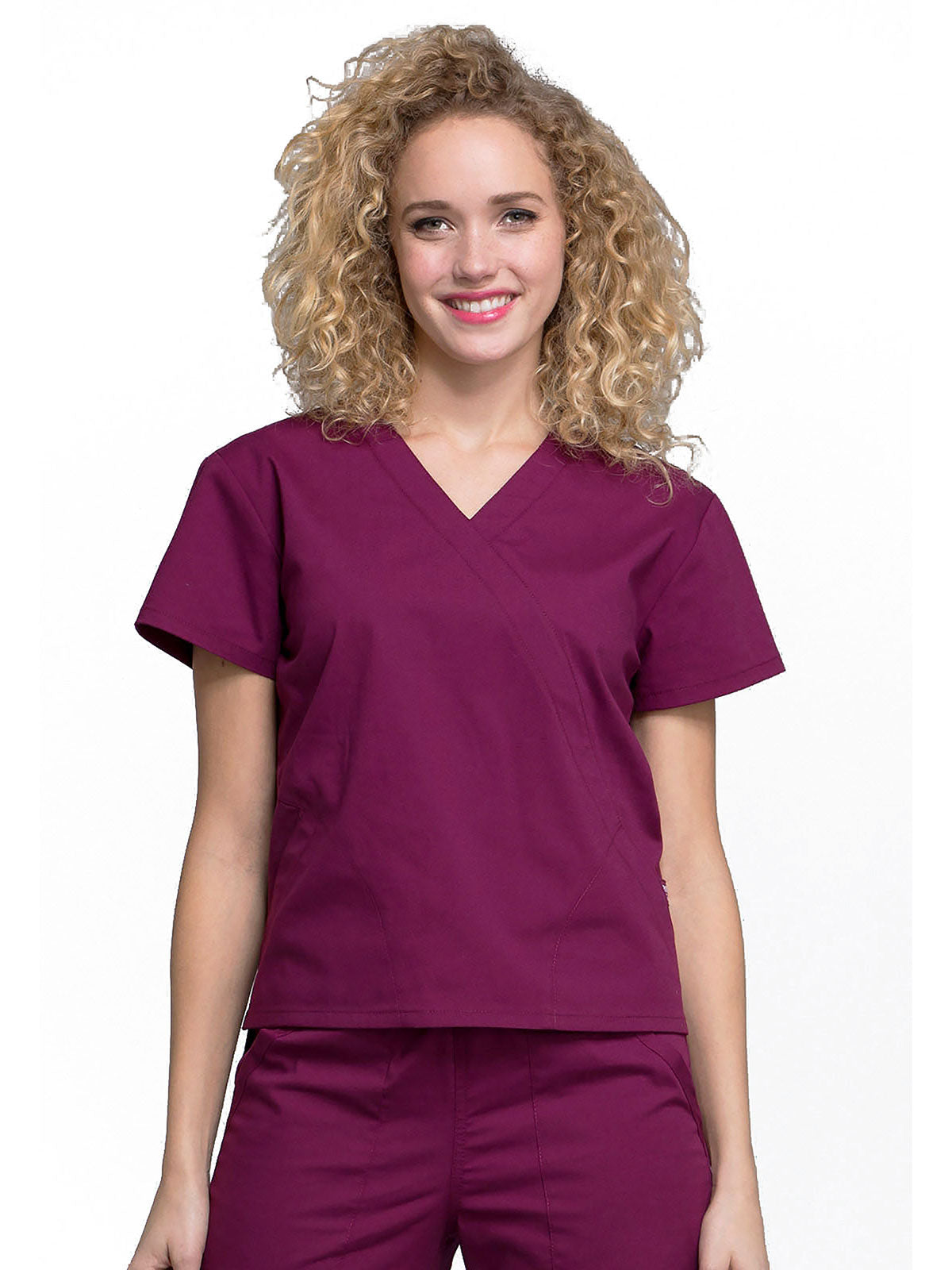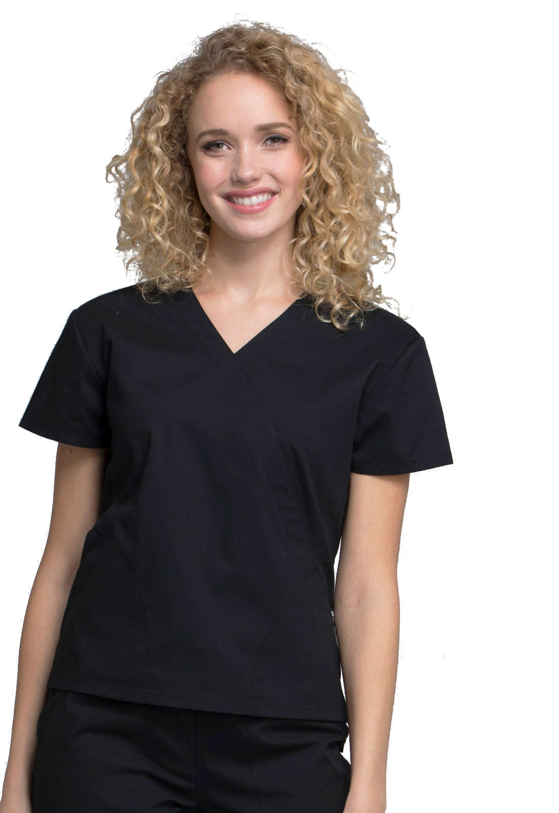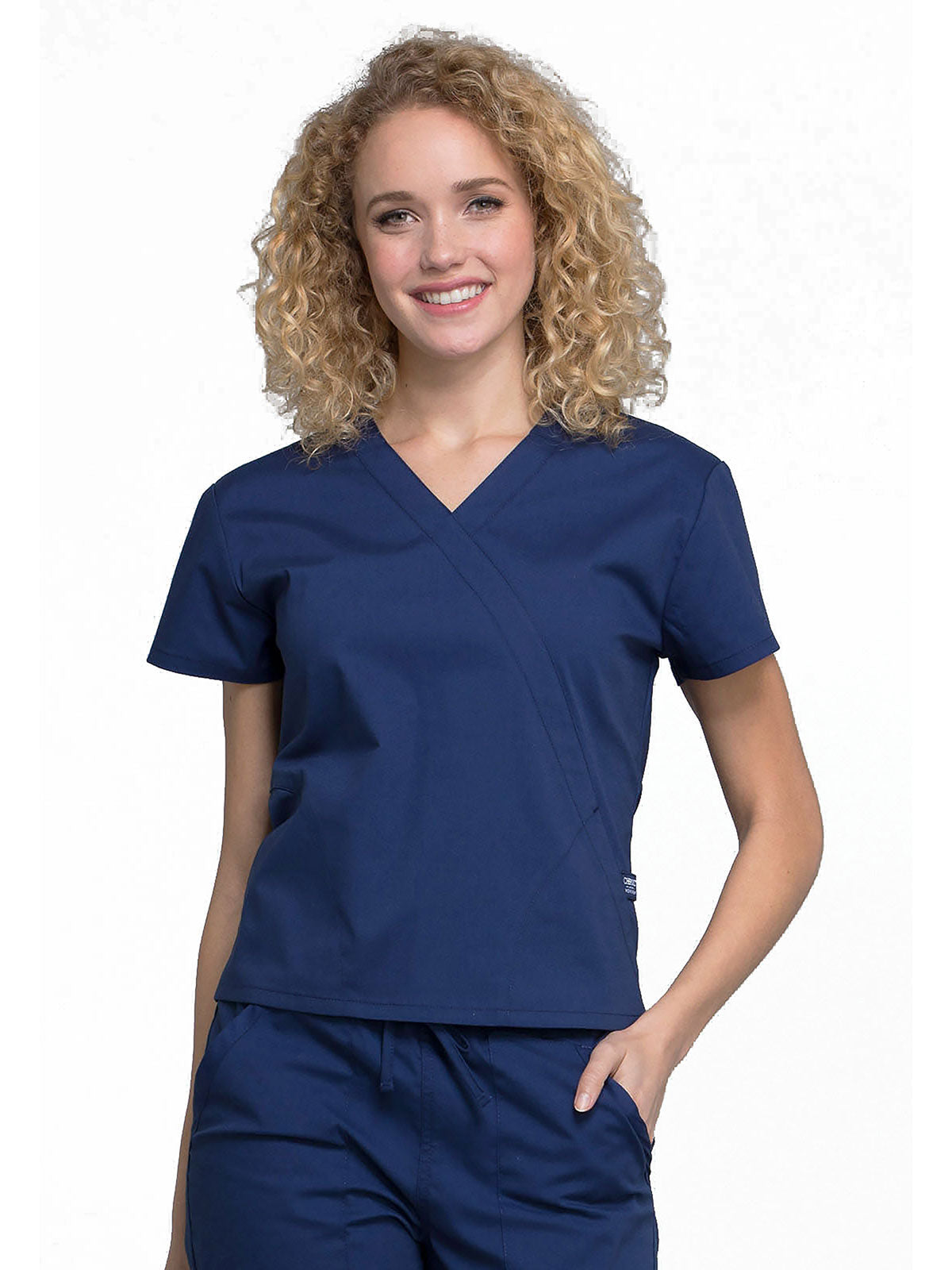 A Modern Classic fit mock wrap top features two pockets and logo label with instrument loop. High low step hem and side vents. Center back length: 23"