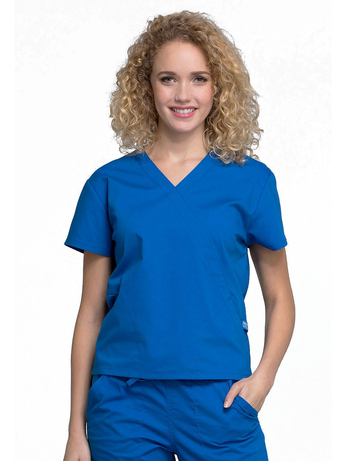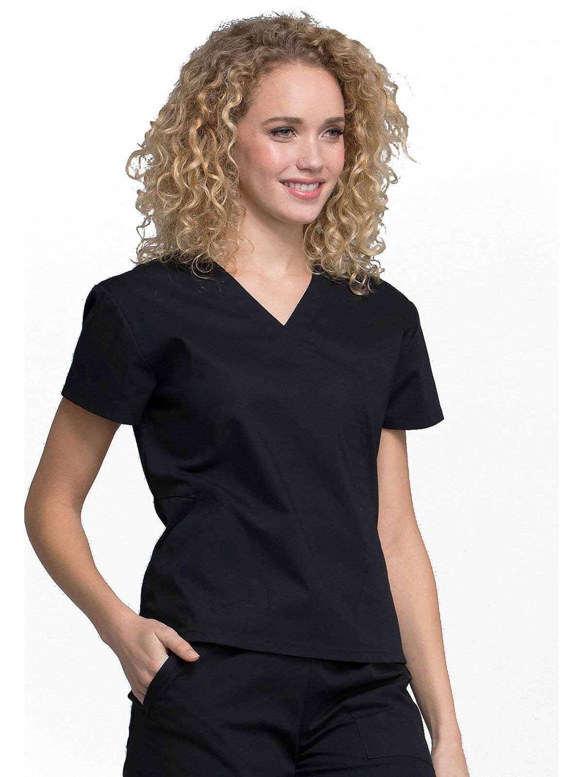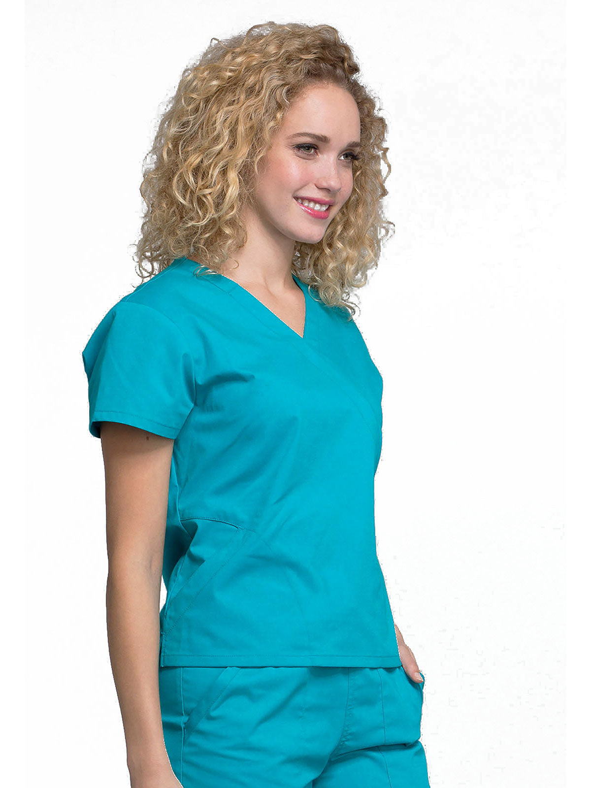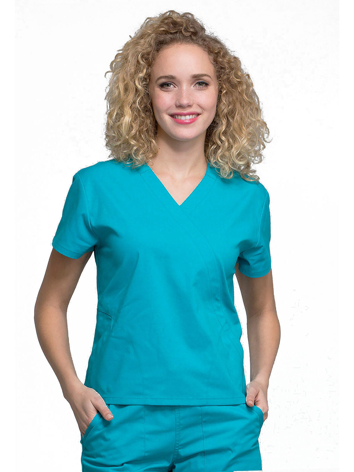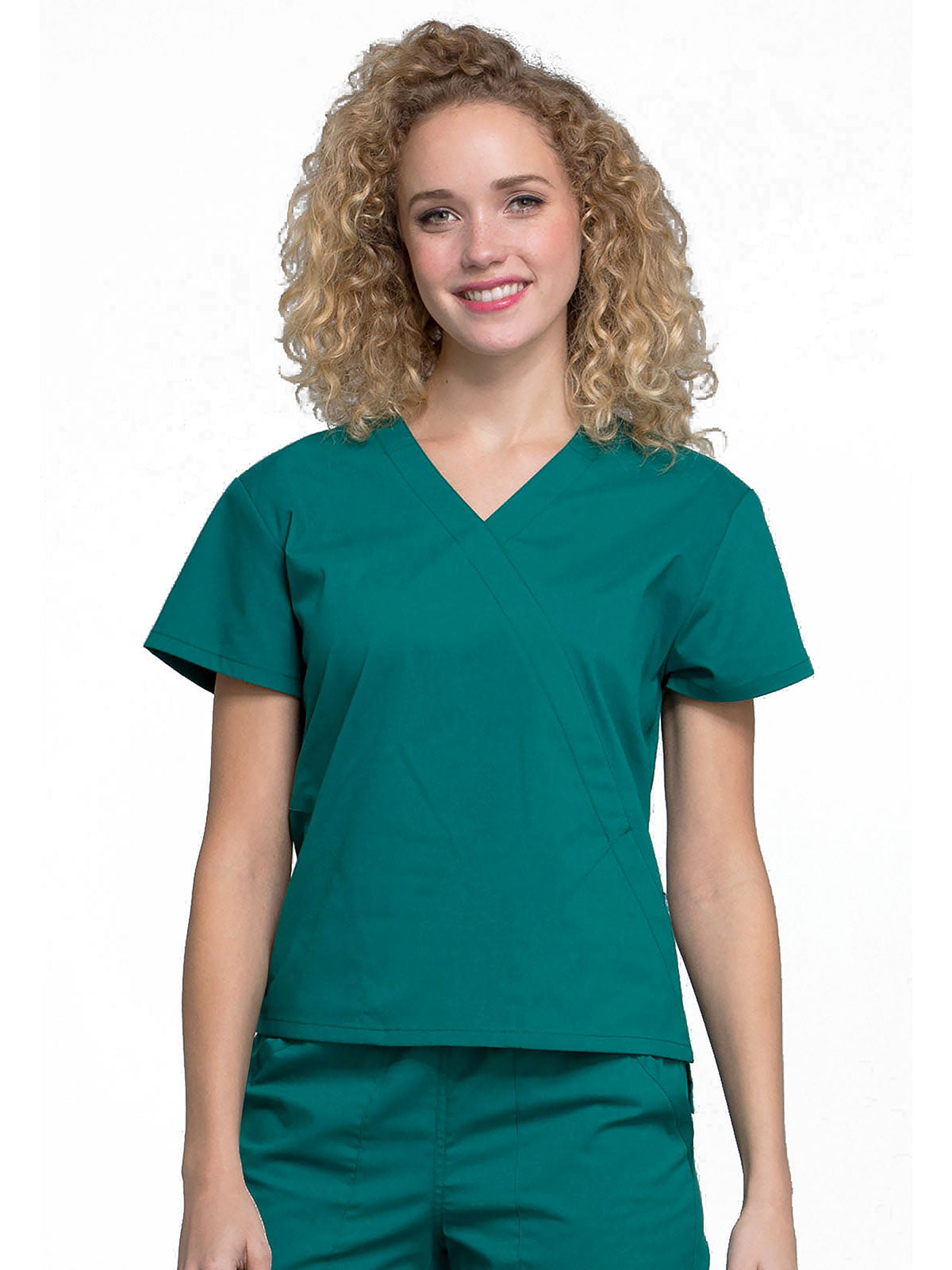 A Modern Classic fit mock wrap top features two pockets and logo label with instrument loop. High low step hem and side vents. Center back length: 23"