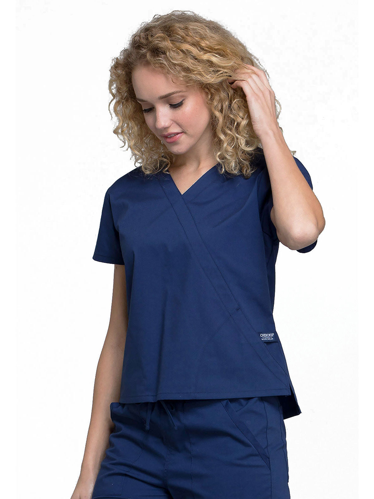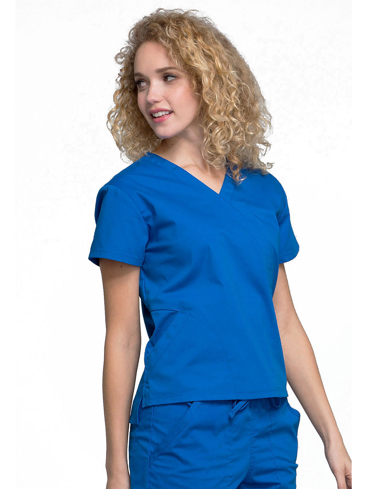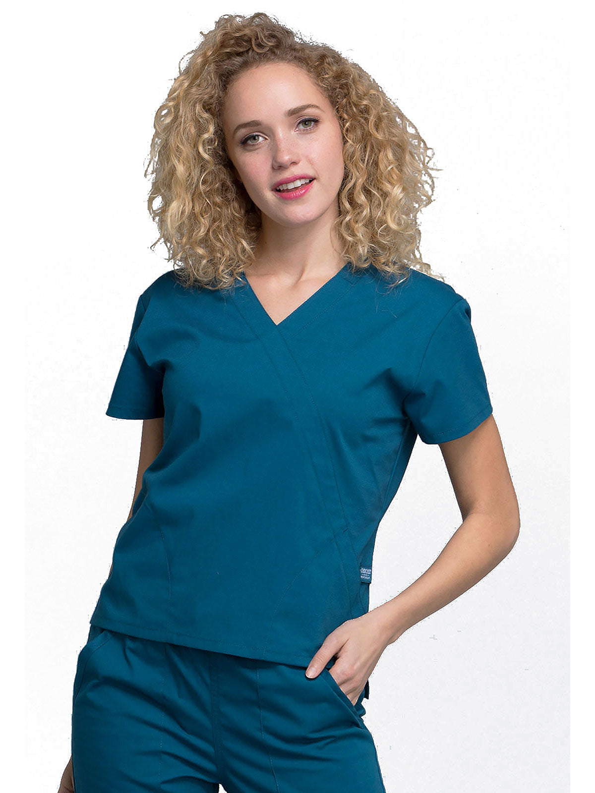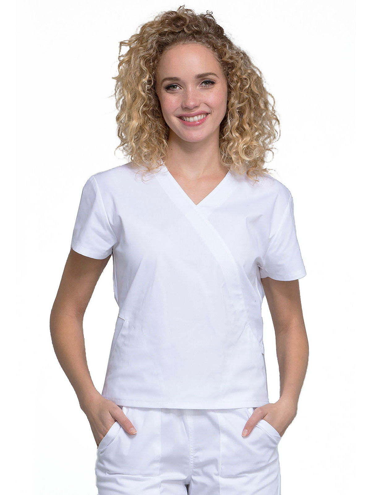 A Modern Classic fit mock wrap top features two pockets and logo label with instrument loop. High low step hem and side vents. Center back length: 23"