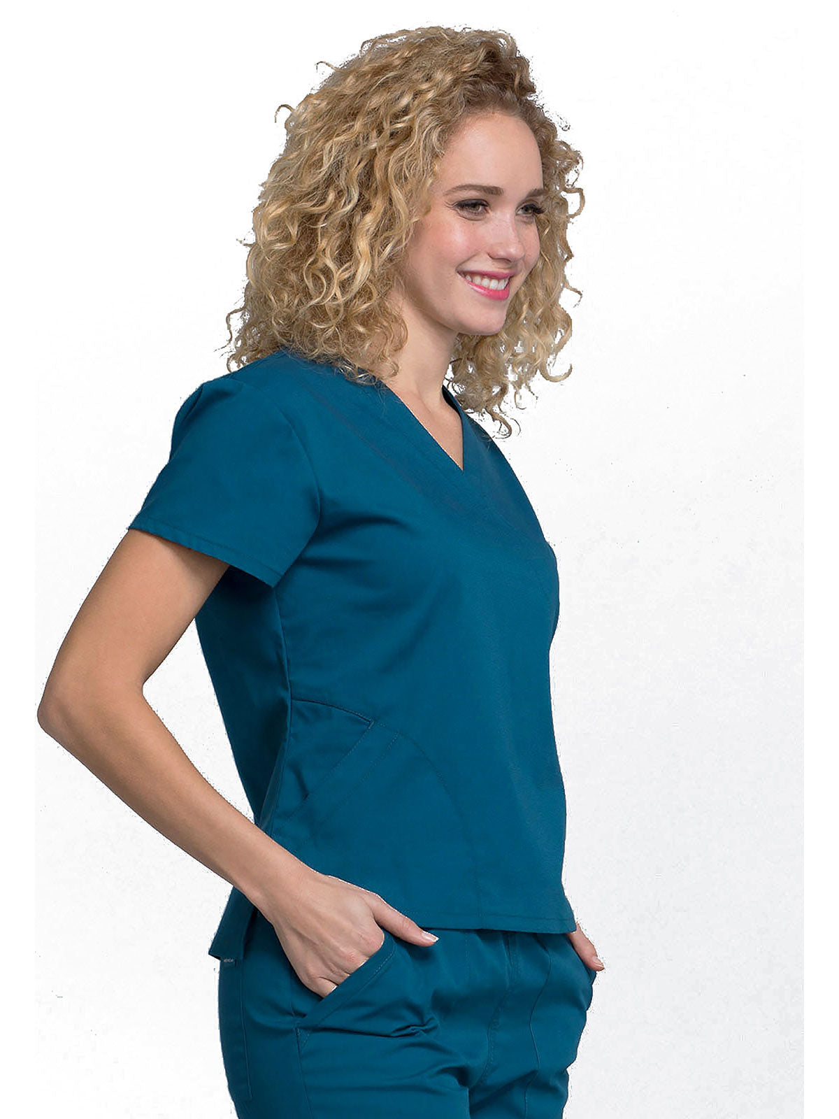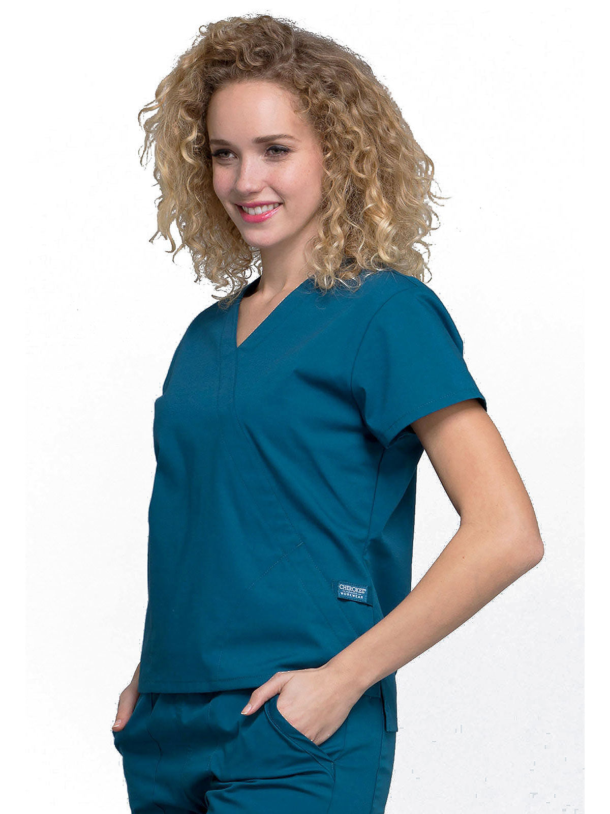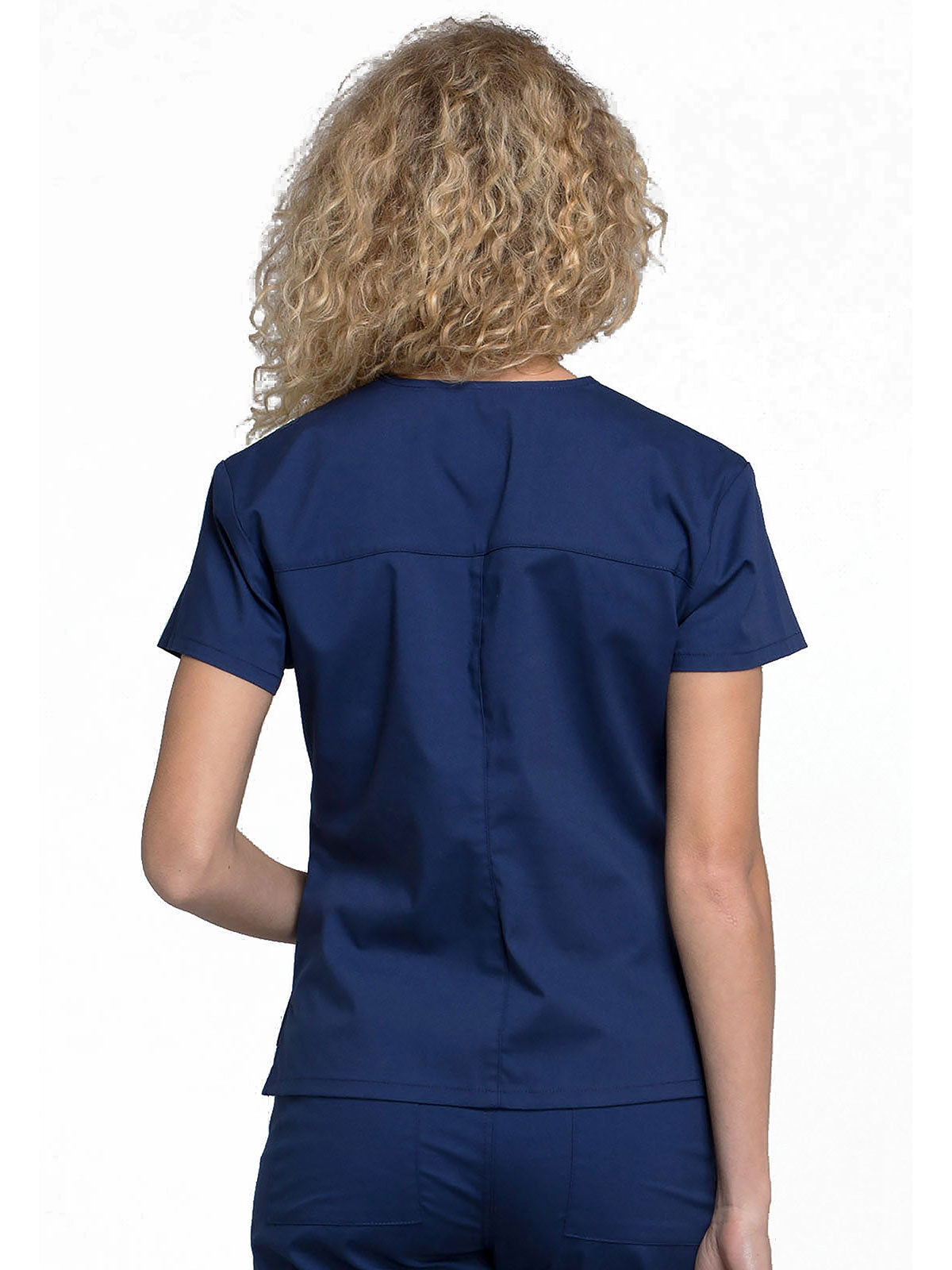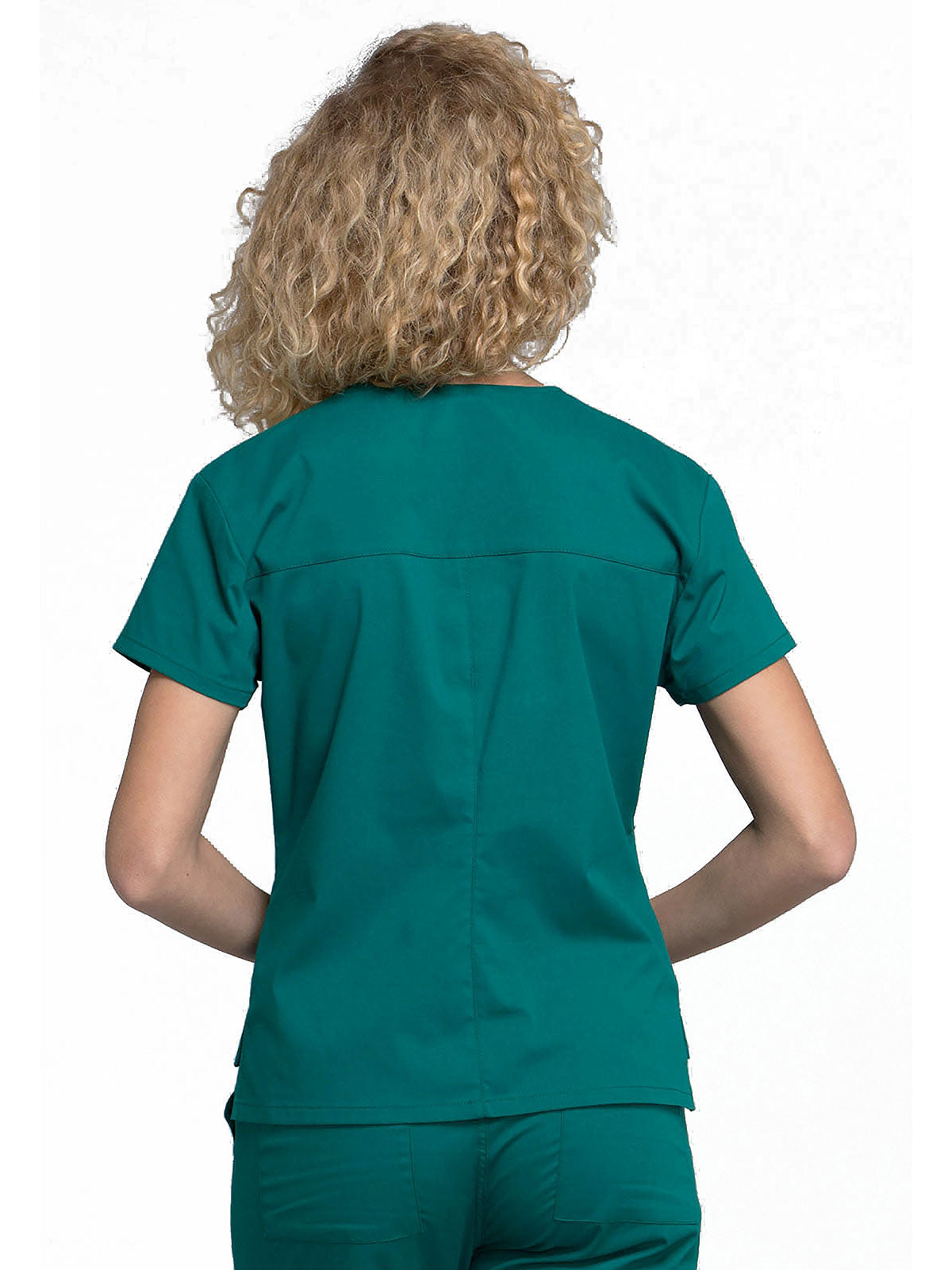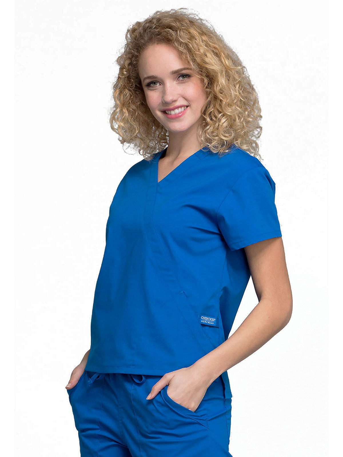 A Modern Classic fit mock wrap top features two pockets and logo label with instrument loop. High low step hem and side vents. Center back length: 23"