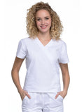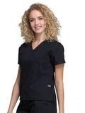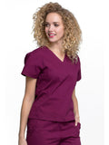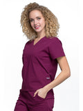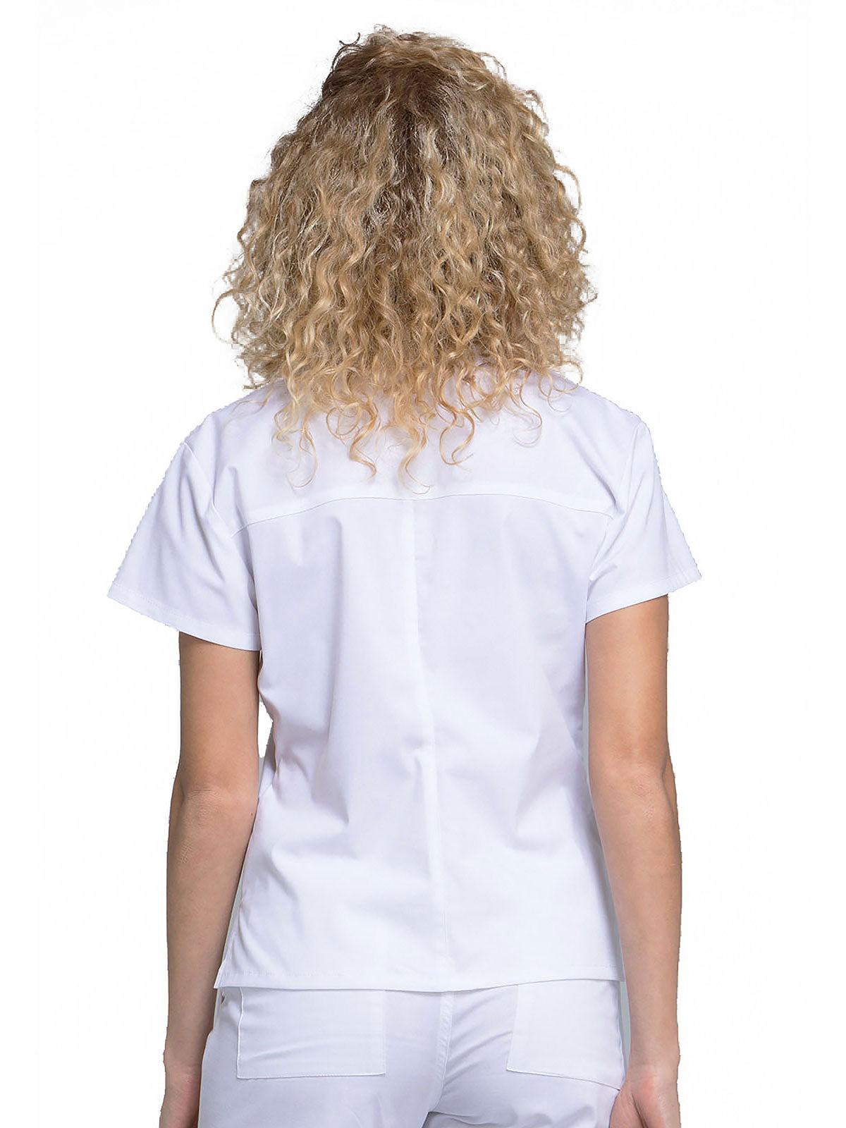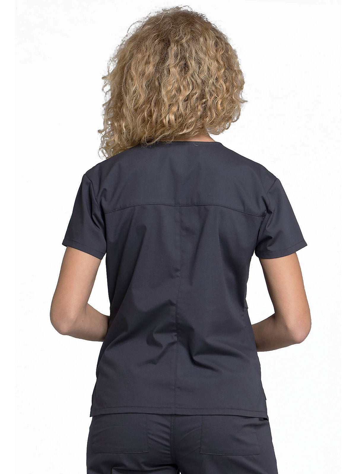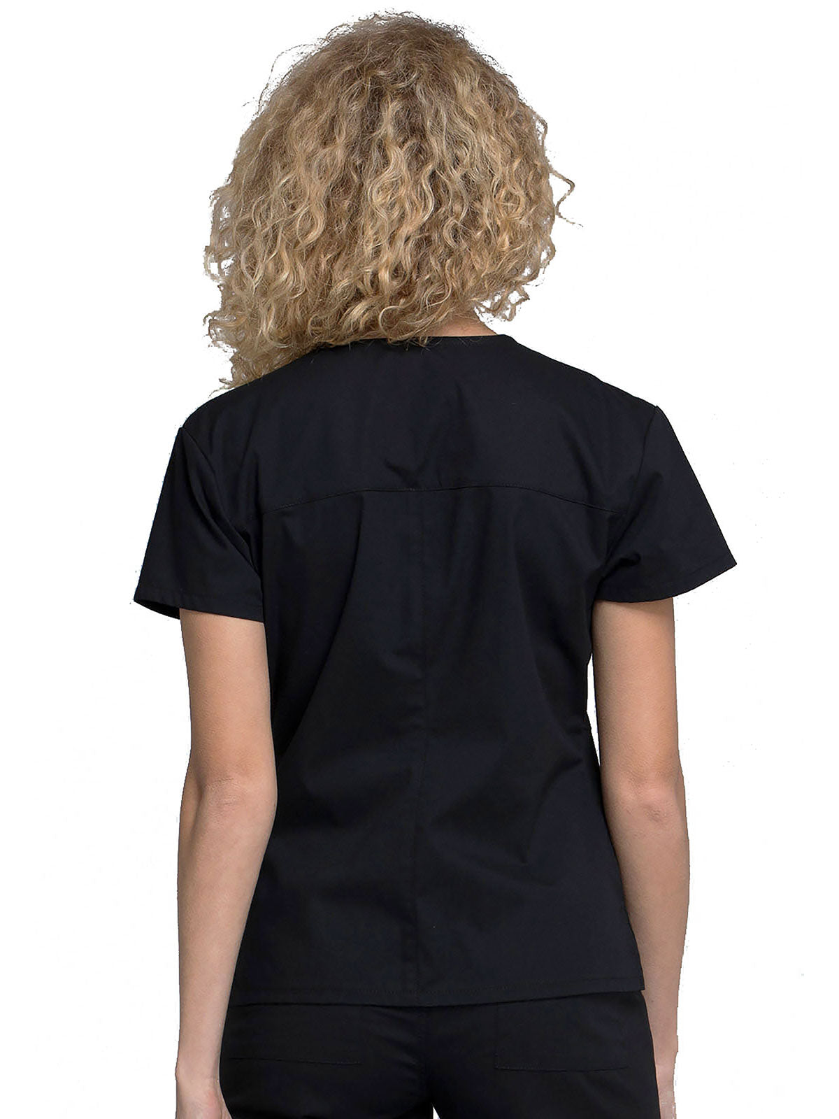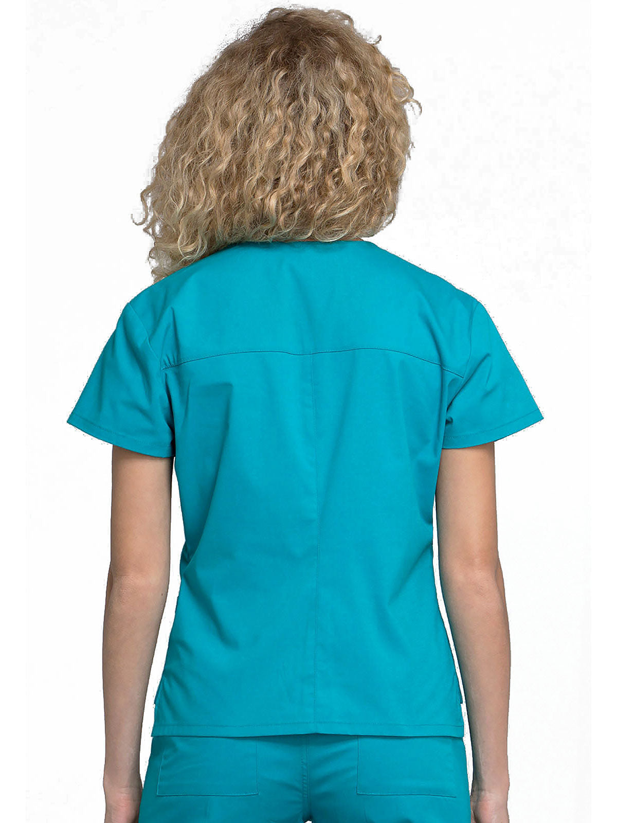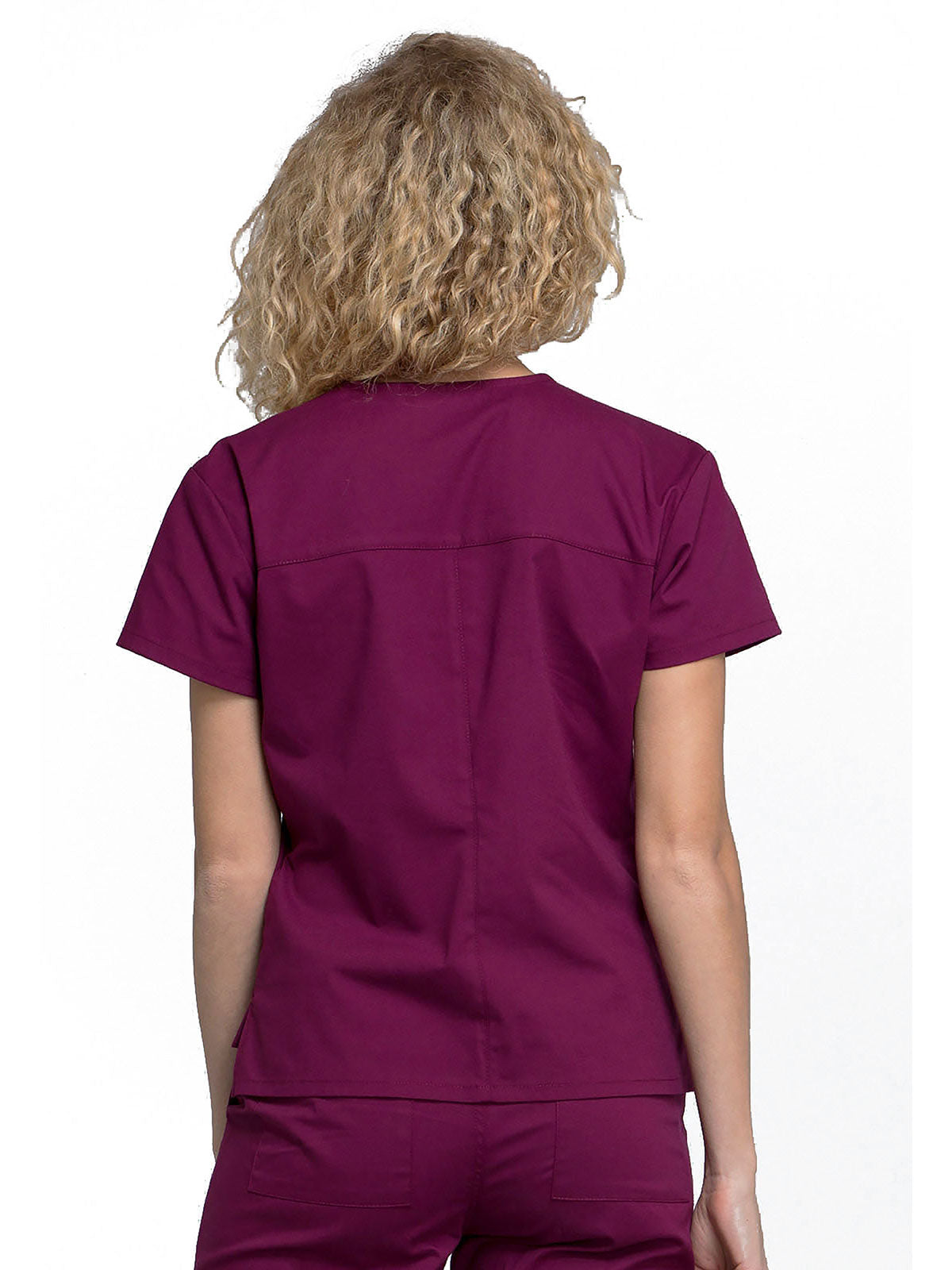 A Modern Classic fit mock wrap top features two pockets and logo label with instrument loop. High low step hem and side vents. Center back length: 23"