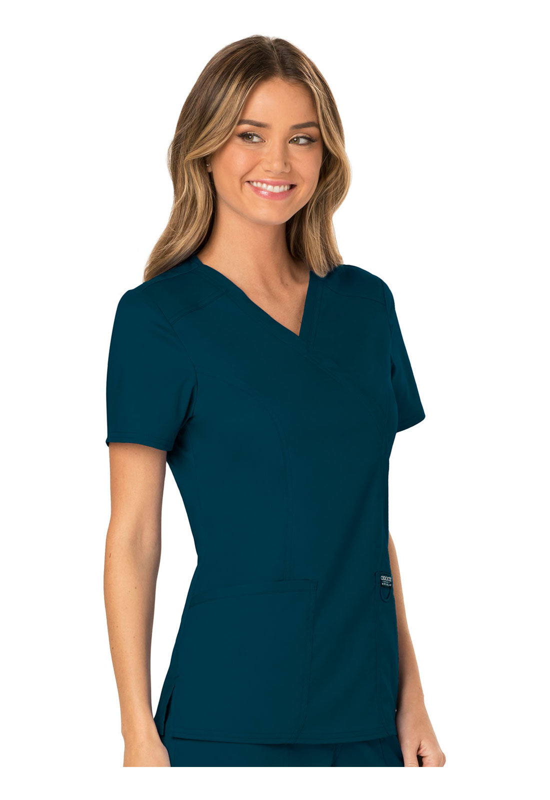 A Modern Classic fit mock wrap top features front shoulder yokes, two patch pockets, instrument loop, logo label with bungee loop, front and back princess seams and side vents. Center back length: 26"