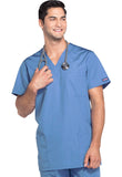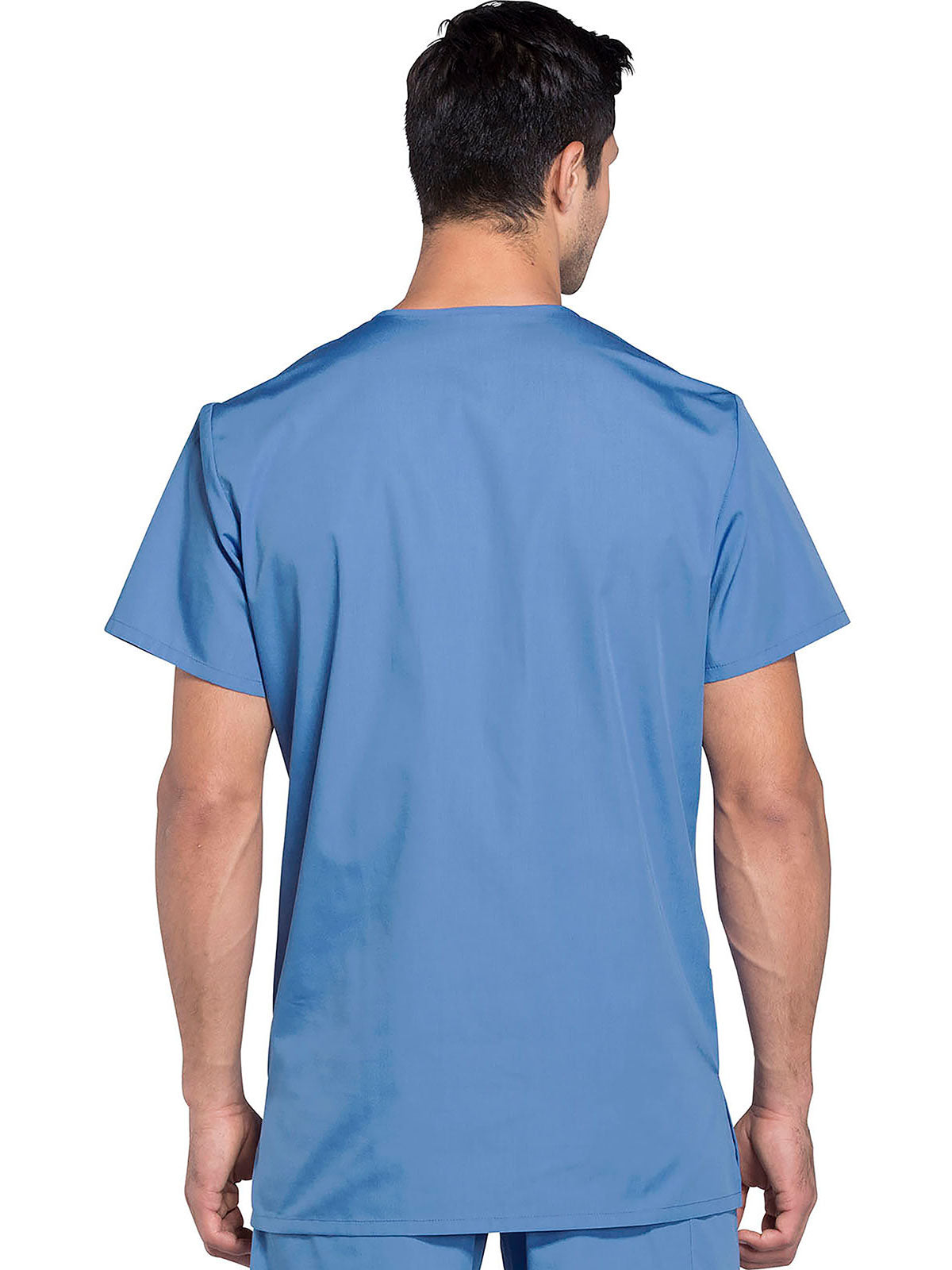 This Unisex Traditional fit V-neck top has one chest pocket and two patch pockets. Side vents. Center back length 32".