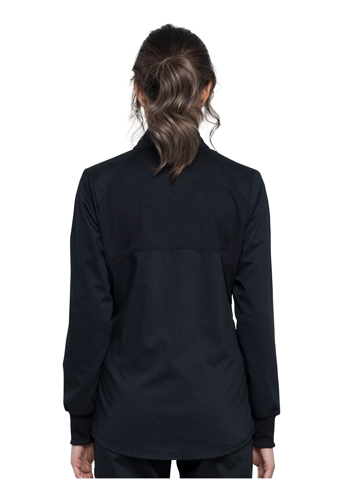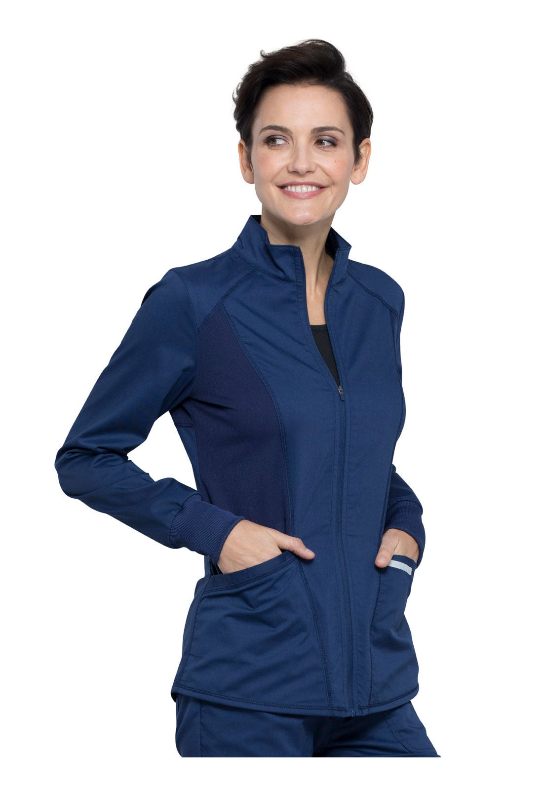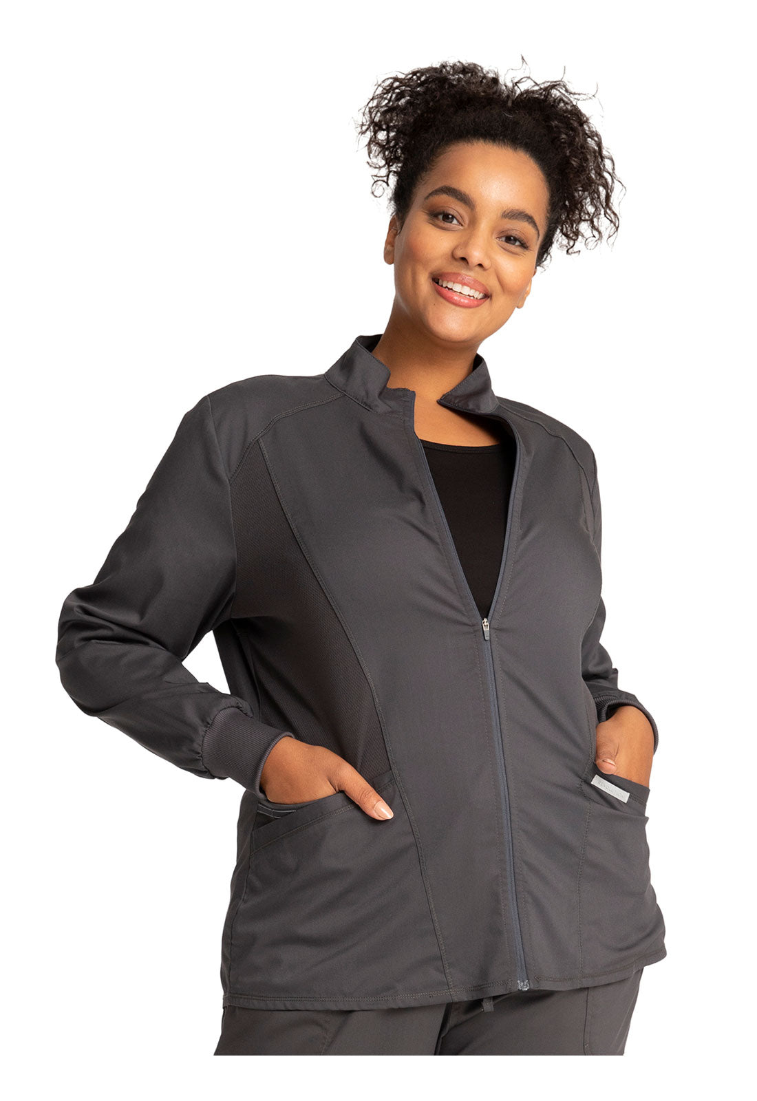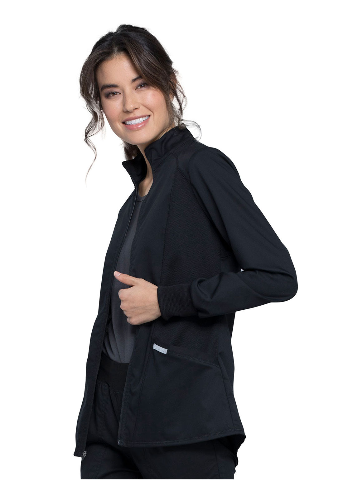 Hello High-Low! This active inspired zip up jacket features a high-low shirttail hemline and a breathable mesh at the front princess panels and back should panel. Two angled patch pockets, one cell pocket with reflective instrument loop, back locker loop and soft rib cuffs finish this look. Modern Classic fit. Center back length: 27"
