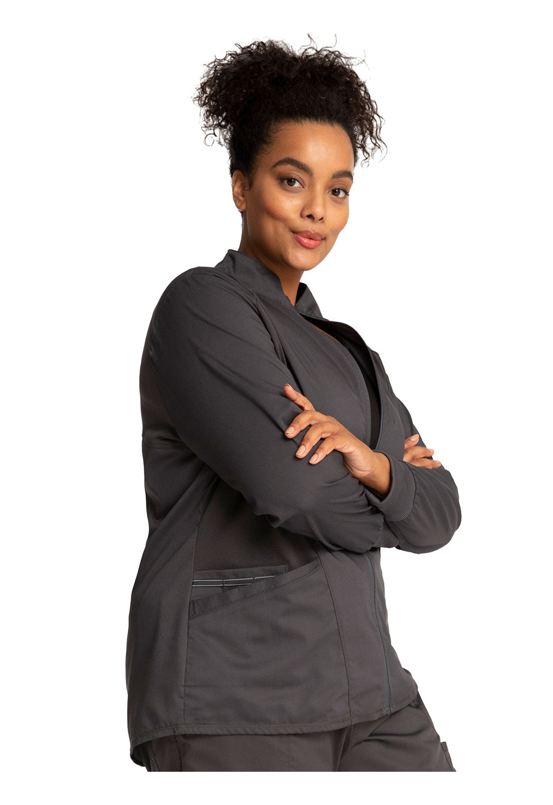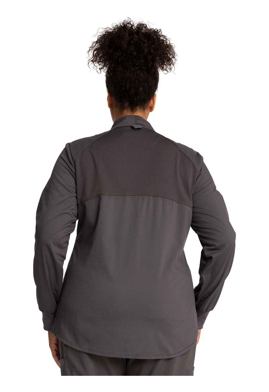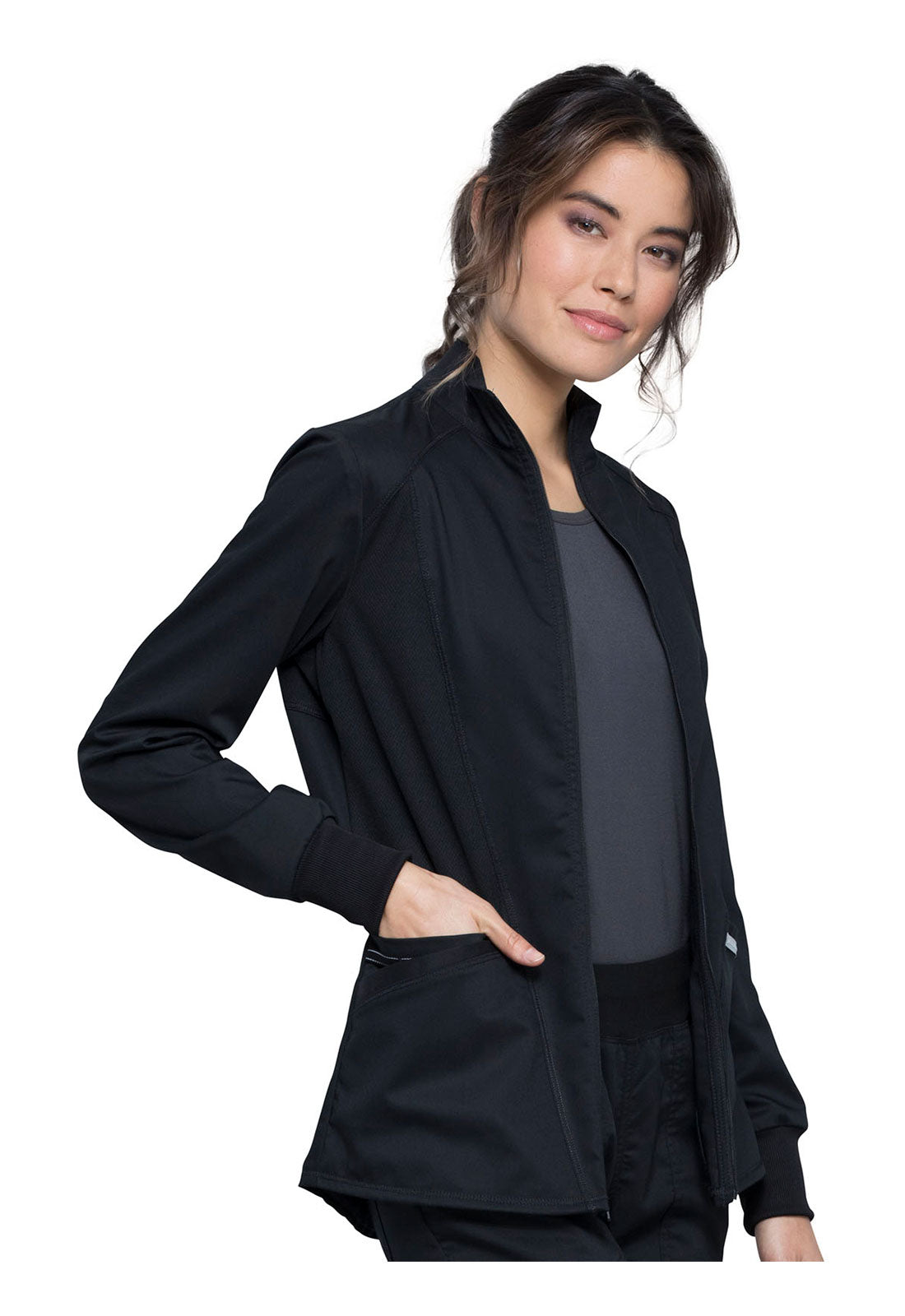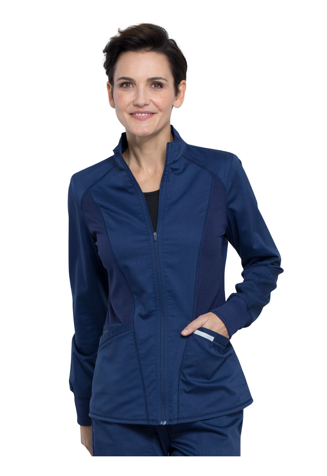 Hello High-Low! This active inspired zip up jacket features a high-low shirttail hemline and a breathable mesh at the front princess panels and back should panel. Two angled patch pockets, one cell pocket with reflective instrument loop, back locker loop and soft rib cuffs finish this look. Modern Classic fit. Center back length: 27"