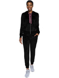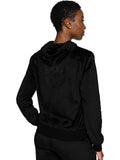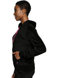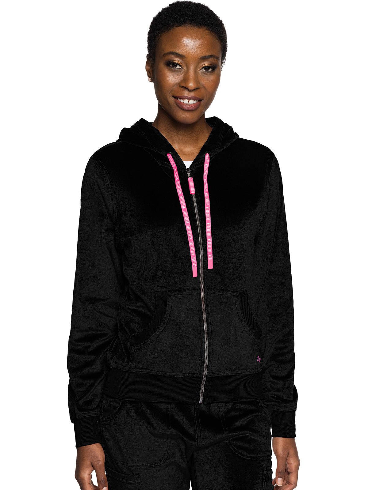 Designed for comfortable style on or off shift, this soft velour full zip hoodie has two roomy patch pockets for storage and a stylish embossed logo on the back. Tonal rib-knit pocket trim, cuffs, and hem. Pink logo zipper pull and pink logo hood drawstring add a fun touch of color. Look for the matching Velour Natural Rise Jogger (sold separately) to complete the outfit. Missy fit. Center back length: 24 1/2"