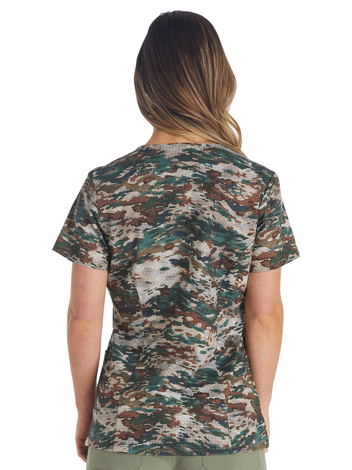 | This form-flattering V-neck print top features instrument loops and a snap tab at the wearer's right shoulder plus back princess seams. There are two front patch pockets, a pen pocket and a self instrument loop above the pen pocket for storage. It also includes side vents for comfort and ease of movement. Contemporary fit. Center back length: 26" |