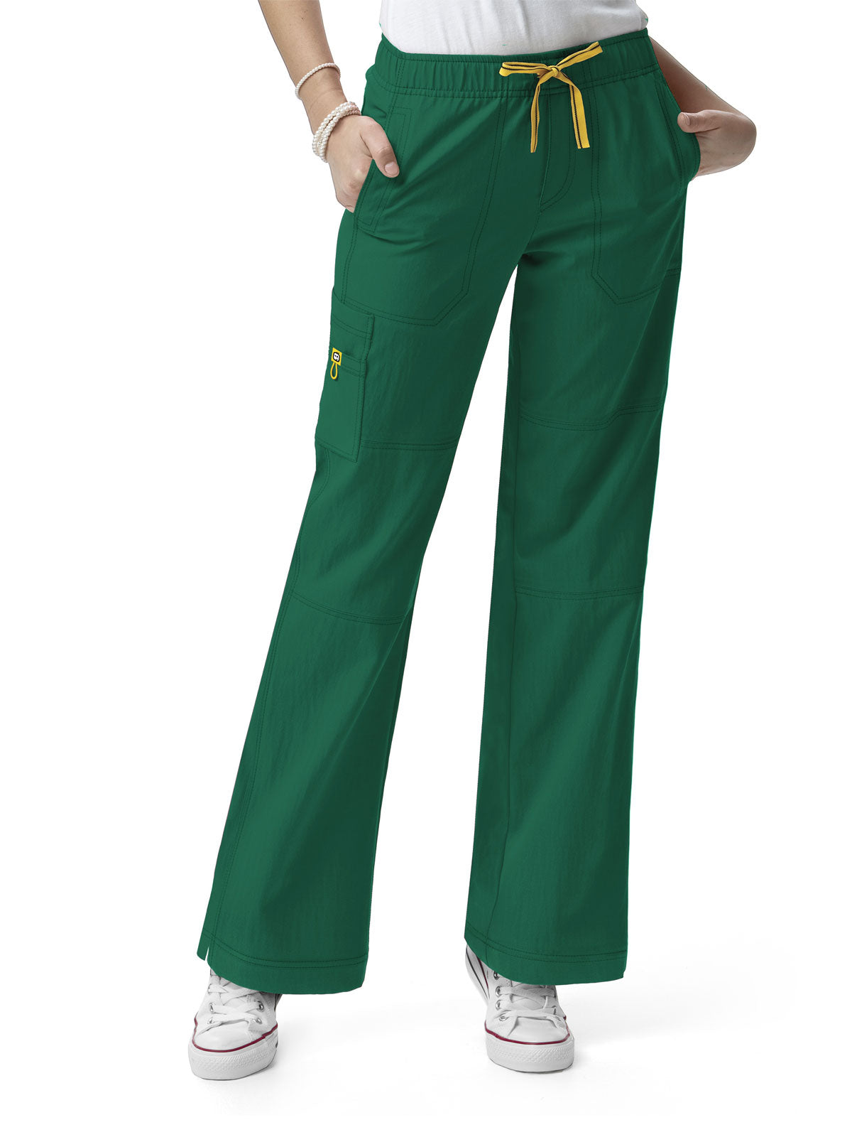 *Ladies boot-cut leg with full elastic waist *Two front multi-pockets and one back patch pocket *One cargo pocket and inner cell pocket *Triple needle stitching at front and cargo pockets *Contrast drawstring and bar-tacks *Side vents Boot-cut leg with full...