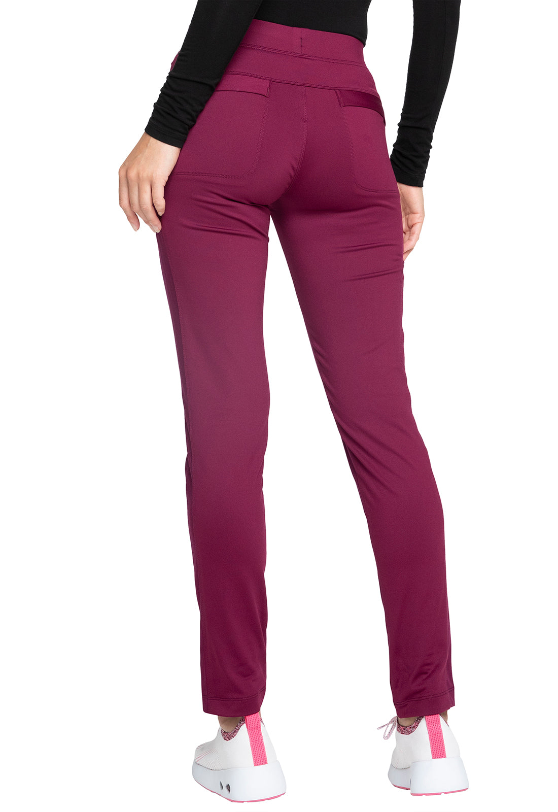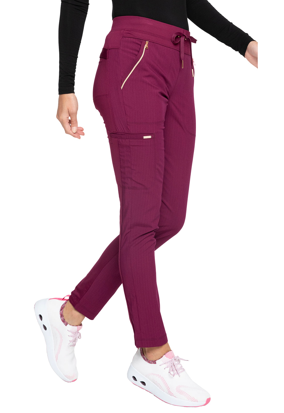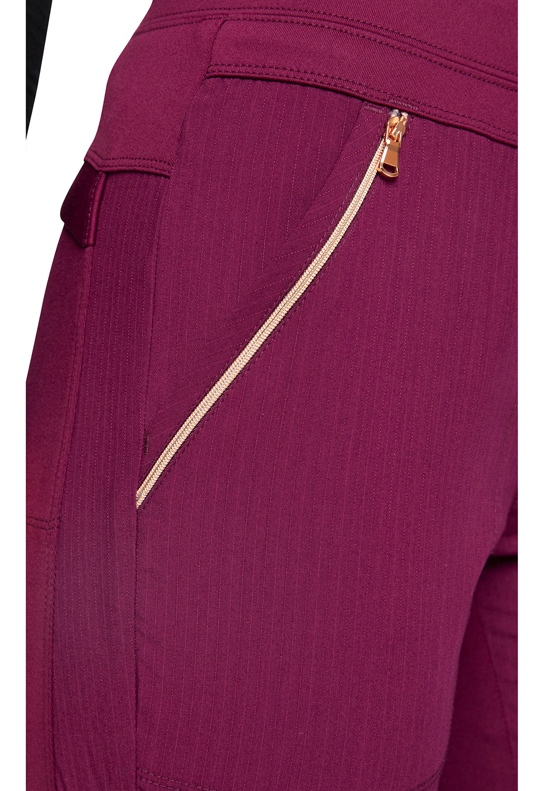 Pull-on styling, a figure-flattering cut, and a knit full back panel makes this mid rise pant a comfortable and elegant addition to your work wardrobe. Additional design details include a drawstring front, two angled front pockets, two angled zip pockets, a zip cargo pocket on the wearer's right, and back welt pockets. Rose gold hardware adds a sophisticated accent. Contemporary fit. Tapered leg, 10 1/2" opening. Inseam: 33". This elegant, linear texture stretch fabric and comfortable jersey knit is a chic pairing for stylish healthcare workers looking to make a STATEMENT.