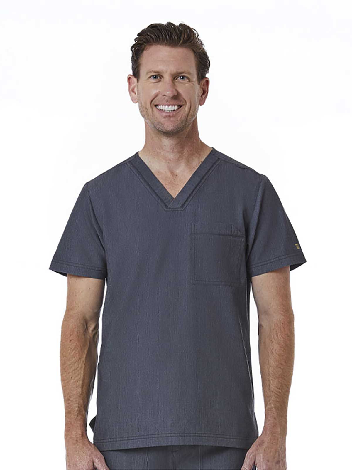 "*V-neck top *One chest pocket with a pen slot *Dyed-to-match functional bungee loop at the shoulder seam *Decorative double stitches by using thick thread *Front shoulder panel and back yoke for added style and shape *Side slits" Cross-over V-neckline Short...