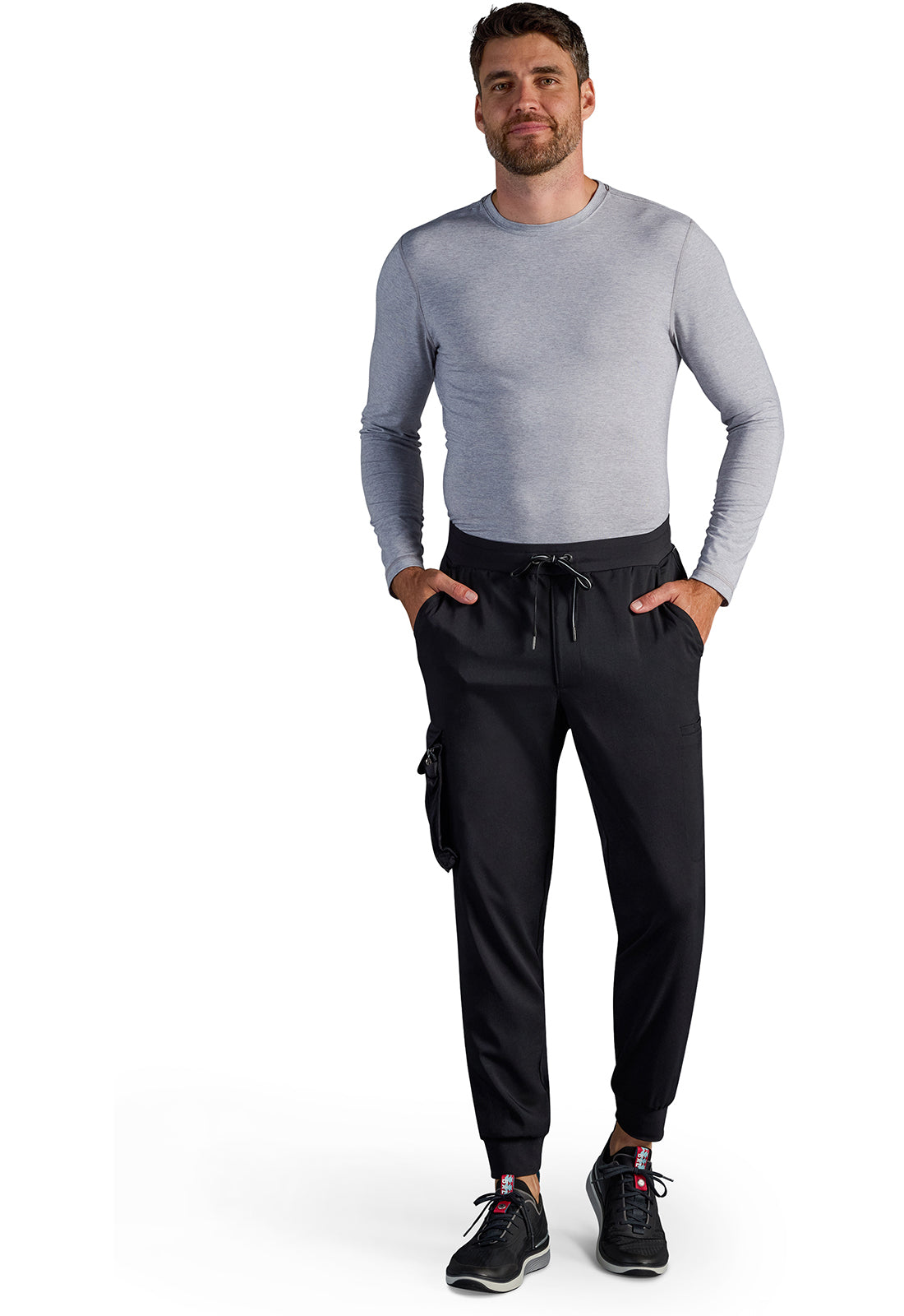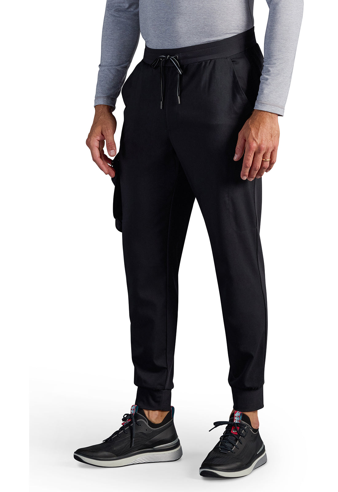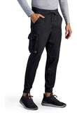 Soft woven scrub fabric on the front plus a stretchy full knit back equals one very stylish Men's scrub jogger. This pant also has a unique detail: a detachable pocket for on-the-go storage. The Healing Hands x Dr. Kwane Men's Vernon mid rise zip fly scrub jogger features an elasticized waistband with a drawstring for adjustability and security. There are seven pockets for organized storage: two front slant pockets, two welt cargo pockets, and two back welt pockets. Detachable pocket on wearer's right side converts into a bag. A back yoke provides a better fit. The mixed media design continues with dyed-to-match knit back panels and knit cuffs. Modern fit. Tapered jogger leg, 10" leg opening. Inseam: 29"