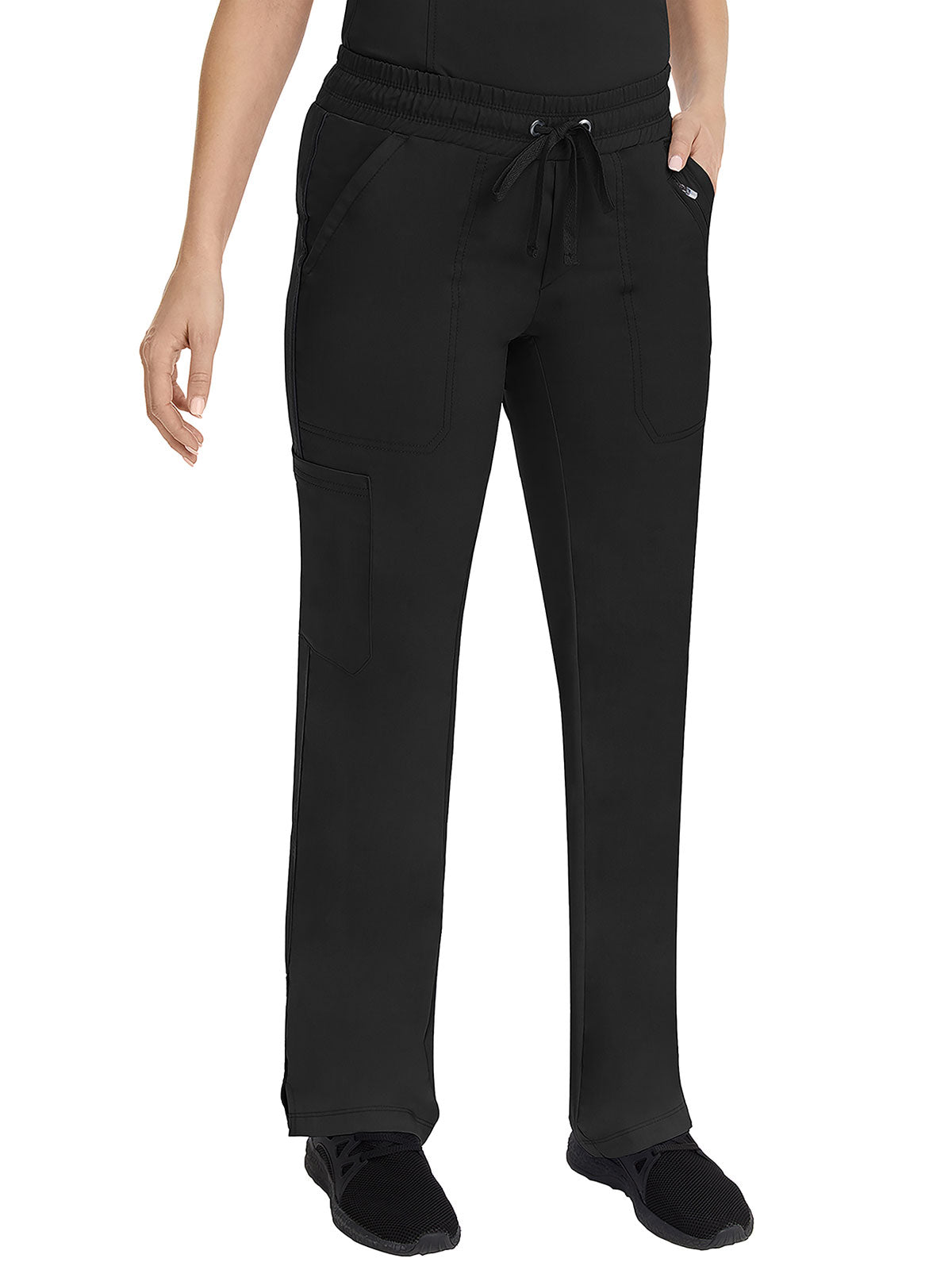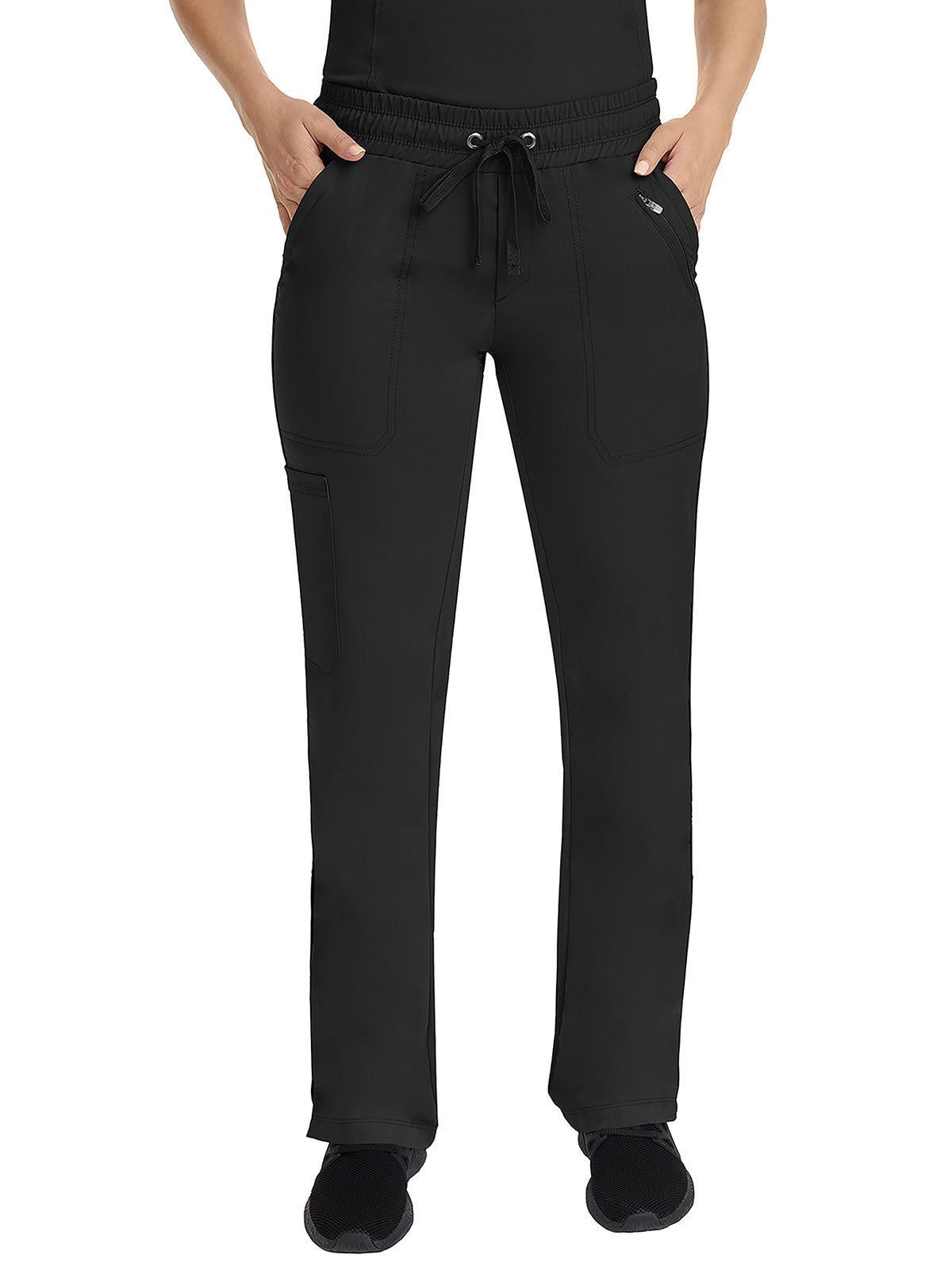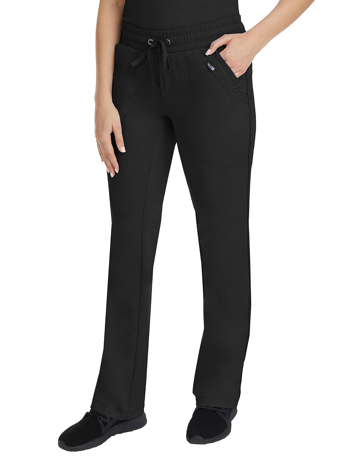 Soft woven scrub fabric on the front plus stretchy knit panels on the back equals one very wearable scrub pant. The Healing Hands x Dr. Kwane Veronica mid rise pant features a mock fly, flat front waistband with a drawstring...