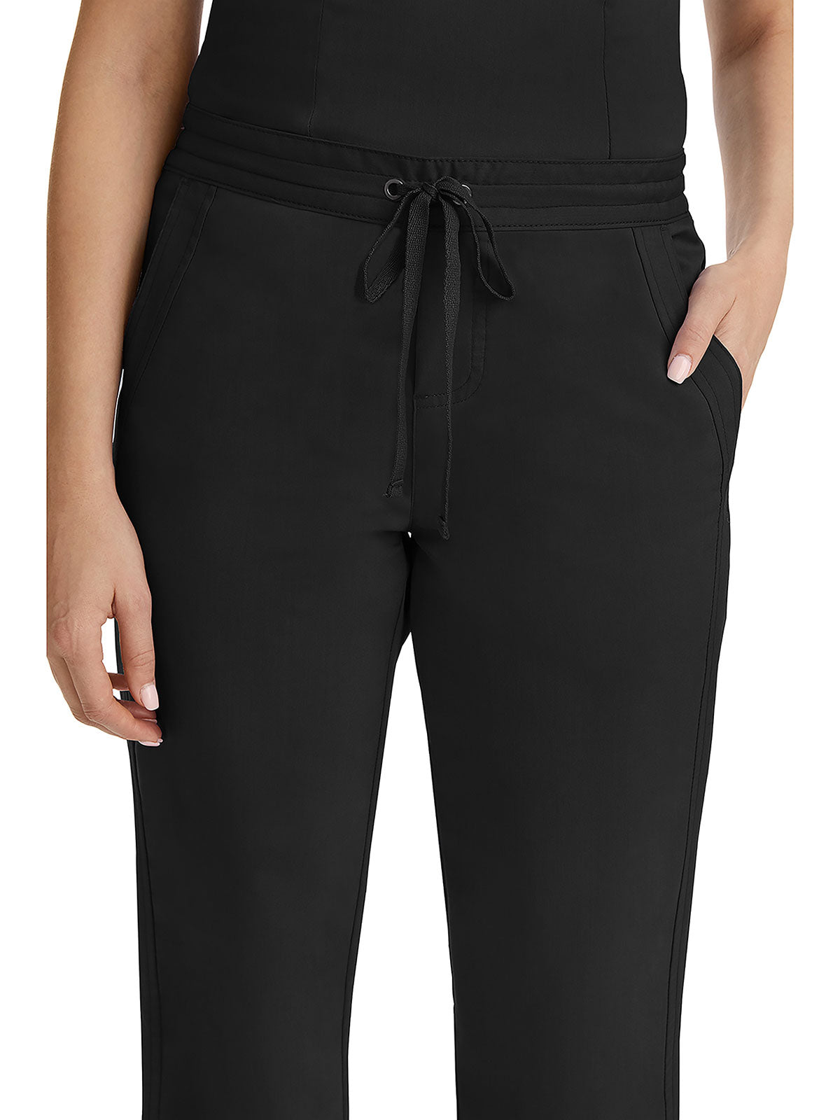 Soft woven scrub fabric on the front plus a stretchy full knit back equals one very fashionable scrub jogger. This pant also has a unique detail: a detachable pocket for on-the-go storage. The Healing Hands x Dr. Kwane Vanessa mid...
