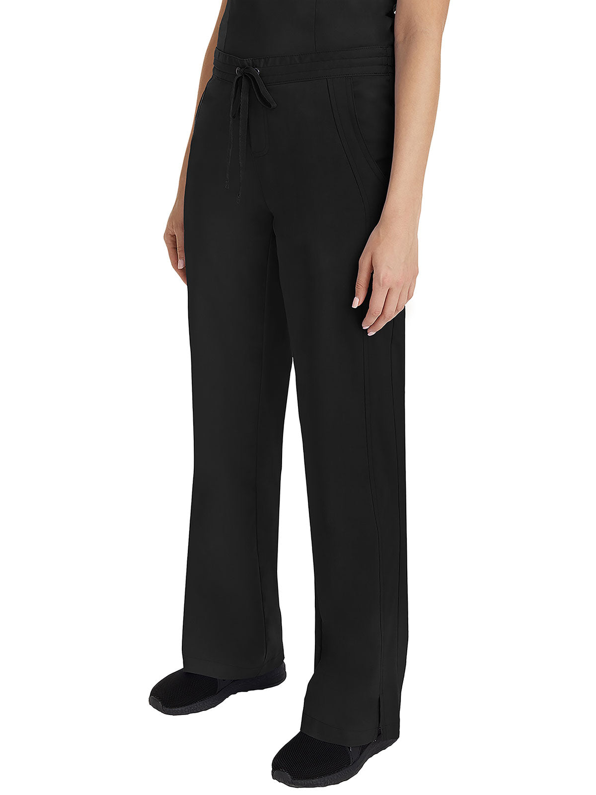 Soft woven scrub fabric on the front plus stretchy knit panels on the back equals one very wearable scrub pant. The Healing Hands x Dr. Kwane Veronica mid rise pant features a mock fly, flat front waistband with a drawstring...