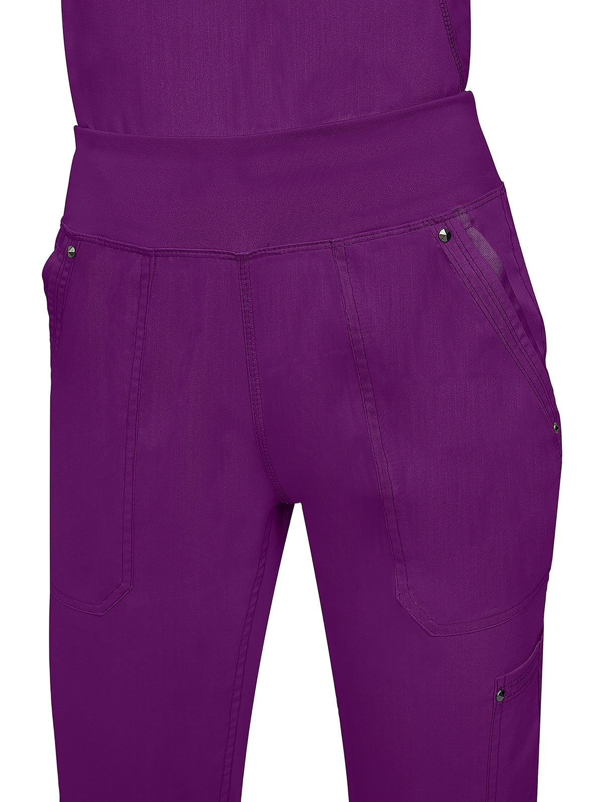 Soft woven scrub fabric on the front plus a stretchy full knit back equals one very fashionable scrub jogger. This pant also has a unique detail: a detachable pocket for on-the-go storage. The Healing Hands x Dr. Kwane Vanessa mid...