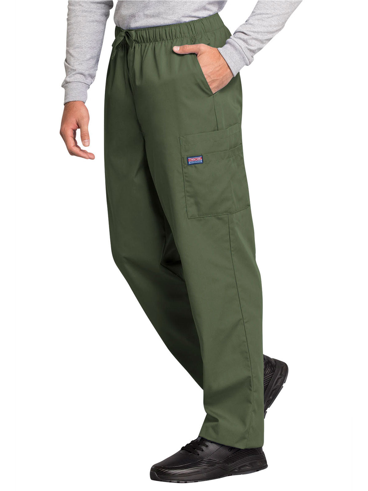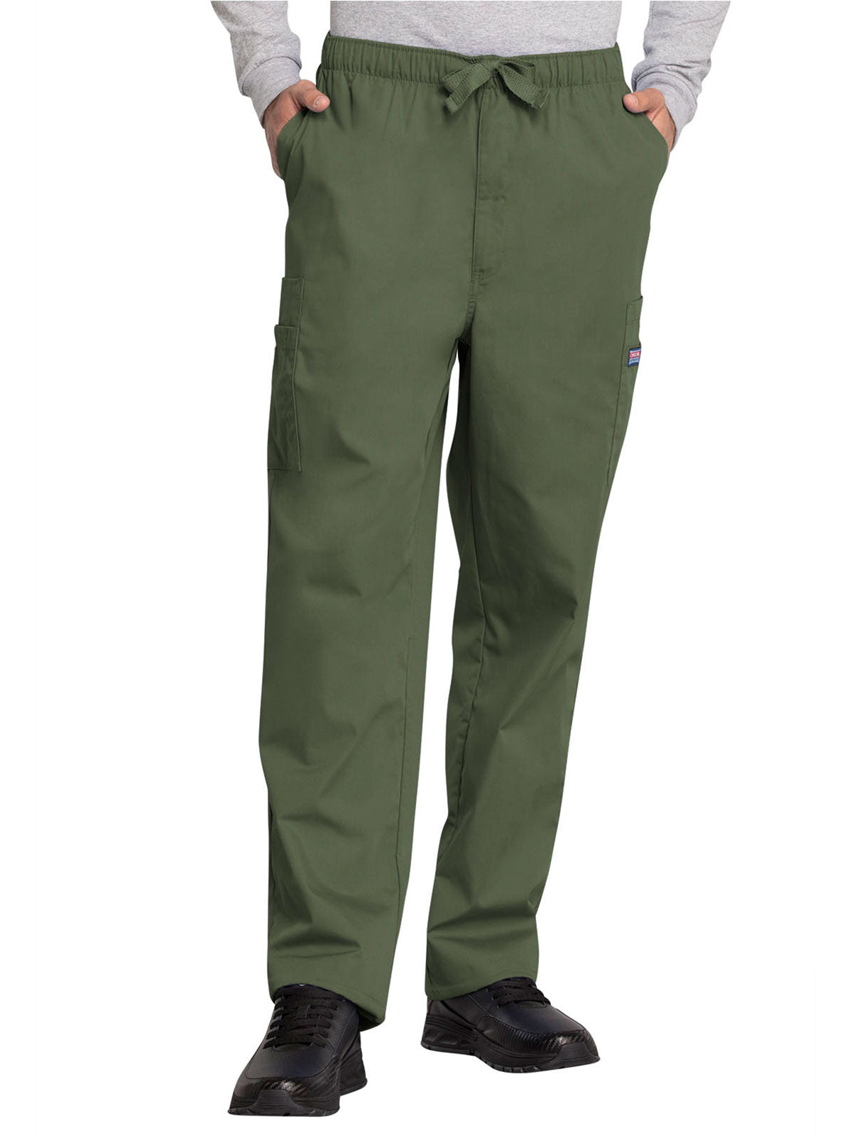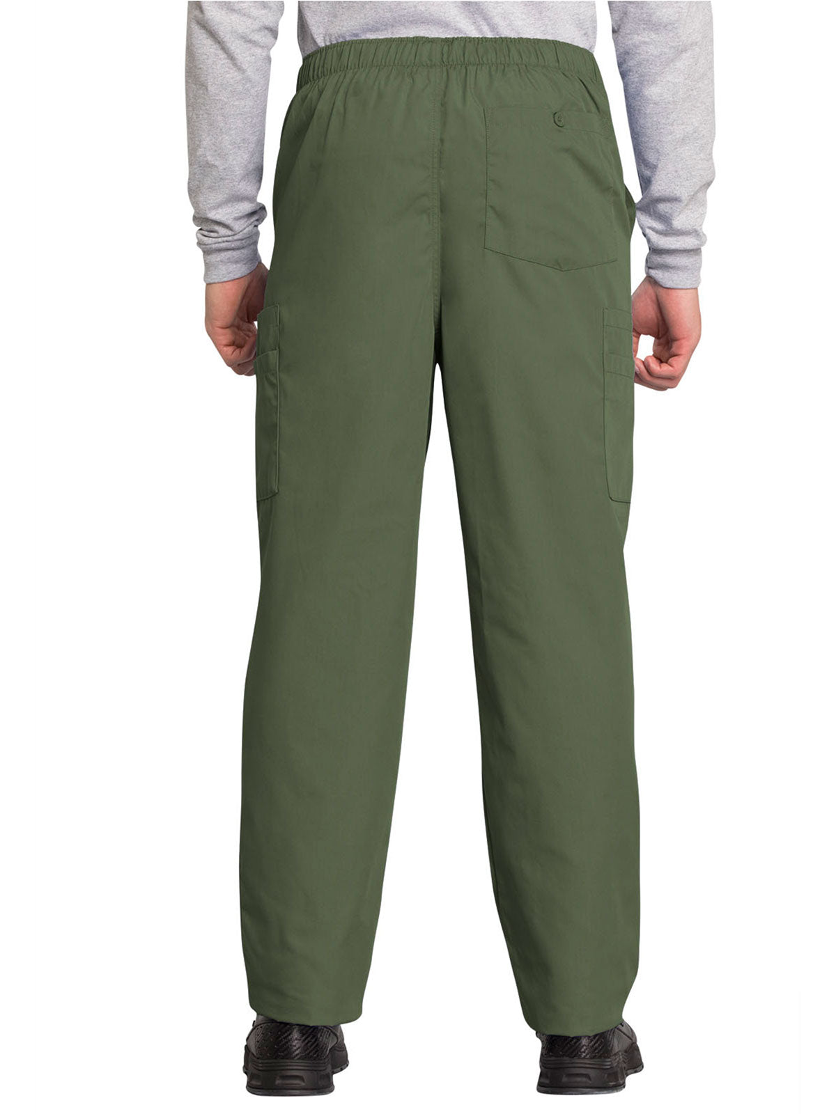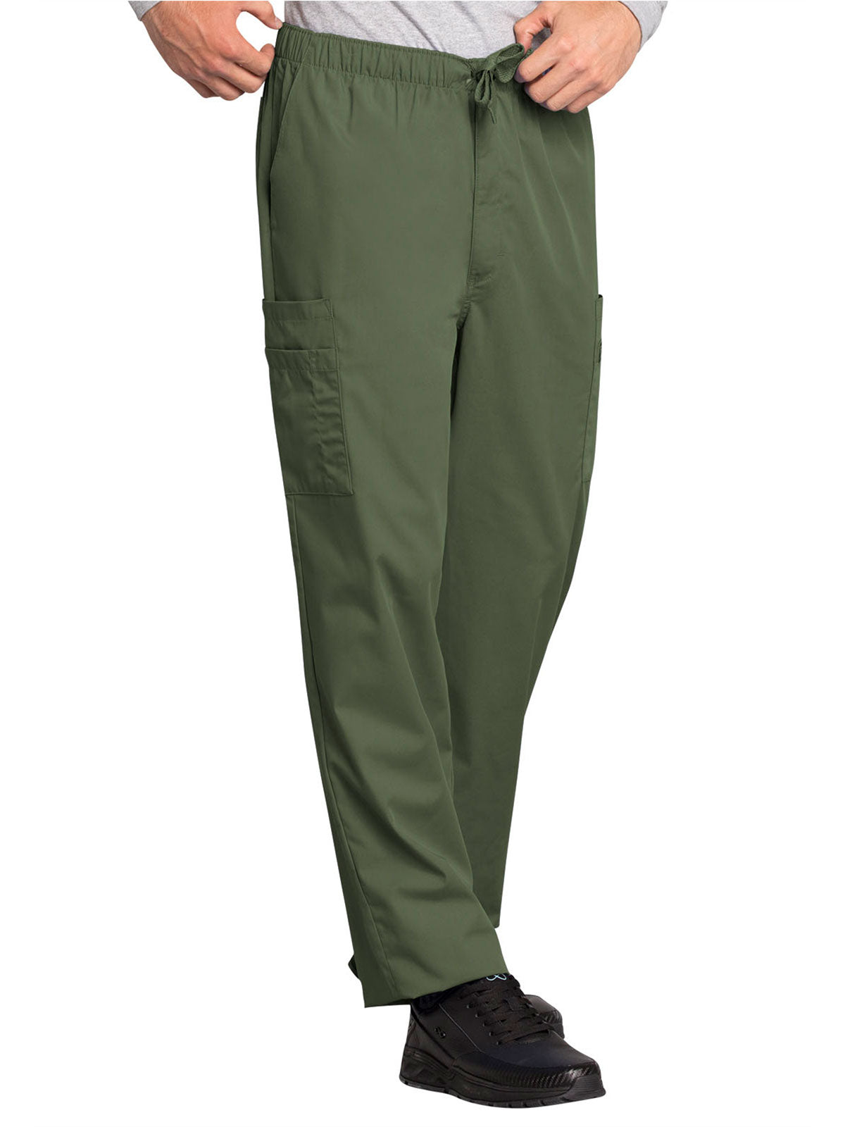 A Men's Traditional fit natural rise, elastic waist pant with webbed drawstring also features a functional zip fly, four side cargo pockets, front angled pockets, and a back patch pocket.