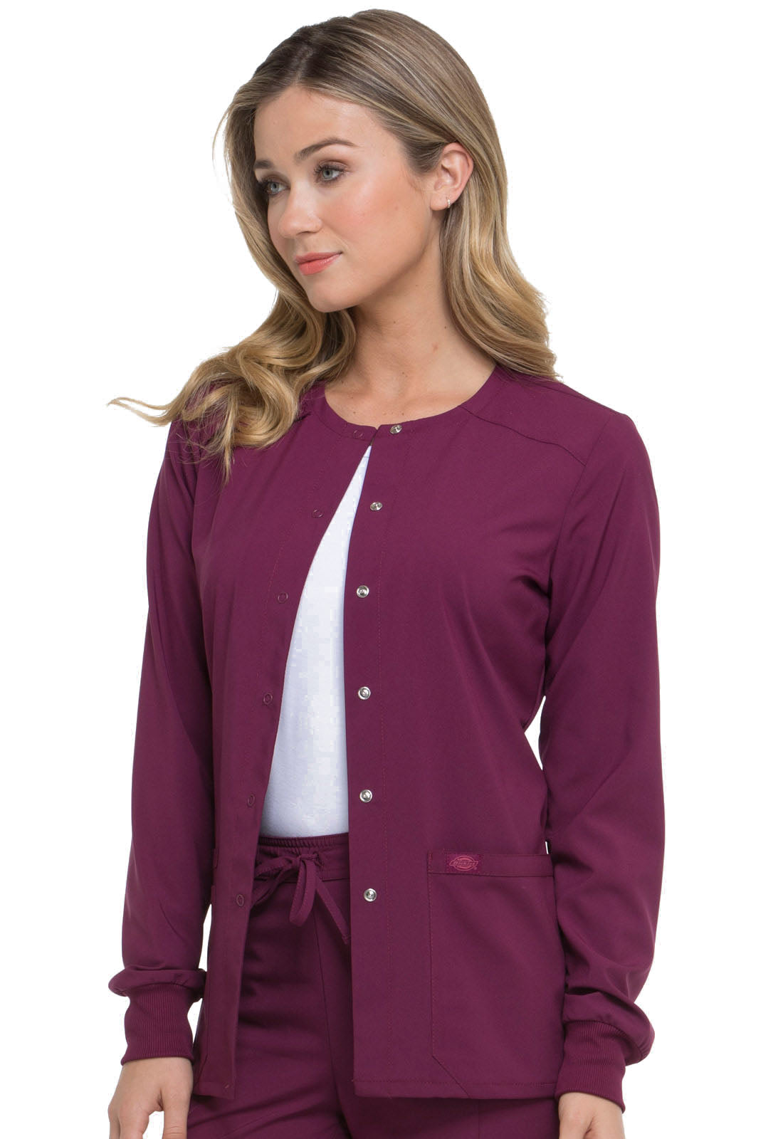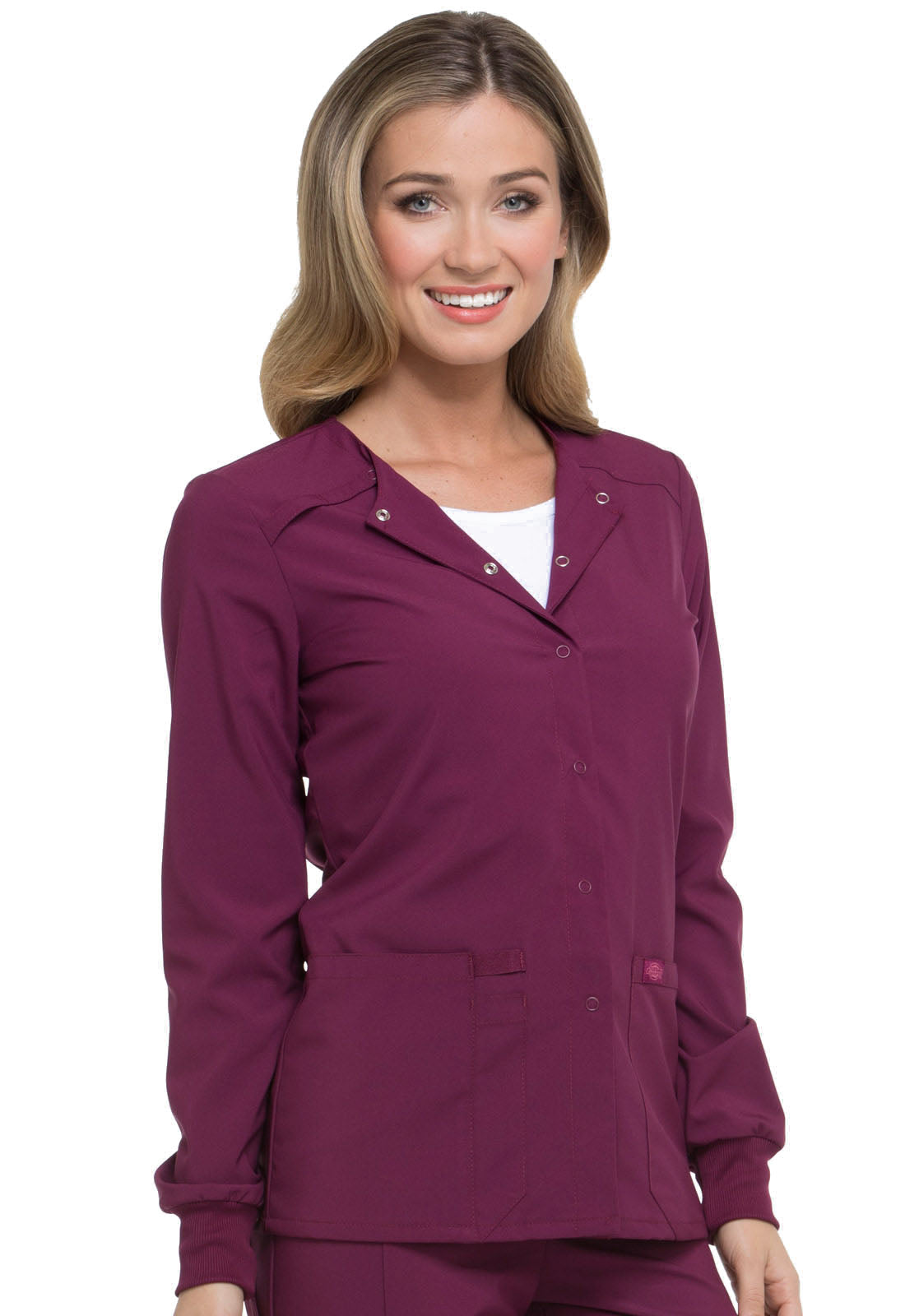This Eds Essentials By Dickies Women's Snap Front Warm-up Jacket Features Two Patch Pockets And A Pen Slot. Also featured is a signature toned wound label, utility twist tape, and a signature logo twist tape at the neck.