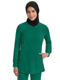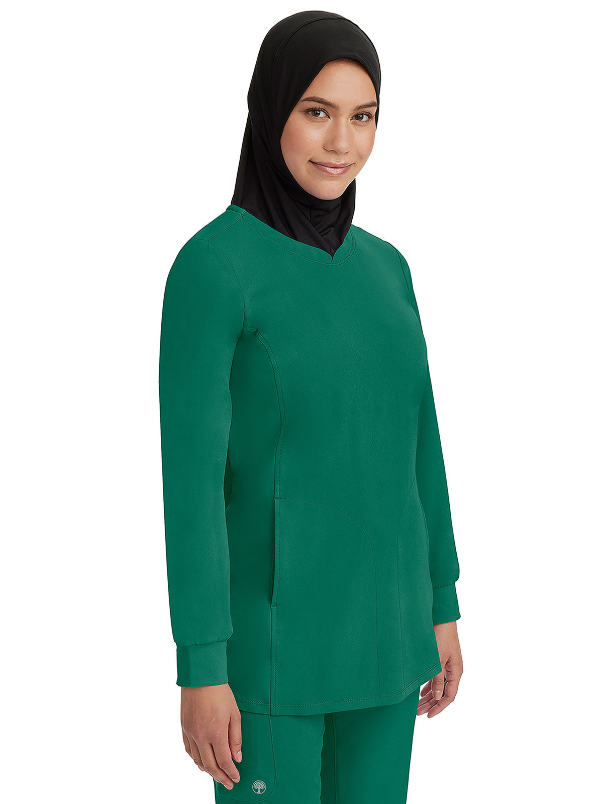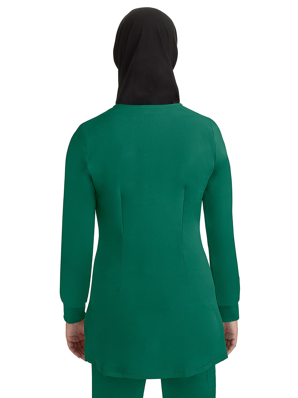 The Fatima Top features long sleeves, a high V-neck, and extends to a tunic length.