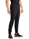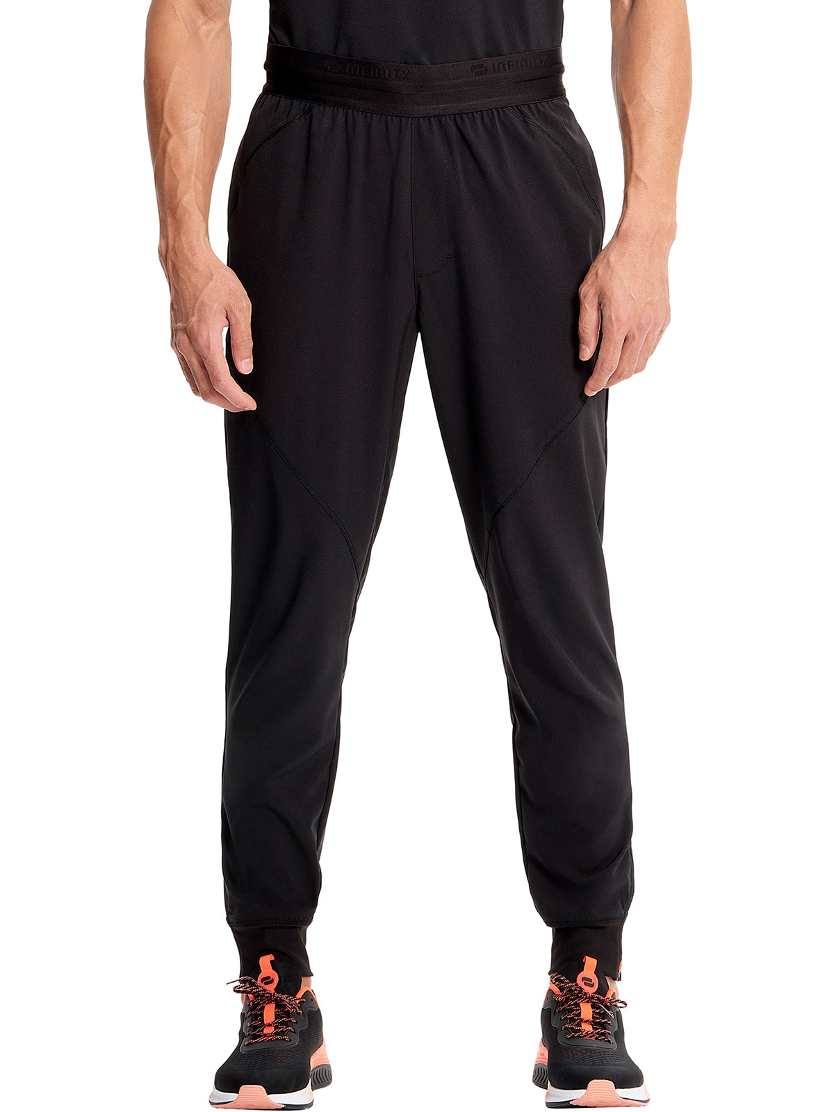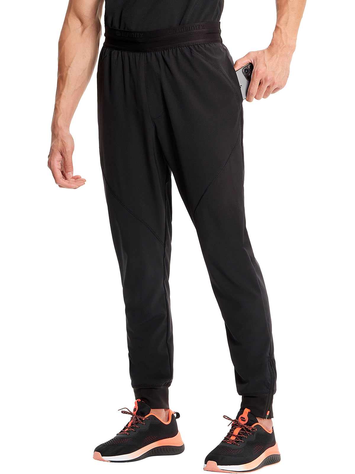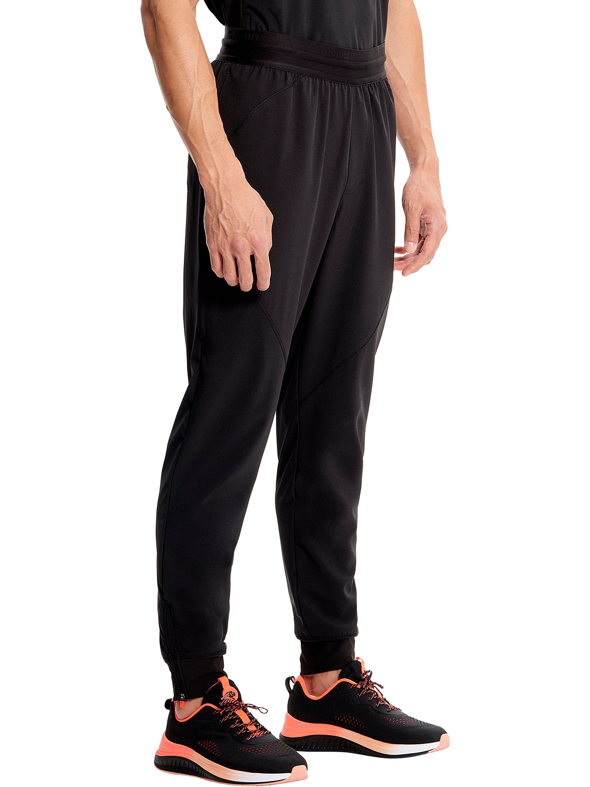 This Men's fit pull-on jogger has a logo elastic waistband with an interior drawstring and a curved back yoke seam. There are four pockets for organized storage: two in-seam side pockets, one zipper cargo pocket with contrast mesh pocket bag on the wearer's right side, and one in-seam back pocket. Other features include stylized front seams, zipper vents at hem for an expandable leg opening, and dyed-to-match rib-knit cuffs. Zipper vents feature sporty signature contrast mesh gusset. Contrast colored soft zipper pulls for easy grip. Tapered leg, 10" opening. Inseam: 30"