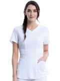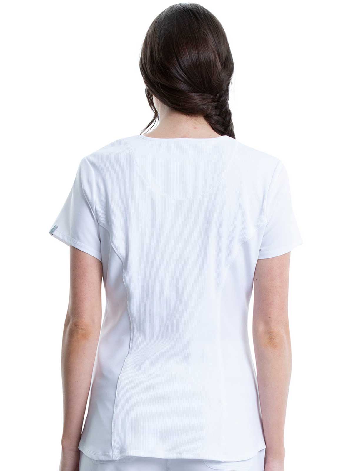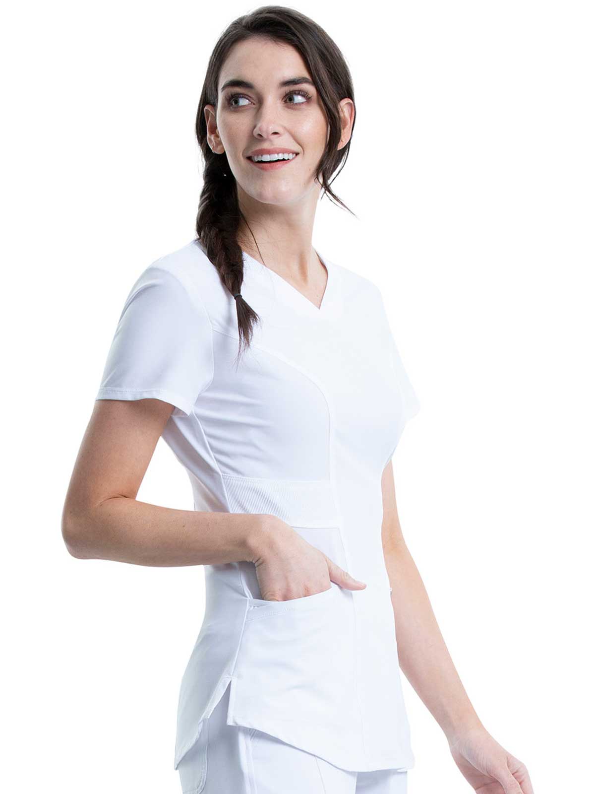 A Contemporary fit V-neck top features rib-knit waist insets and a stretchy rib-knit panel at the center back for a slenderizing effect, as well as for extra movement and comfort. Also featured are two patch pockets, an interior pocket, pencil stitch, bungee ID badge loop, front and back princess seams, a shirttail hem, side vents and coverstitch detail throughout. Center back length: 26?. The comfortable stretch poplin fabric and super stretchy rib-knit is the perfect combo for healthcare professionals.
