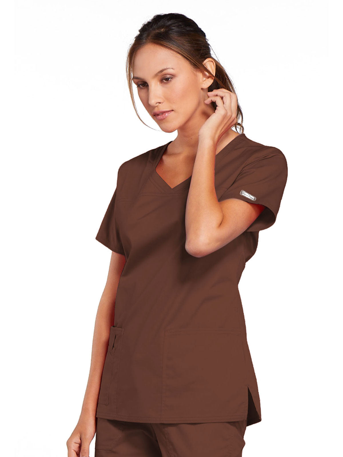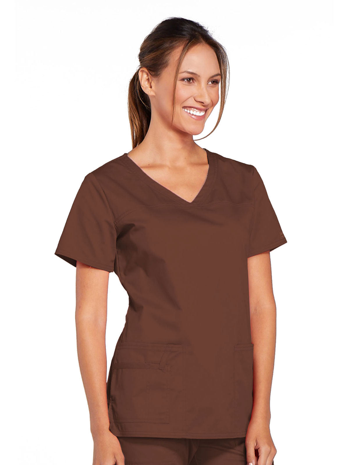 A Modern Classic Cherokee workwear core fit V-neck top features crossover front yokes and patch pockets. The right side pocket has a sectional pocket and I.D. loop. A back yoke, back princess seams, and side vents complete the picture. Center back length: 27".